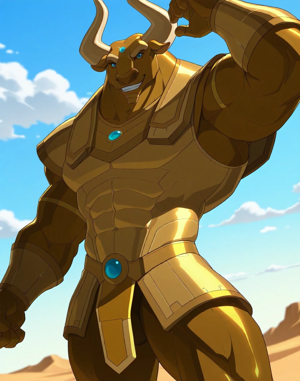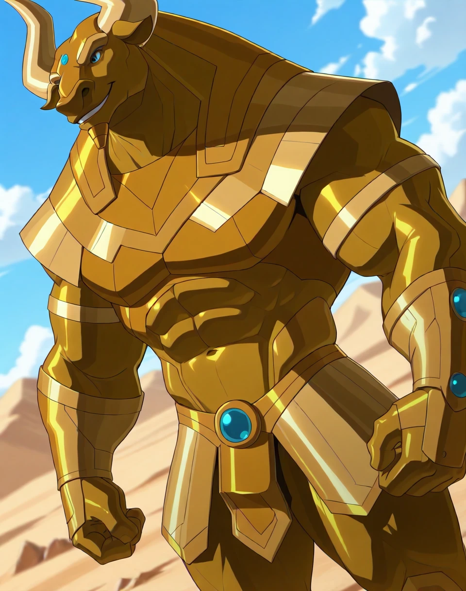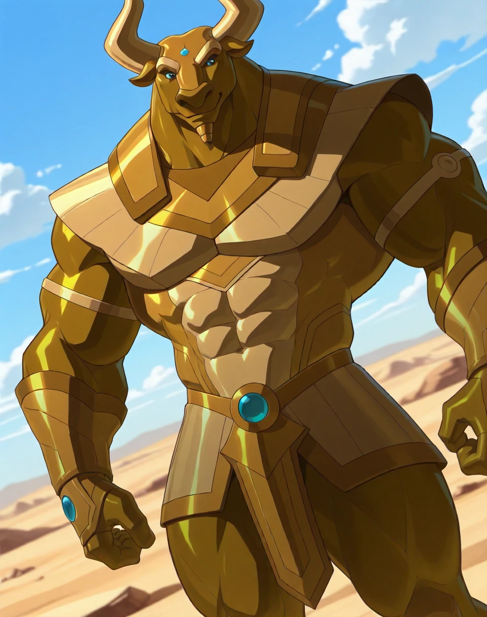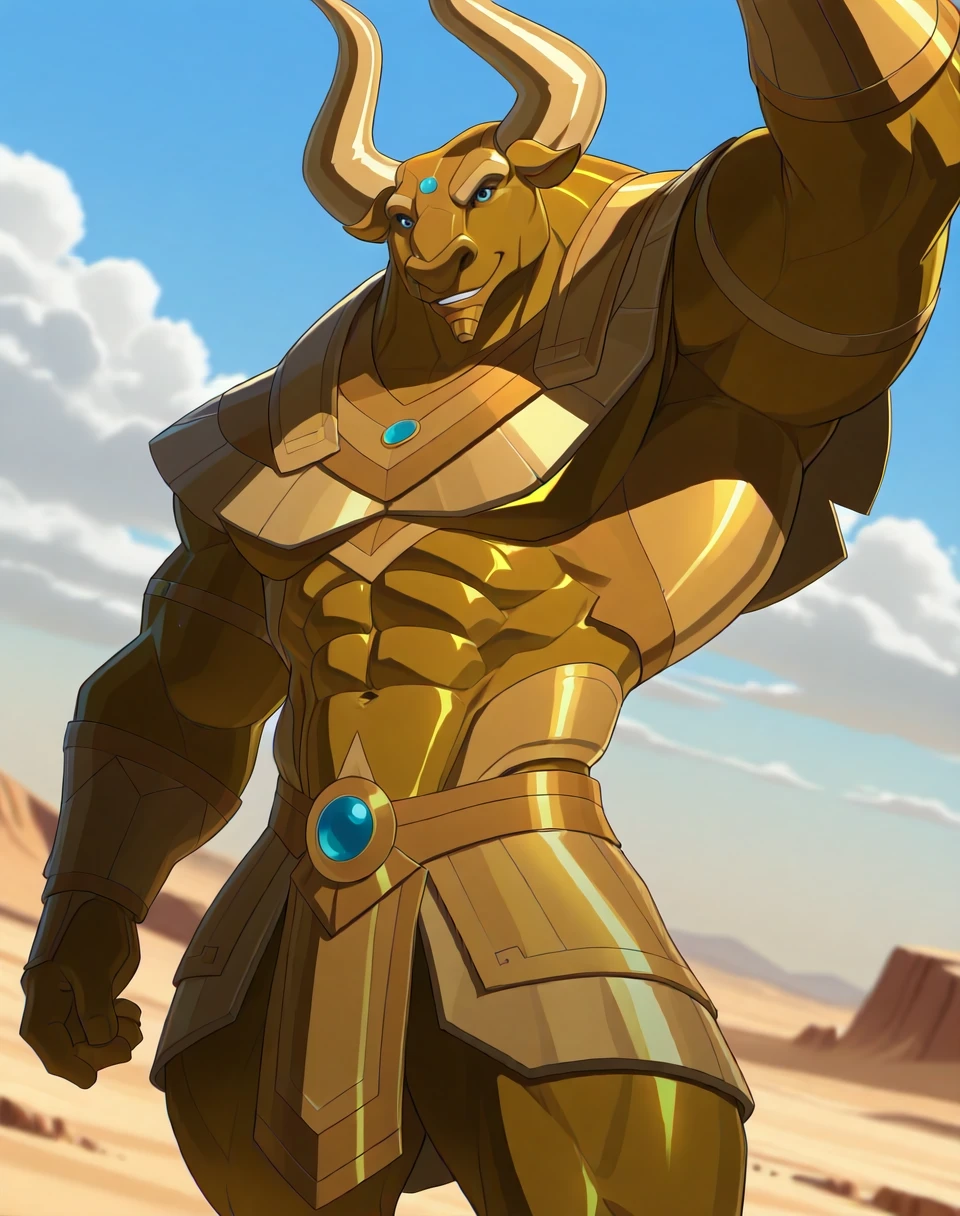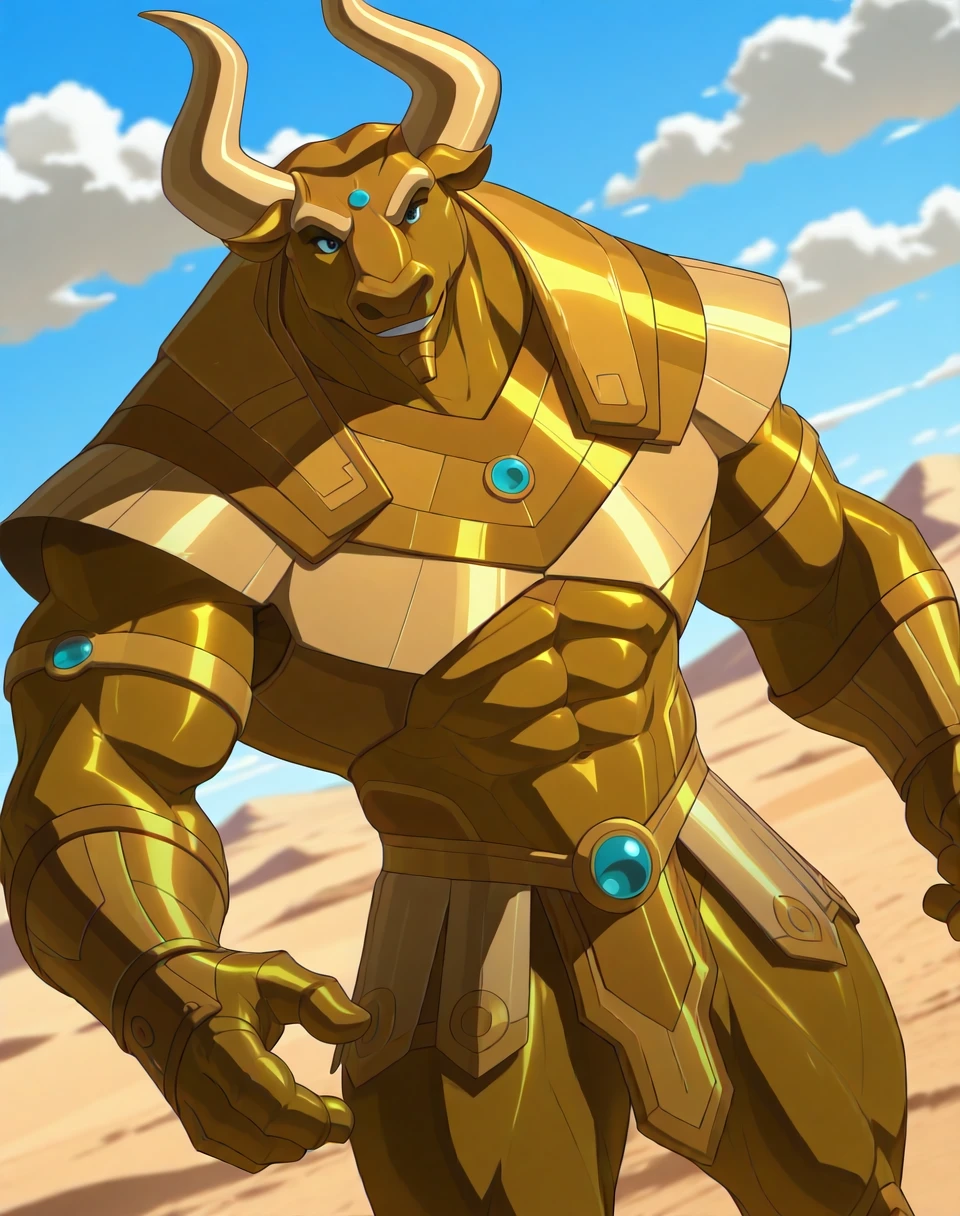 This is an Illustrious lora for the character Apis from the cartoon Egyxos. Apis in the show is a hero on the side of the golden army. The character is based on the scared Apis bull in the ancient Egyptian religion. This version of him is one where he is wearing his golden armor while in his powered up form.
