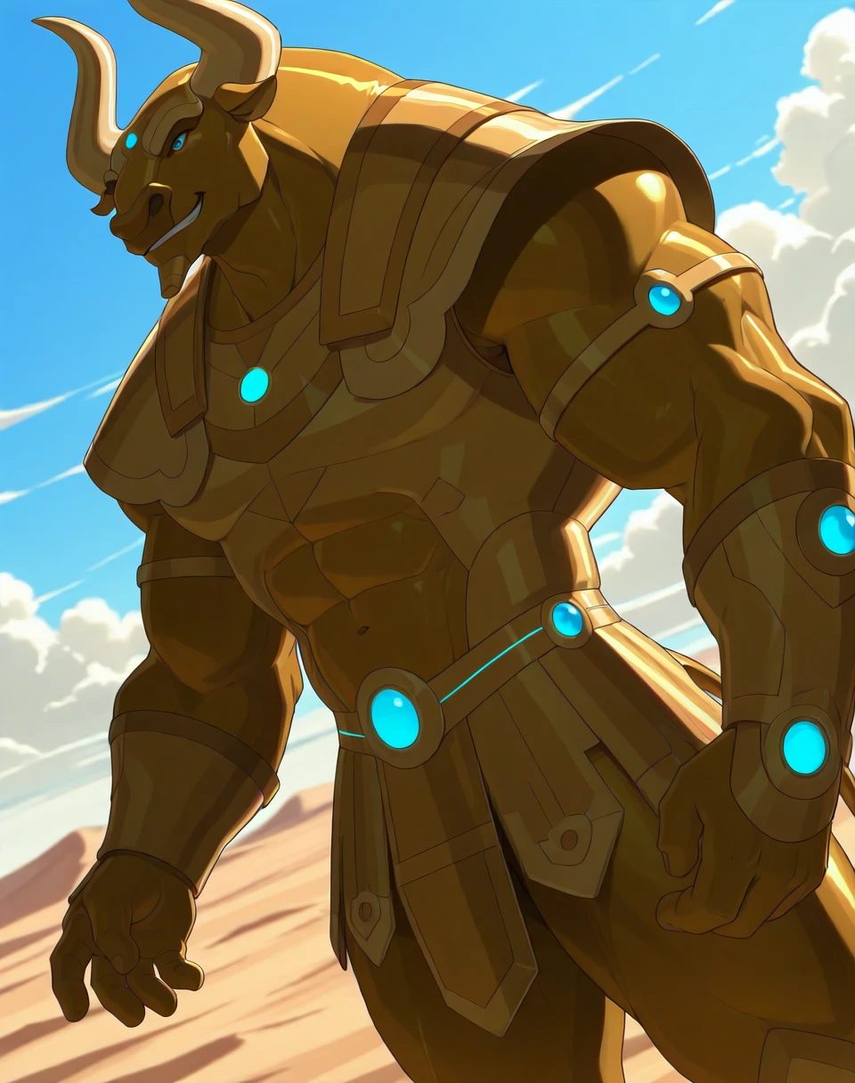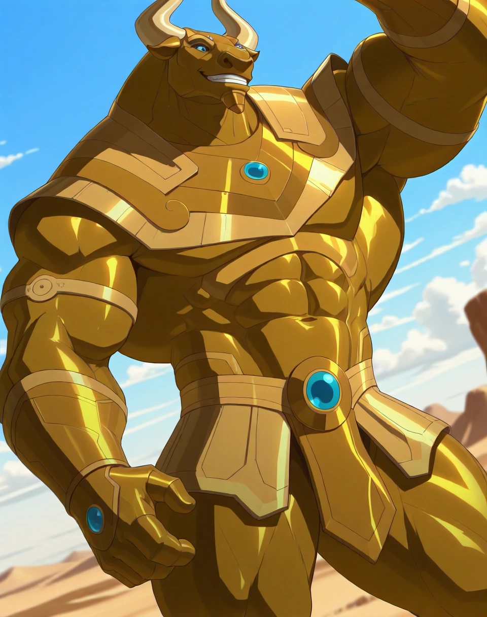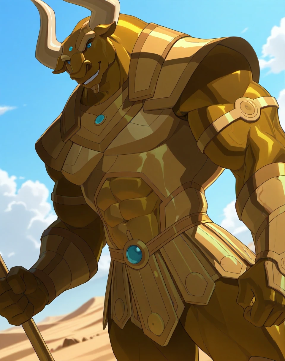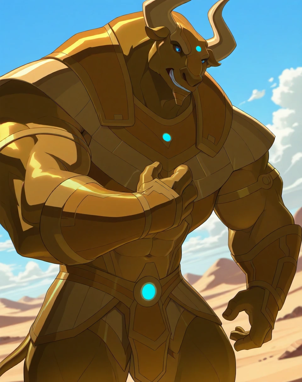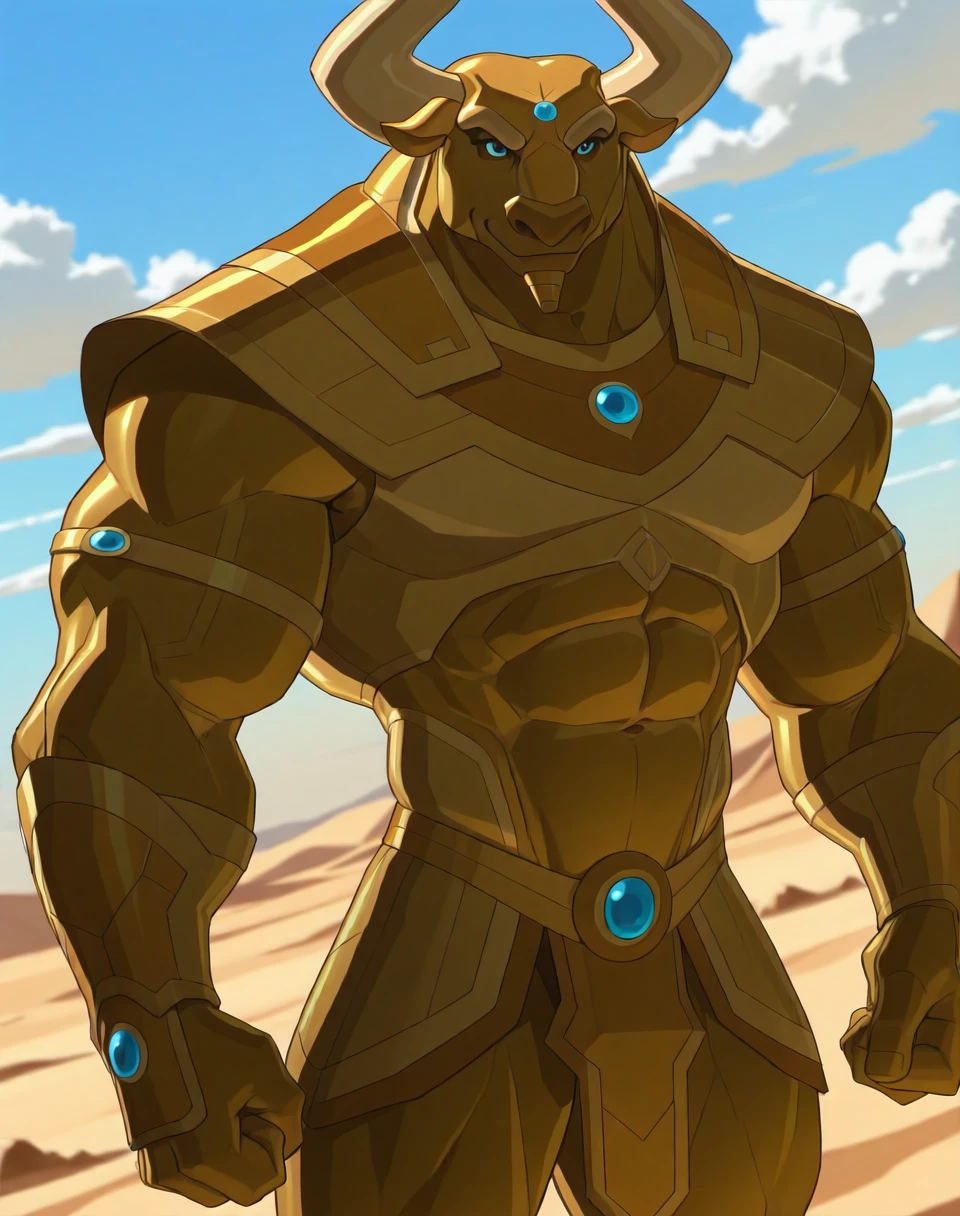 This is an Illustrious lora for the character Apis from the cartoon Egyxos. Apis in the show is a hero on the side of the golden army. The character is based on the scared Apis bull in the ancient Egyptian religion. This version of him is one where he is wearing his golden armor while in his powered up form.