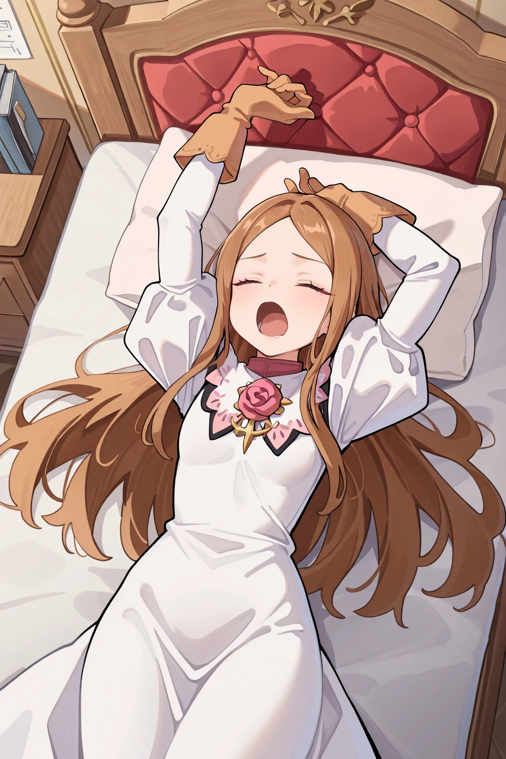 RosaDef, brown hair, long hair, pink eyes, white witch hat, white dress, red belt, juliet sleeves, white boots