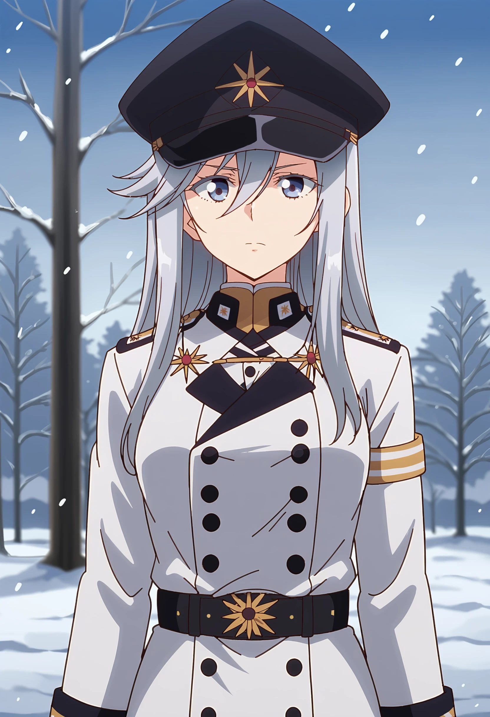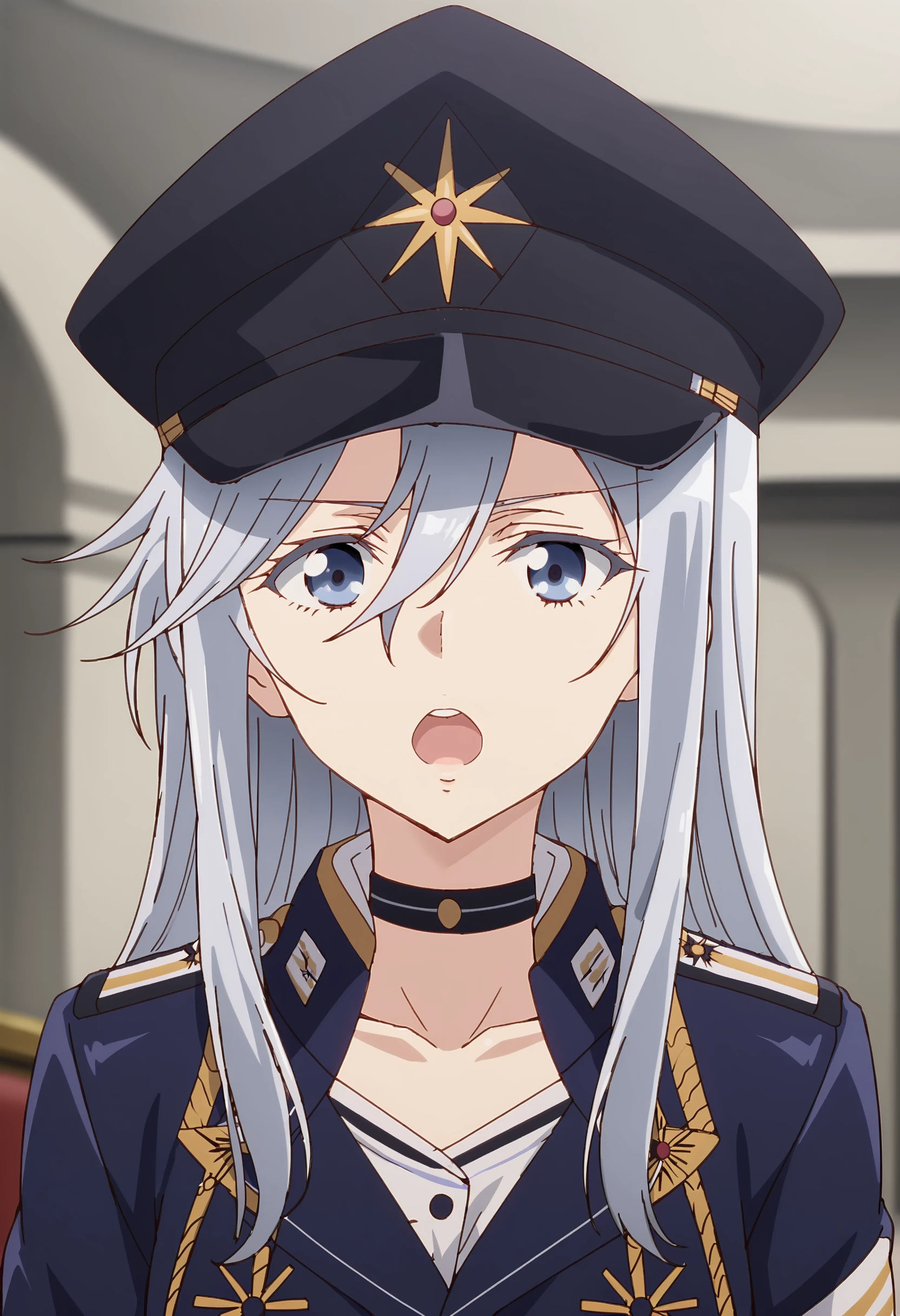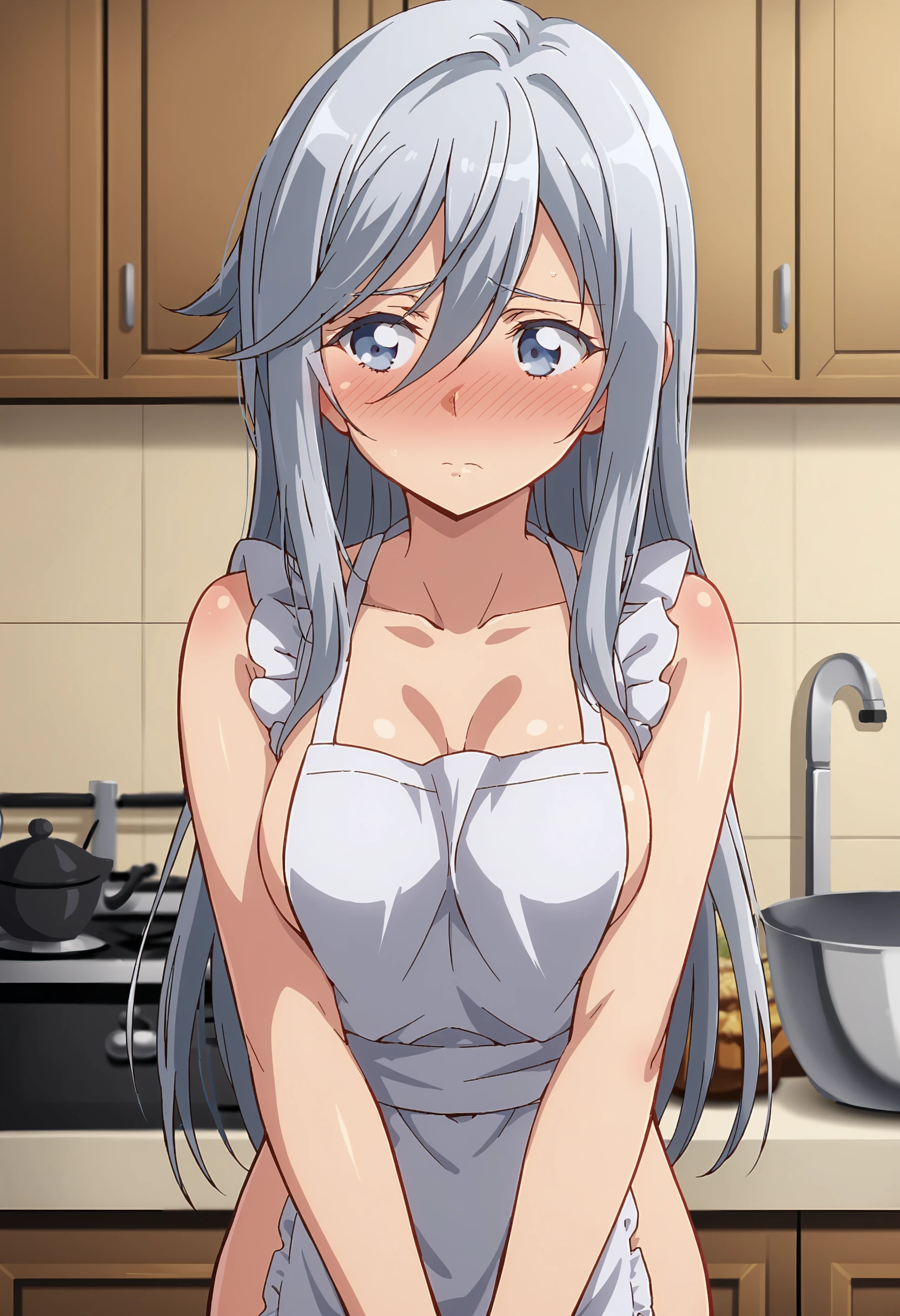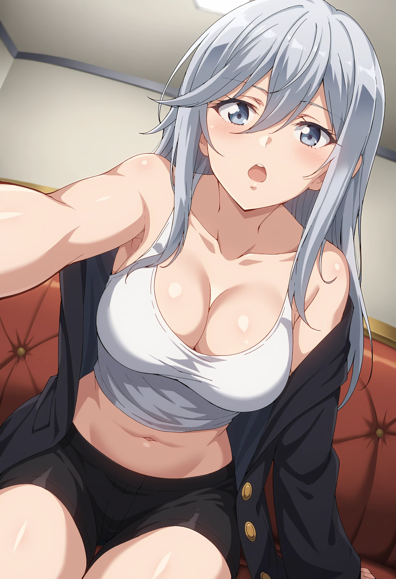 Tags for her look: 1girl, solo, large hair, grey hair, blue eyes, hair between eyes, medium breasts,