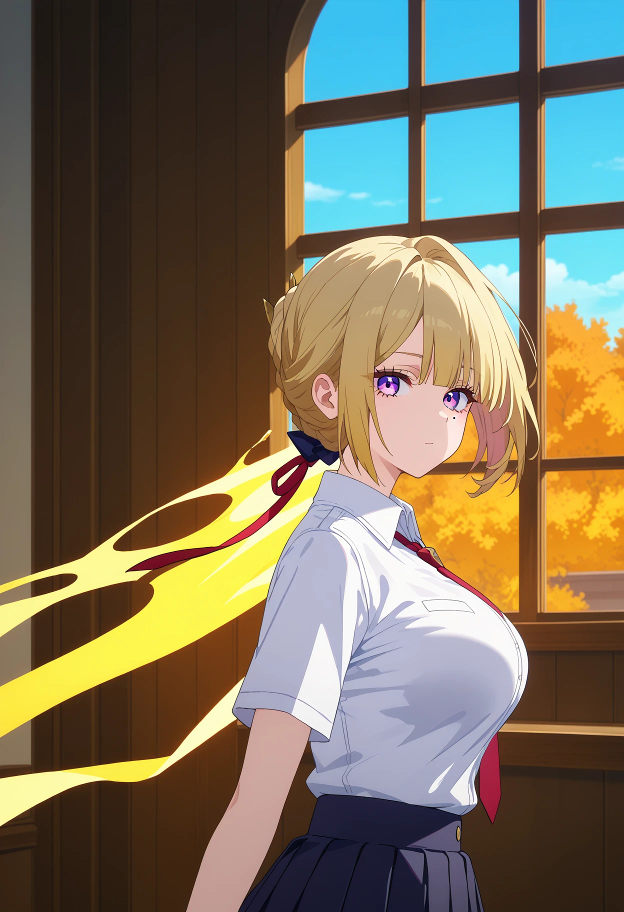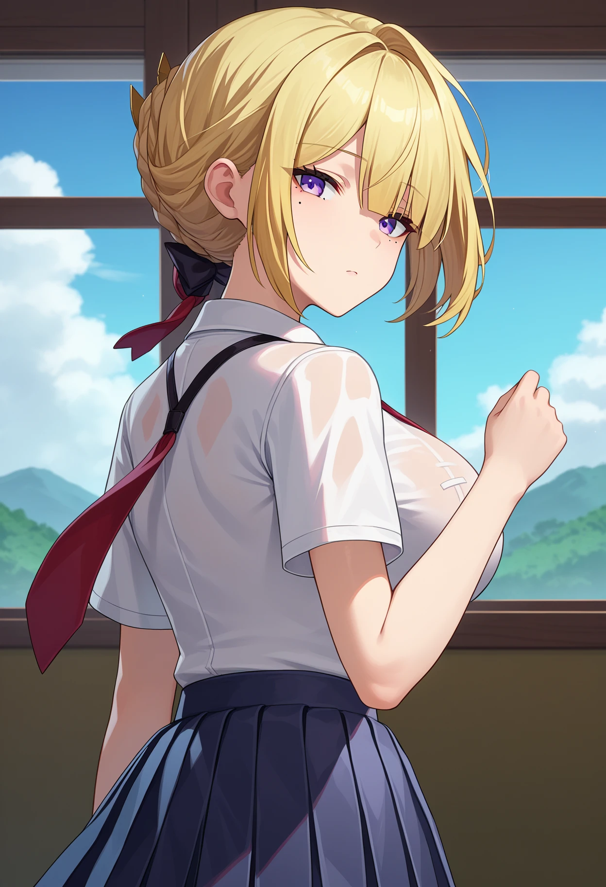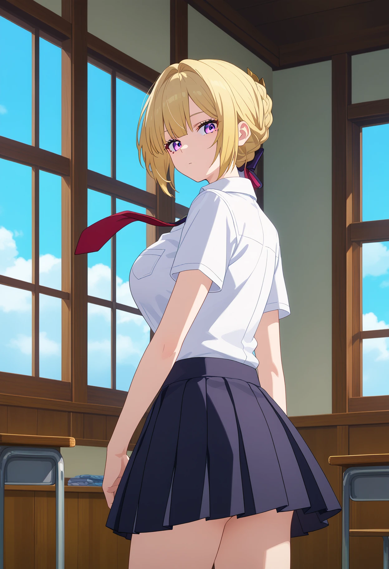 shievedef, purple eyes, short hair, blonde hair, braid, sidelocks, hair bun, mole under eye, large breasts, chest harness, jewelry, earrings, black choker, necktie, black gloves, white shirt, sleeveless, collared shirt, sleeveless shirt, black jacket, jacket on shoulders, bodysuit, black pants, tight clothes, tight pants, leather pants, high heels,