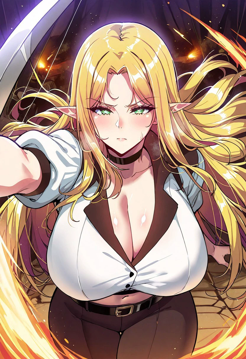 (( <lora:requre_(isekai_fall_of_the_hero):1> , requre_(isekai_fall_of_the_hero), thin waist, wide hips, beautiful skin, piercing green eyes, clear eyes, bright pupils, beautiful eyes, beautiful blonde hair, beautiful long hair, huge and shaggy breasts, pointy elf ears, natural beauty, extraordinary beautiful elf woman, attractive elf woman, super sexy elf woman, lustful body, sexy elf woman with seductive obscene body, sensual body, voluptuous body, sexy elf beauty, no piercings, no piercing, ))