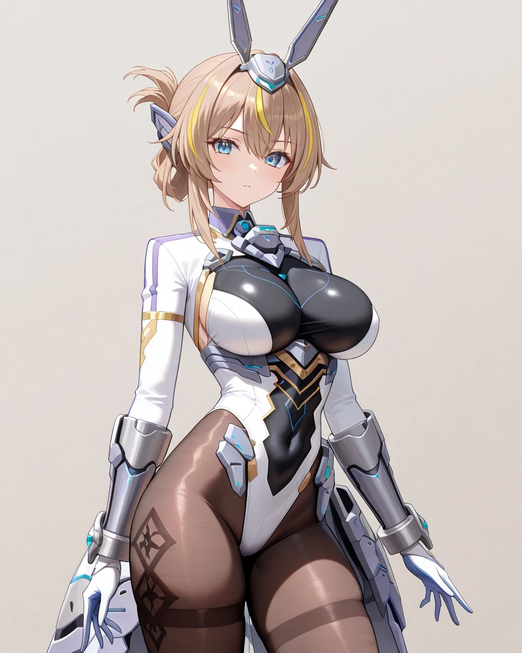 longinusbeta starward, folded hair, yellow streaked hair, leotard, headgear, pantyhose, mechanical legs, ————