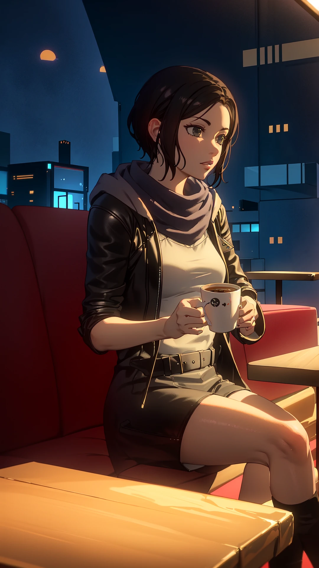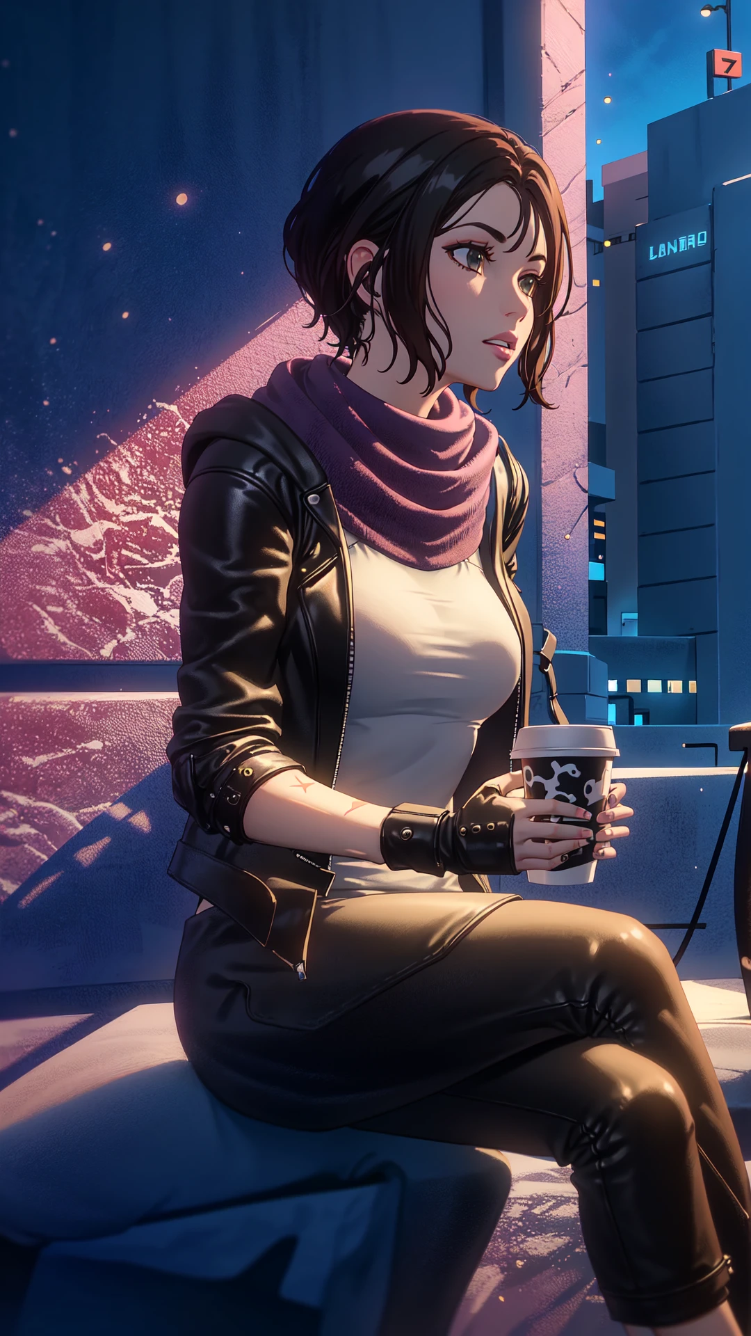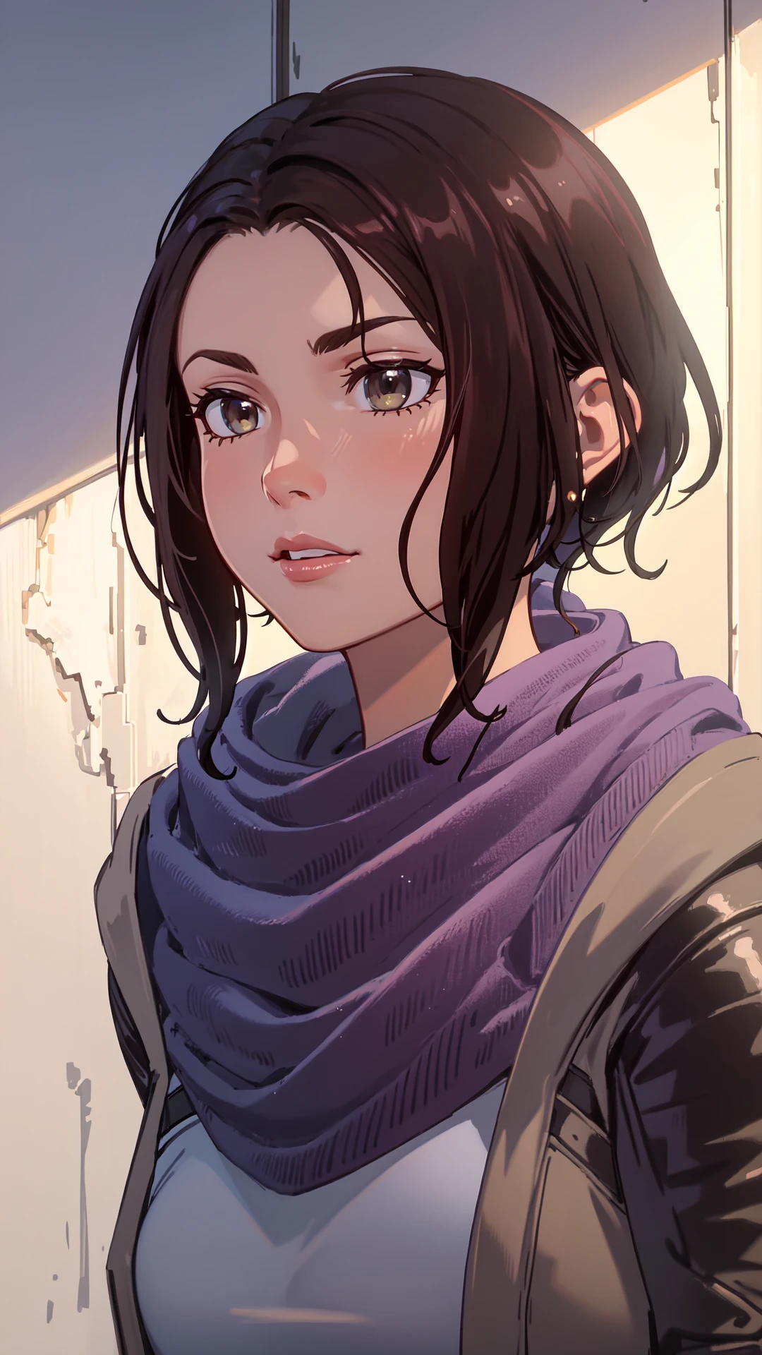 1woman, black short hair, hazel eyes, gray coat, purple scarf, white top, fingerless gloves, belt, black pants, black boots,