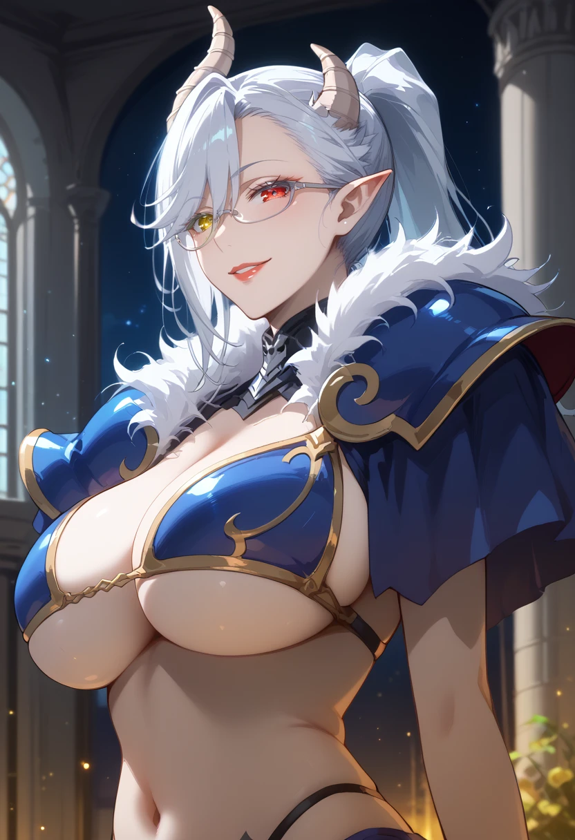 demon girl, pointy ears, demon horns, heterochromia, yellow eyes, red eyes, white hair, high ponytail