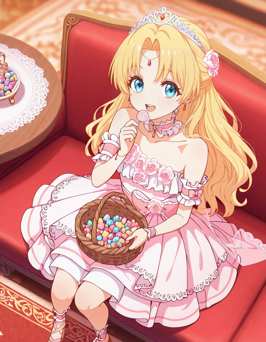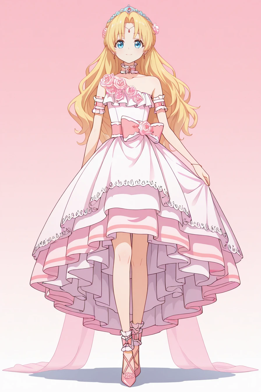 tiara, flower hair ornament, forehead jewel, earrings, frilled choker, bow choker, jewel, ???? shoulders, frills, sleeveless dress, flower ornament, armband, wrist strap, bow, layered dress, ankle garter, pink high heels