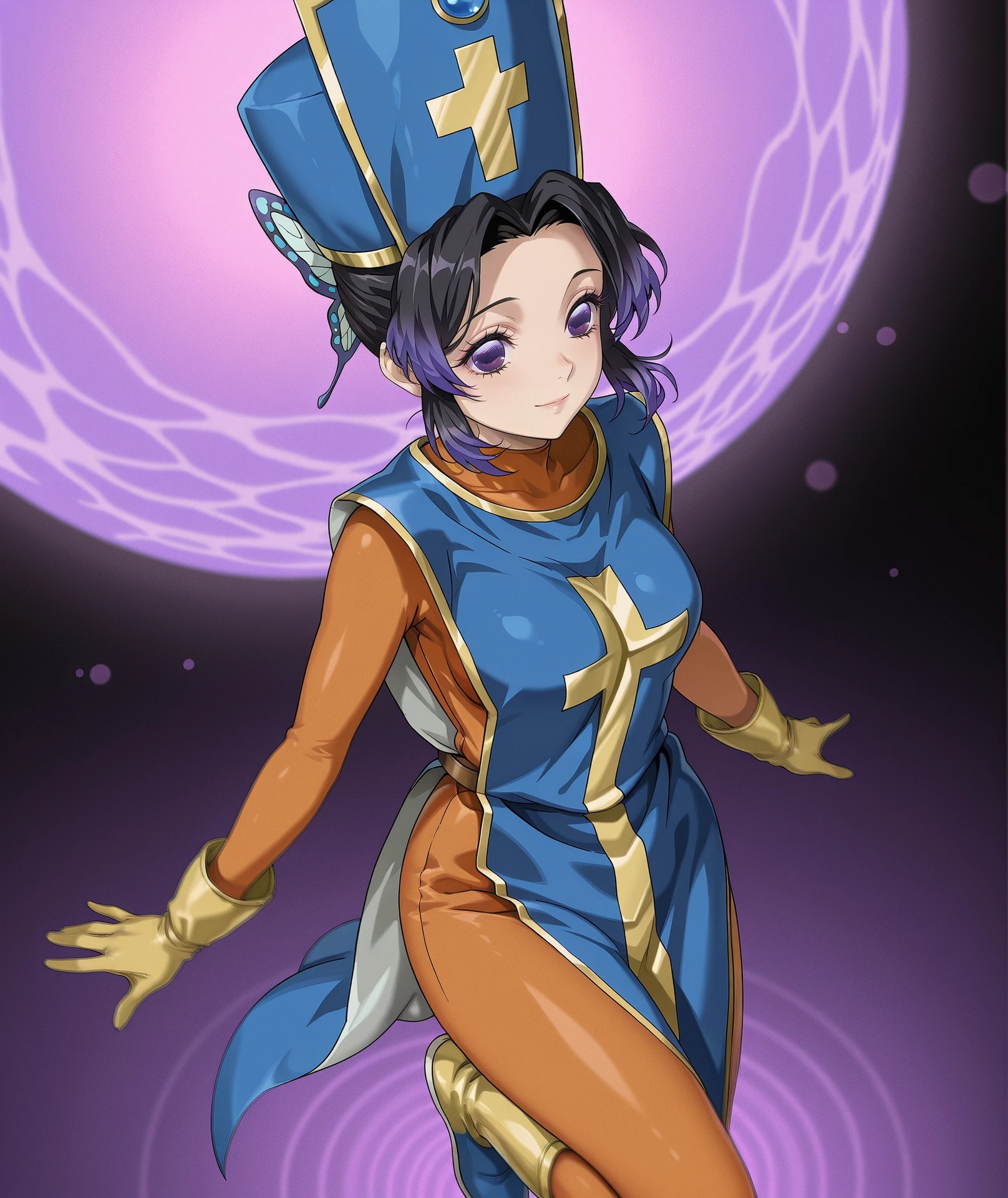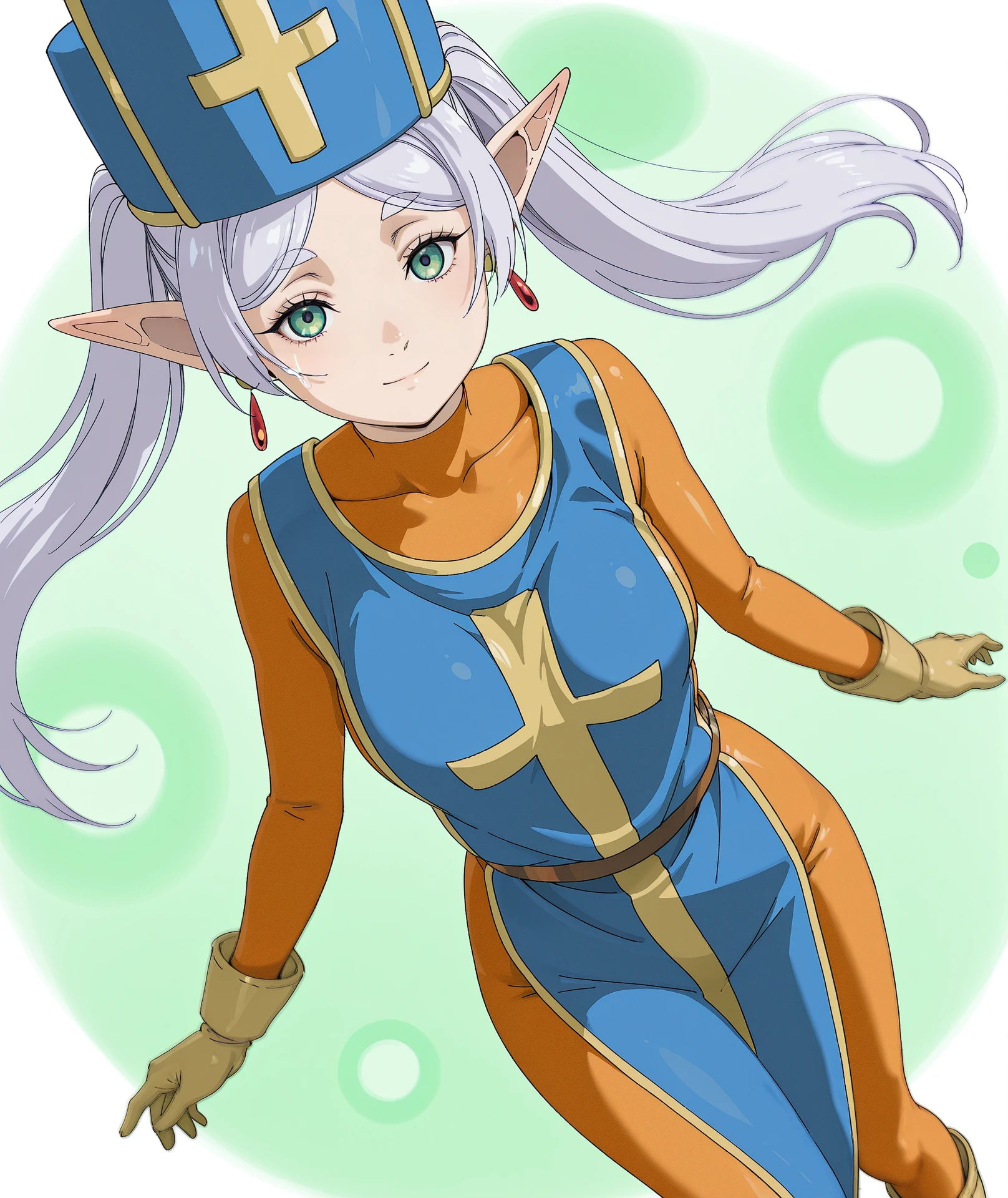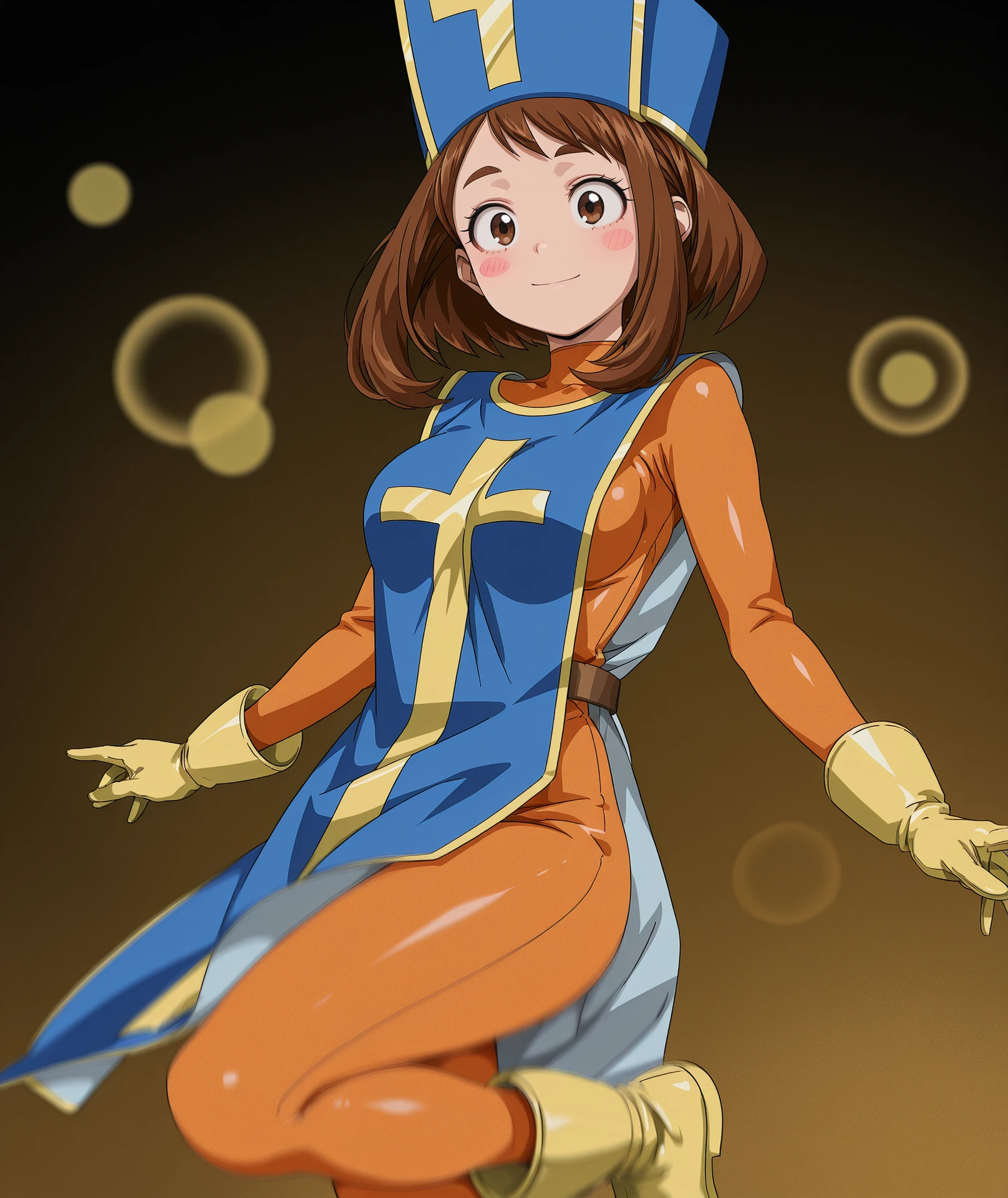 hat, blue headwear, gloves, bodysuit, cross, skin tight, tabard, orange bodysuit, mitre, blue tabard,