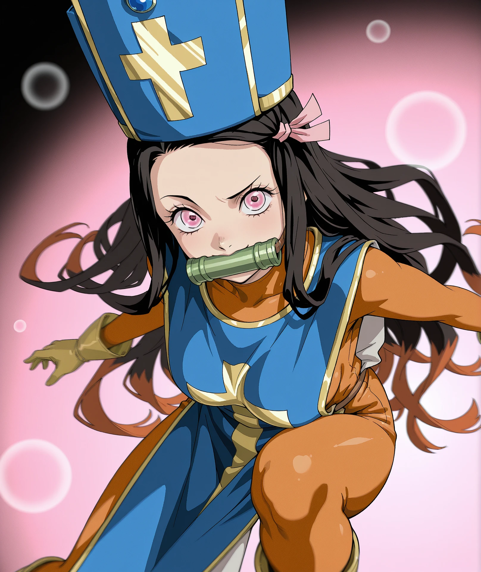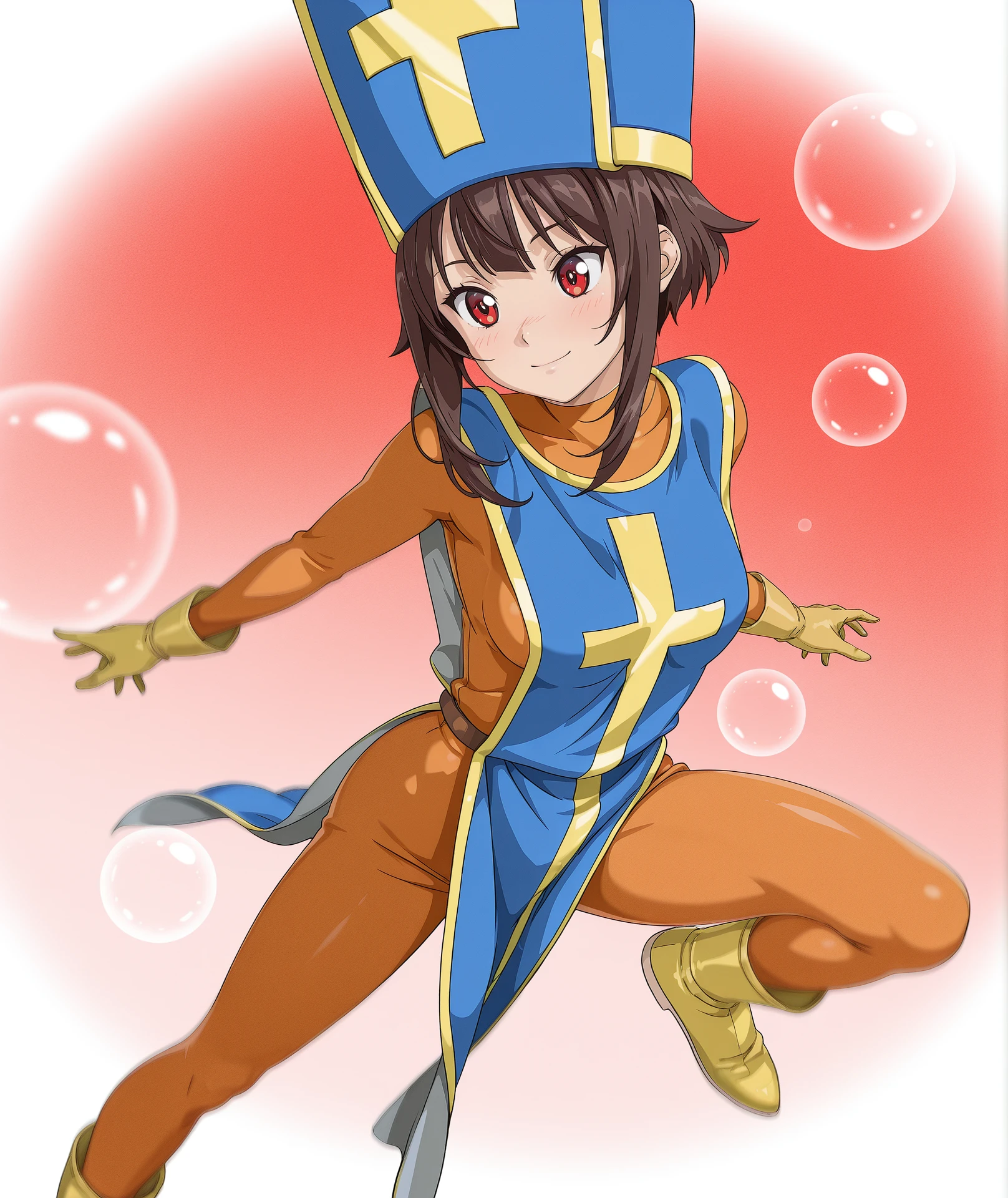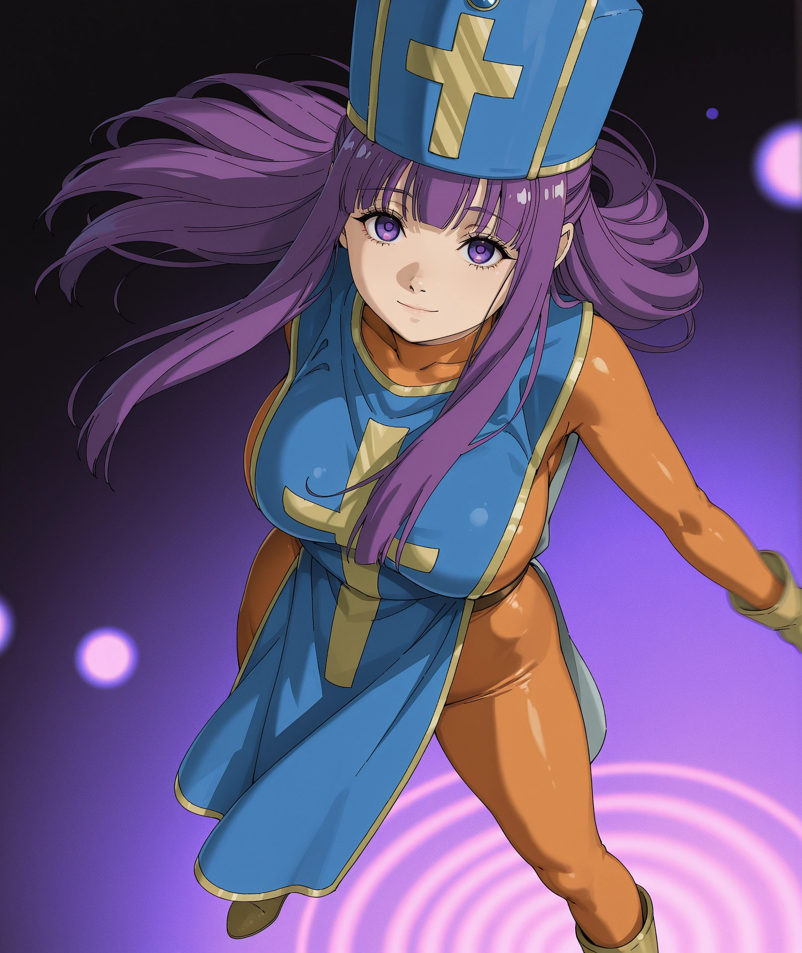 hat, blue headwear, gloves, bodysuit, cross, skin tight, tabard, orange bodysuit, mitre, blue tabard,