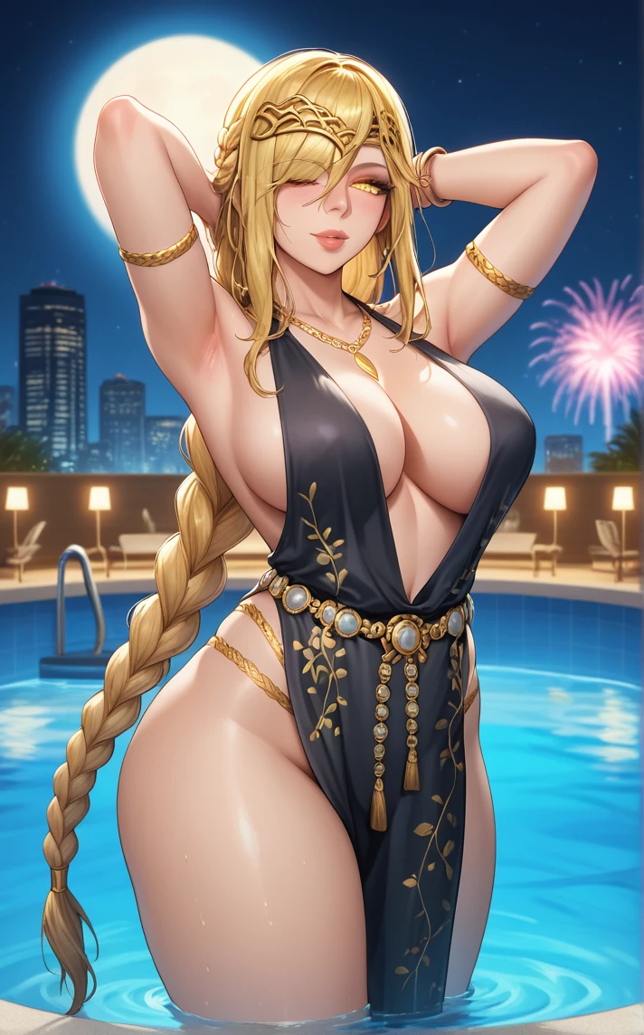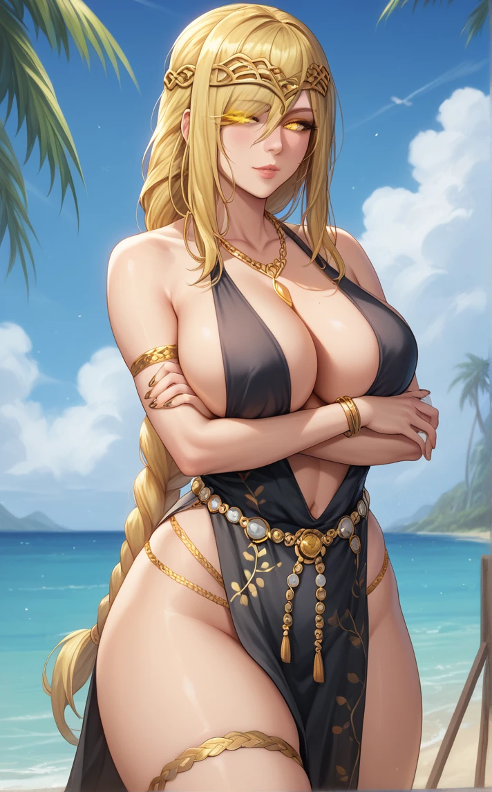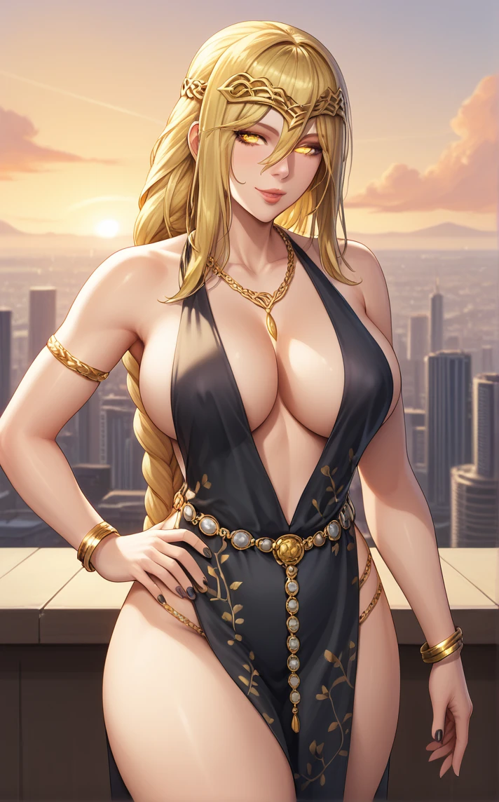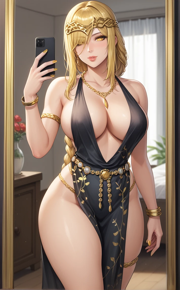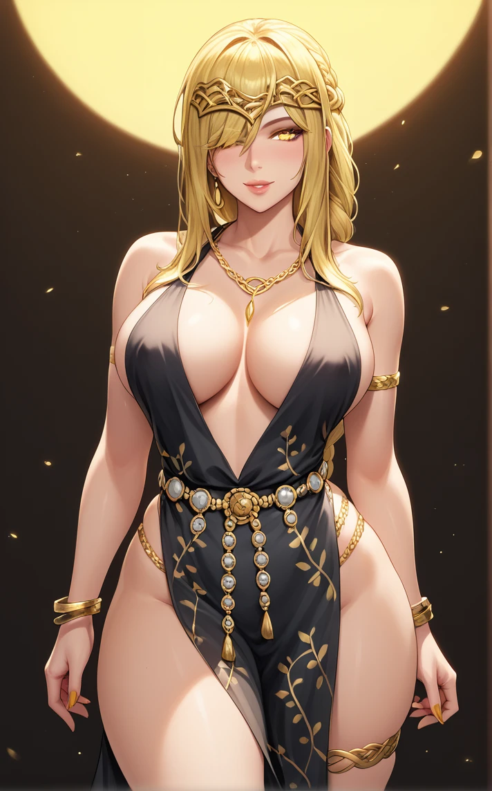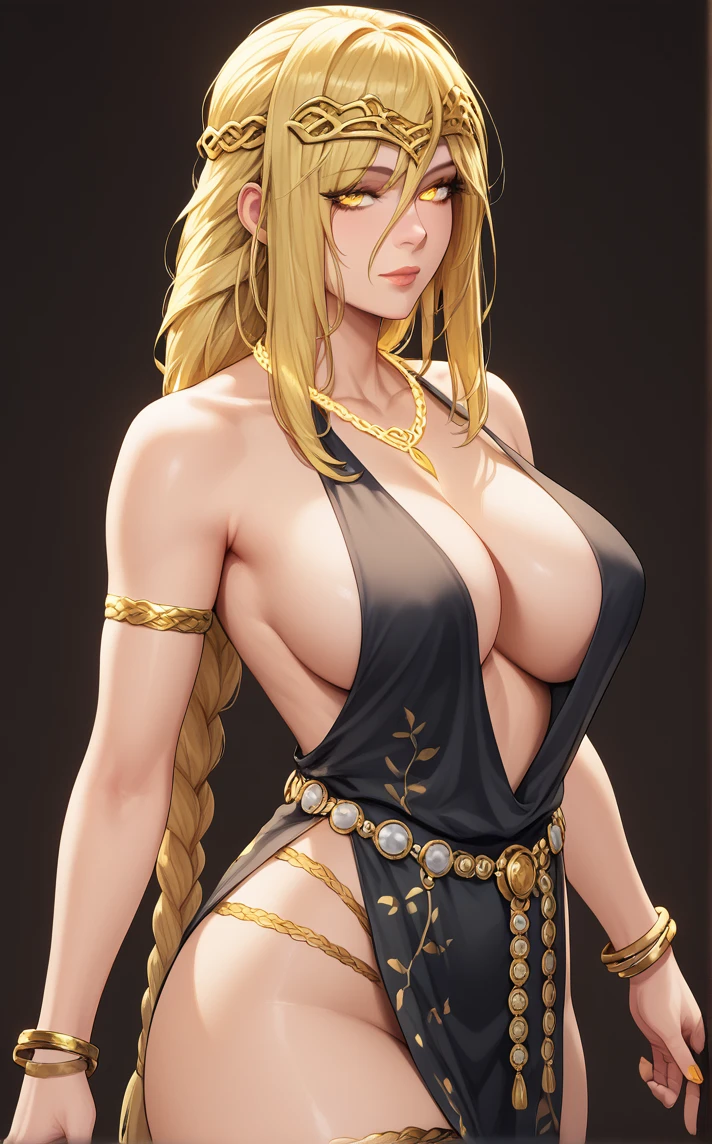 MAIN_QueenMarika_ownwaifu, 1girl, blonde hair, circlet, cracked skin, hair over one eye, necklace, pale skin, plunging neckline, ponytail, sidelocks, single braid, very long hair, yellow eyes, armlet, belly chain, floral print, gold, gold belt, jewelry, bare shoulders, lips, black dress, large breasts, cleavage, long hair, gold chain, gold necklace, sleeveless dress, gold bracelet, no bra, nose, long braid, pelvic curtain, braid, thighs, revealing clothes, braided ponytail, bracelet, collarbone, thighlet, side slit, center opening, nail polish, hair between eyes, hair over eyes, chain, makeup, no panties, belt, one eye covered, diadem, thigh strap, glowing eyes, gold trim, legs, eyelashes, thick thighs, hair ornament, bangs, cocktail dress, crack, curvy, mature female, bare legs, colored skin,