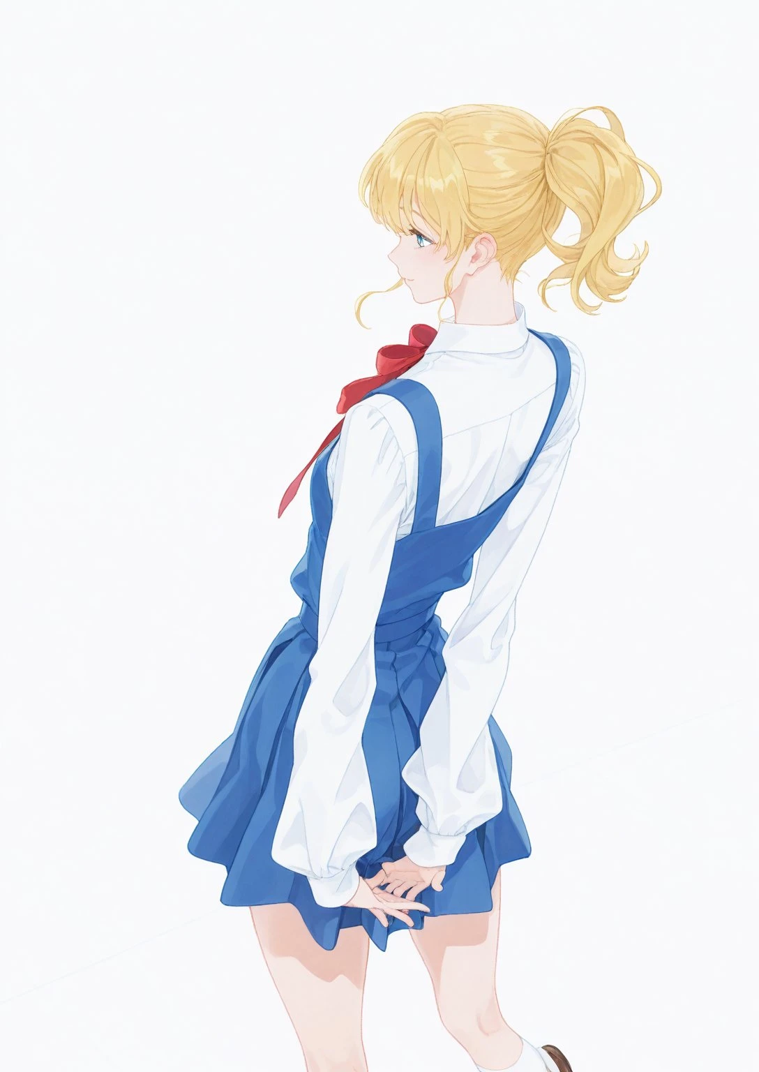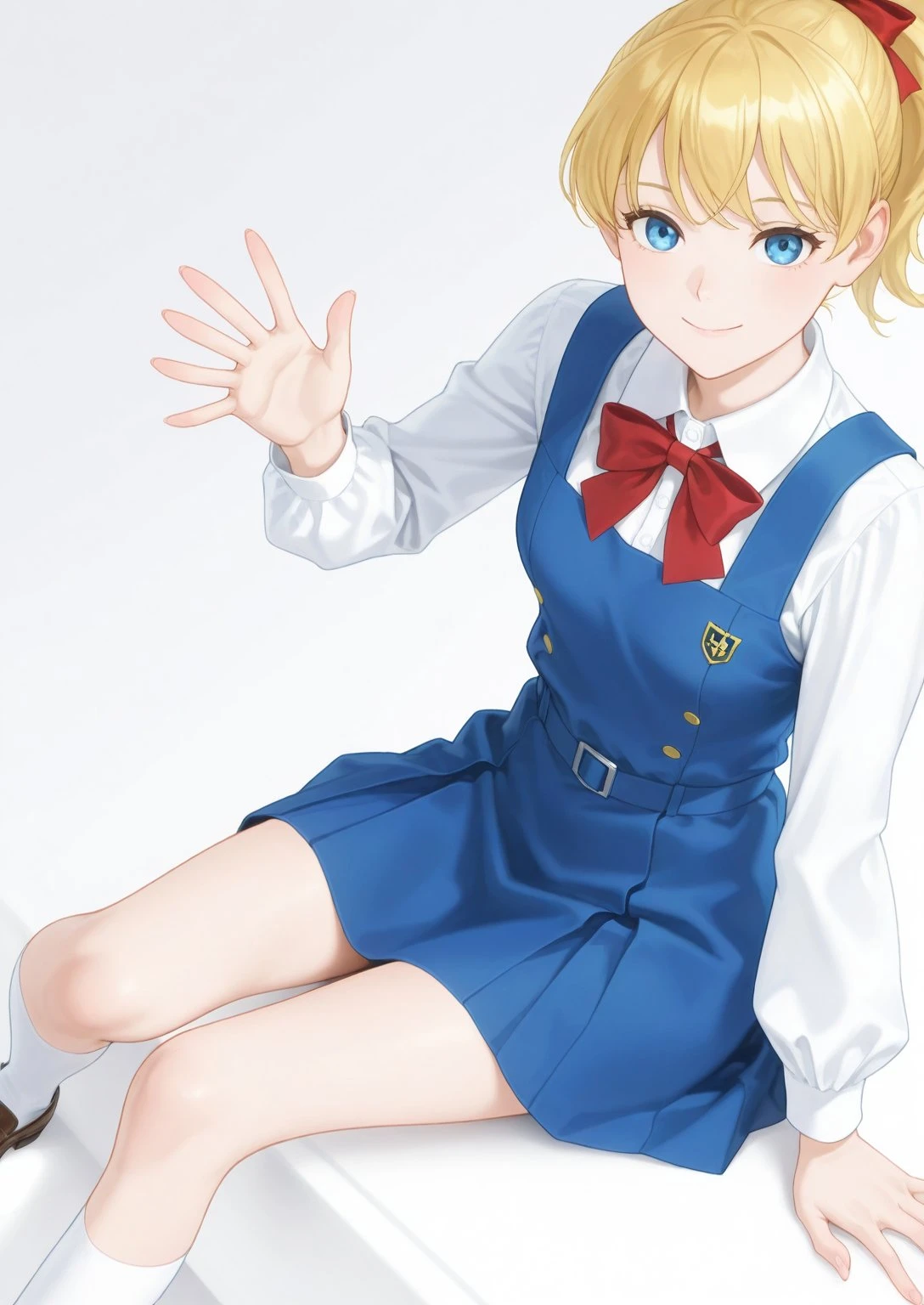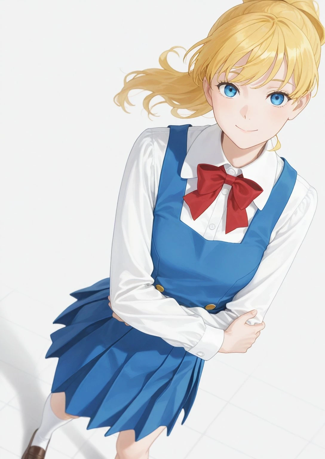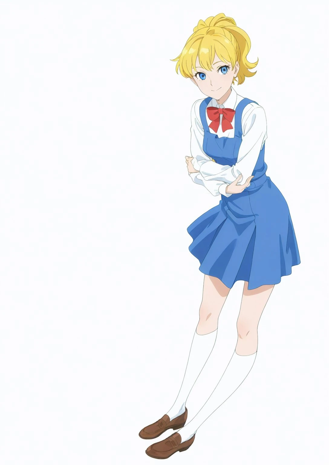 Outfit (school uniform): socks, shoes, school uniform, loafers, skirt, white shirt, brown shoes, white socks, long sleeves, kneehighs, blue skirt, pinafore dress, bow, red ribbon, blue dress, collared shirt, buttons, red bowtie, puffy long sleeves, pleated skirt