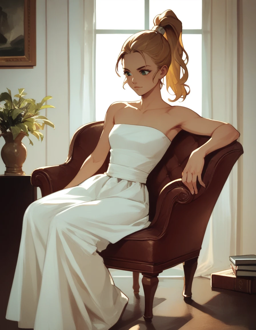 marle, ponytail, strapless dress, white dress