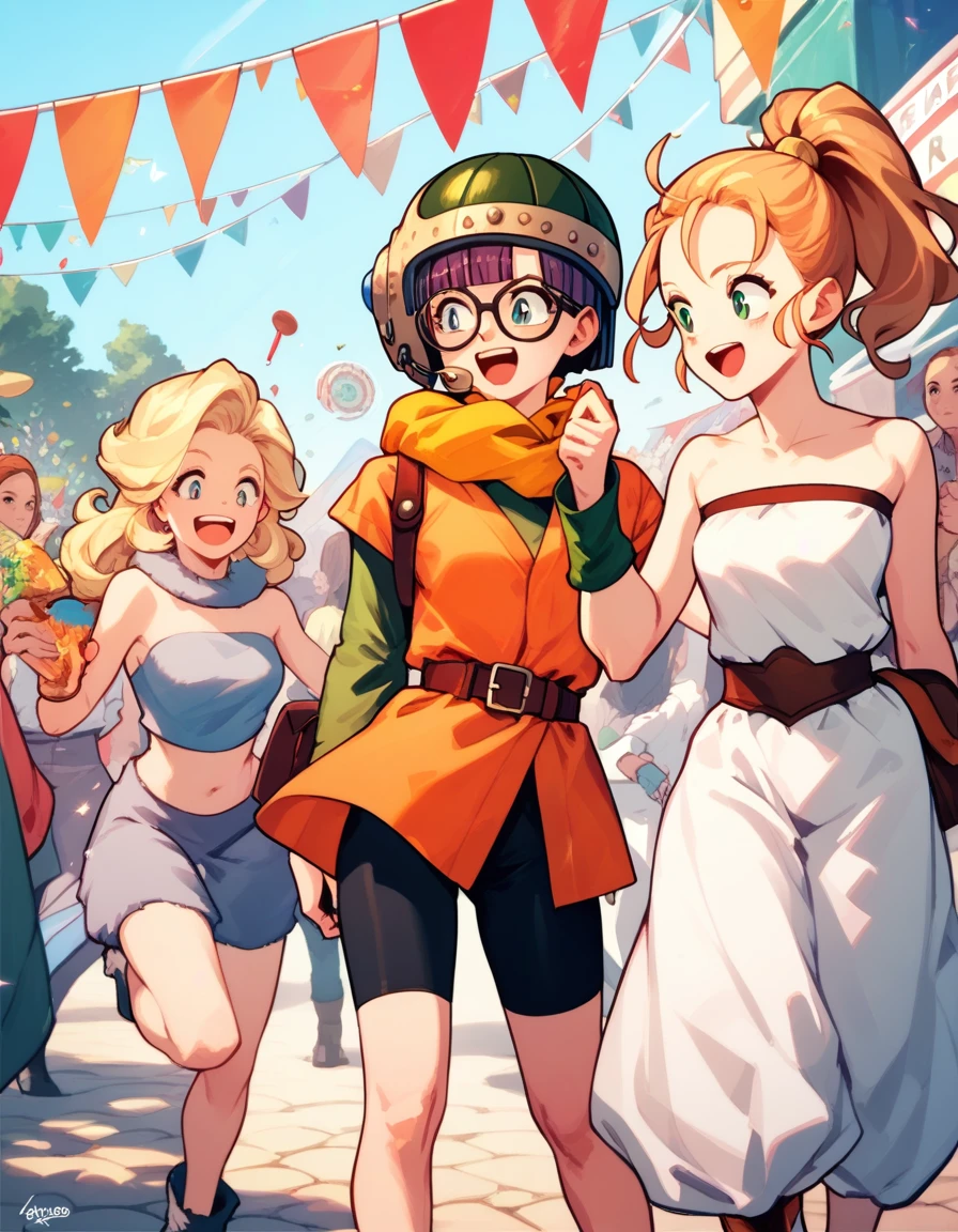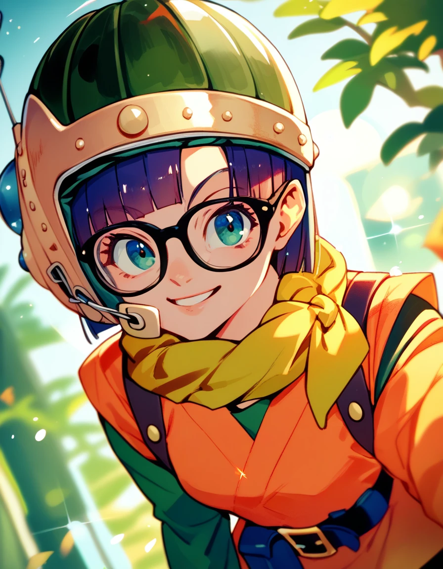 lucca: lucca, glasses, scarf, helmet, belt, orange shirt, green sleeves, short over long sleeves, bike shorts