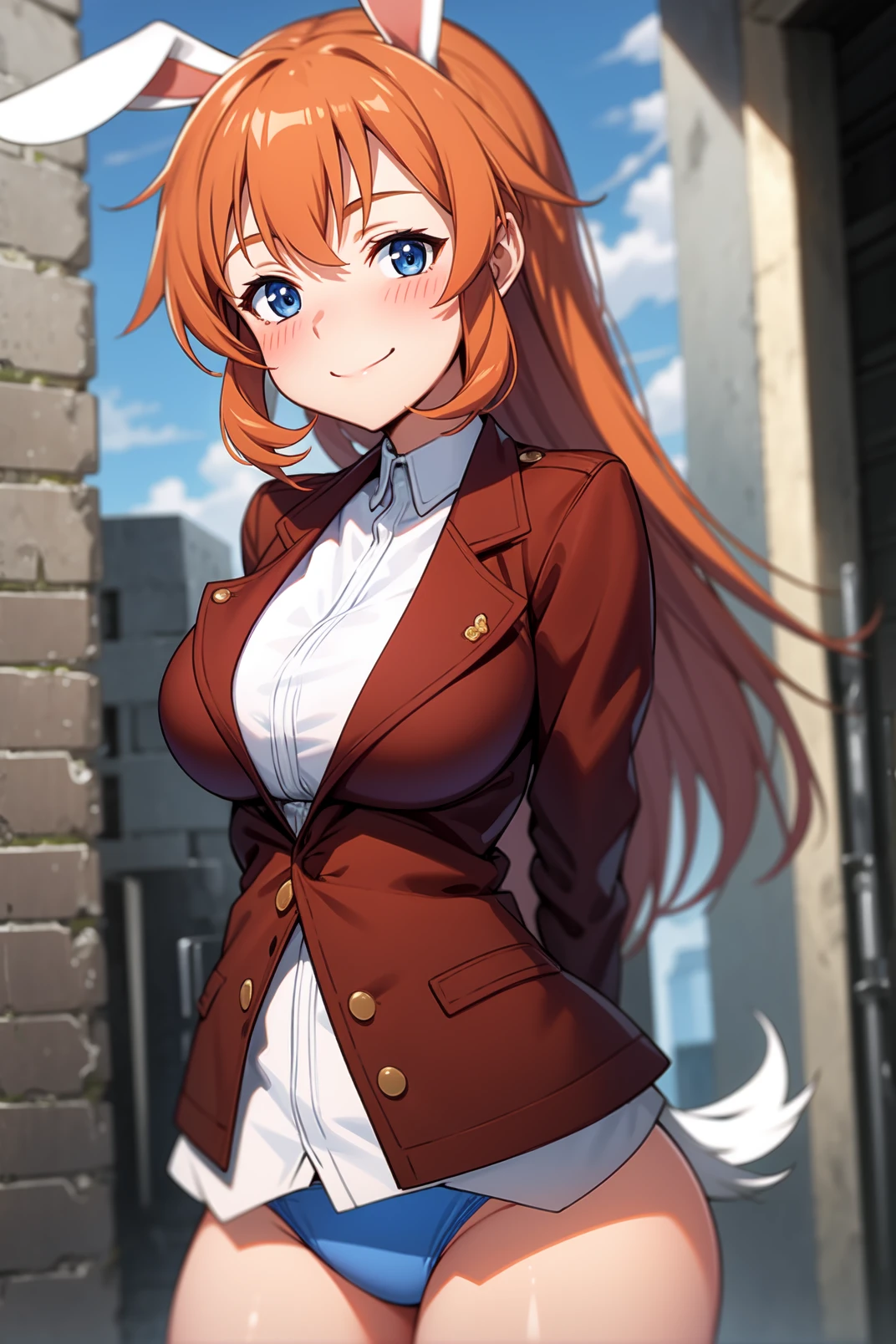 outfit: brown jacket, collared shirt, light blue panties