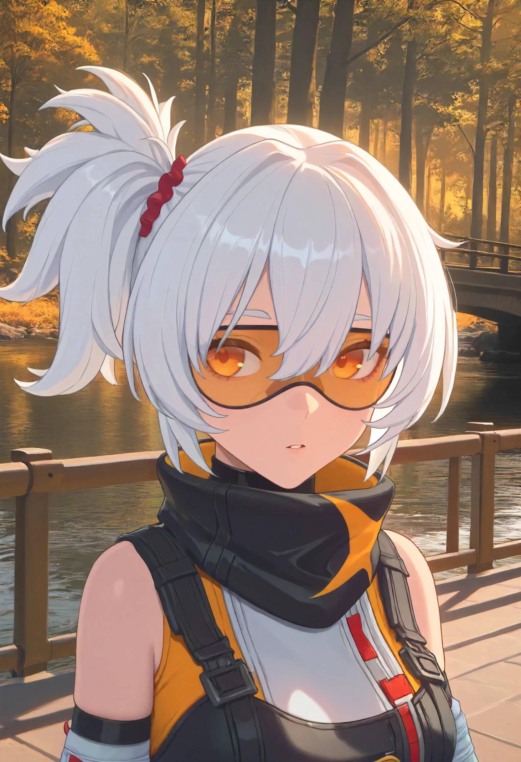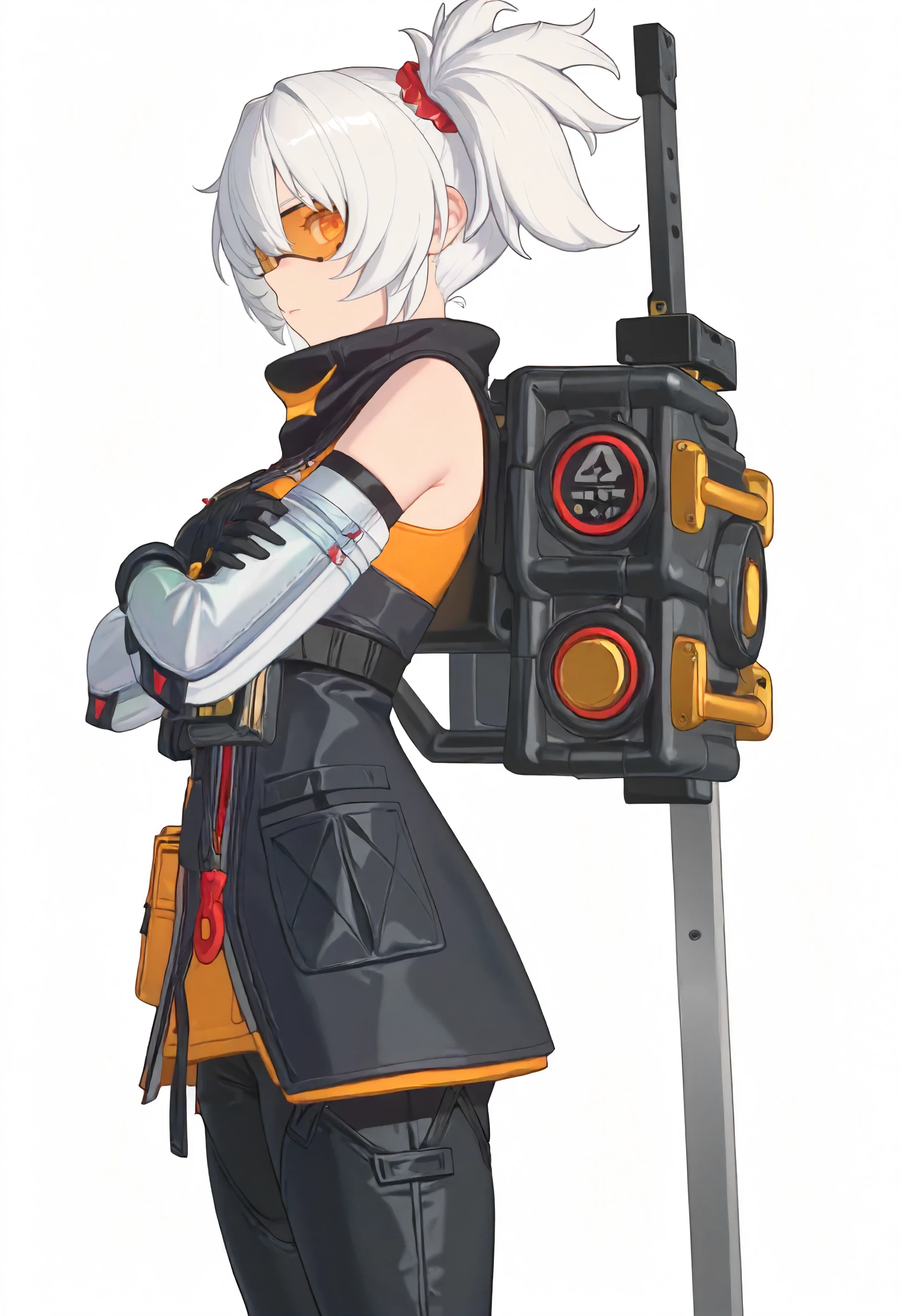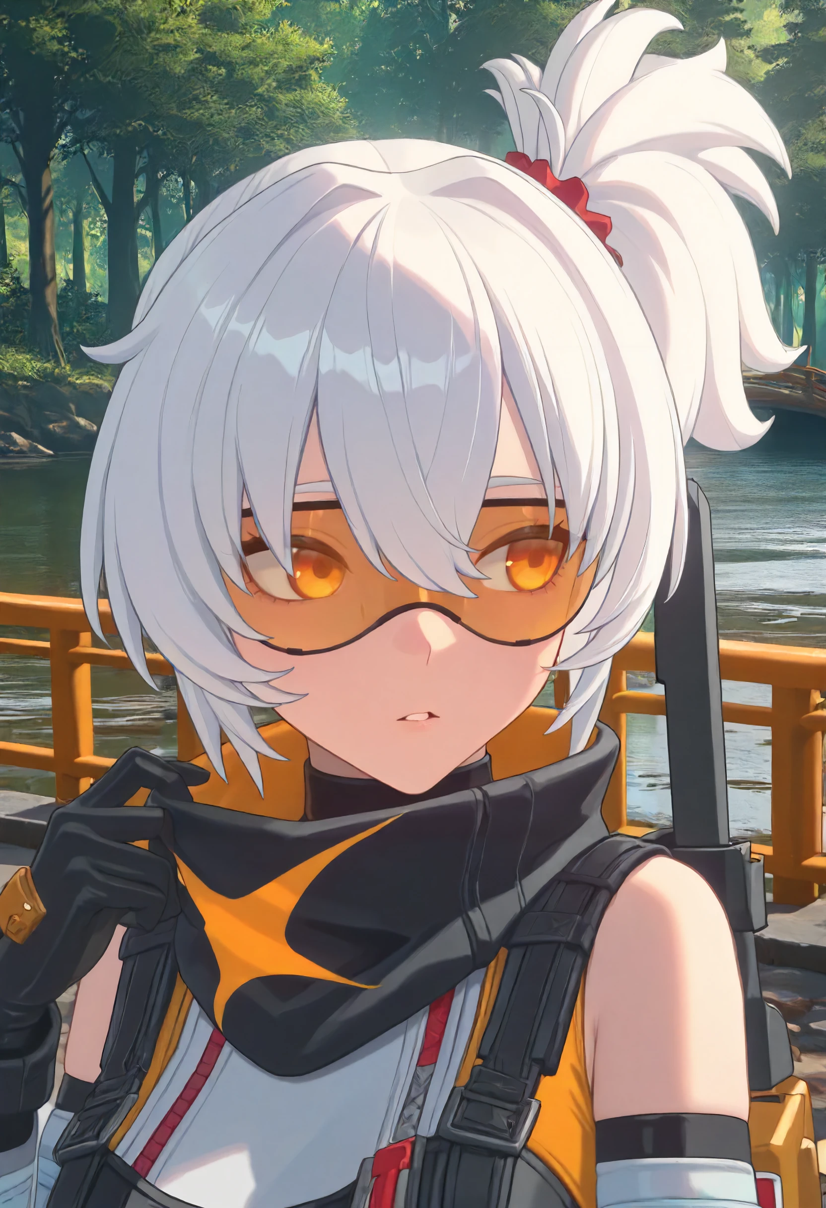 1girl, Soldier 11, solo, white hair, side ponytail, red rubber band, orange eyes, orange glasses,