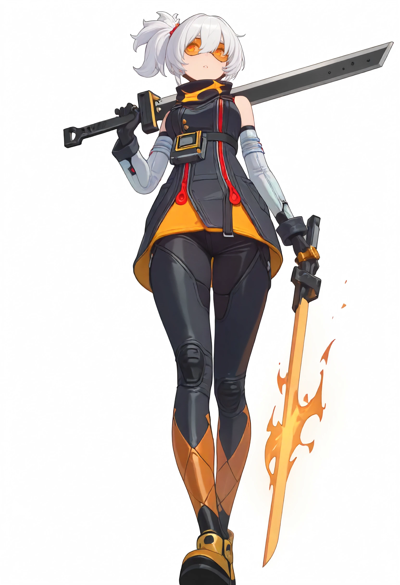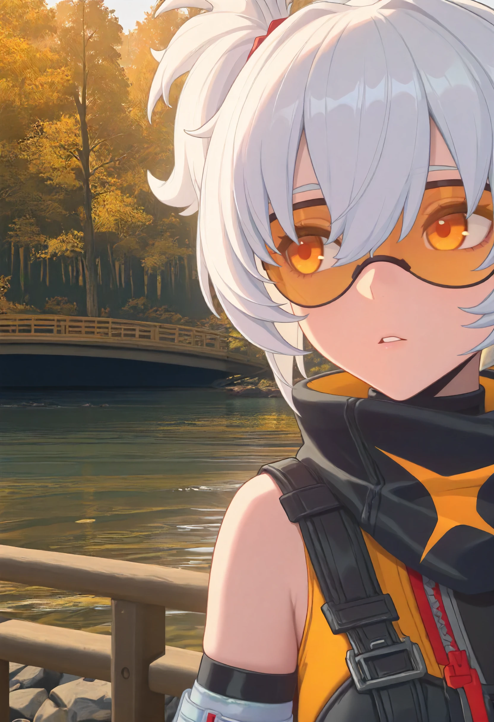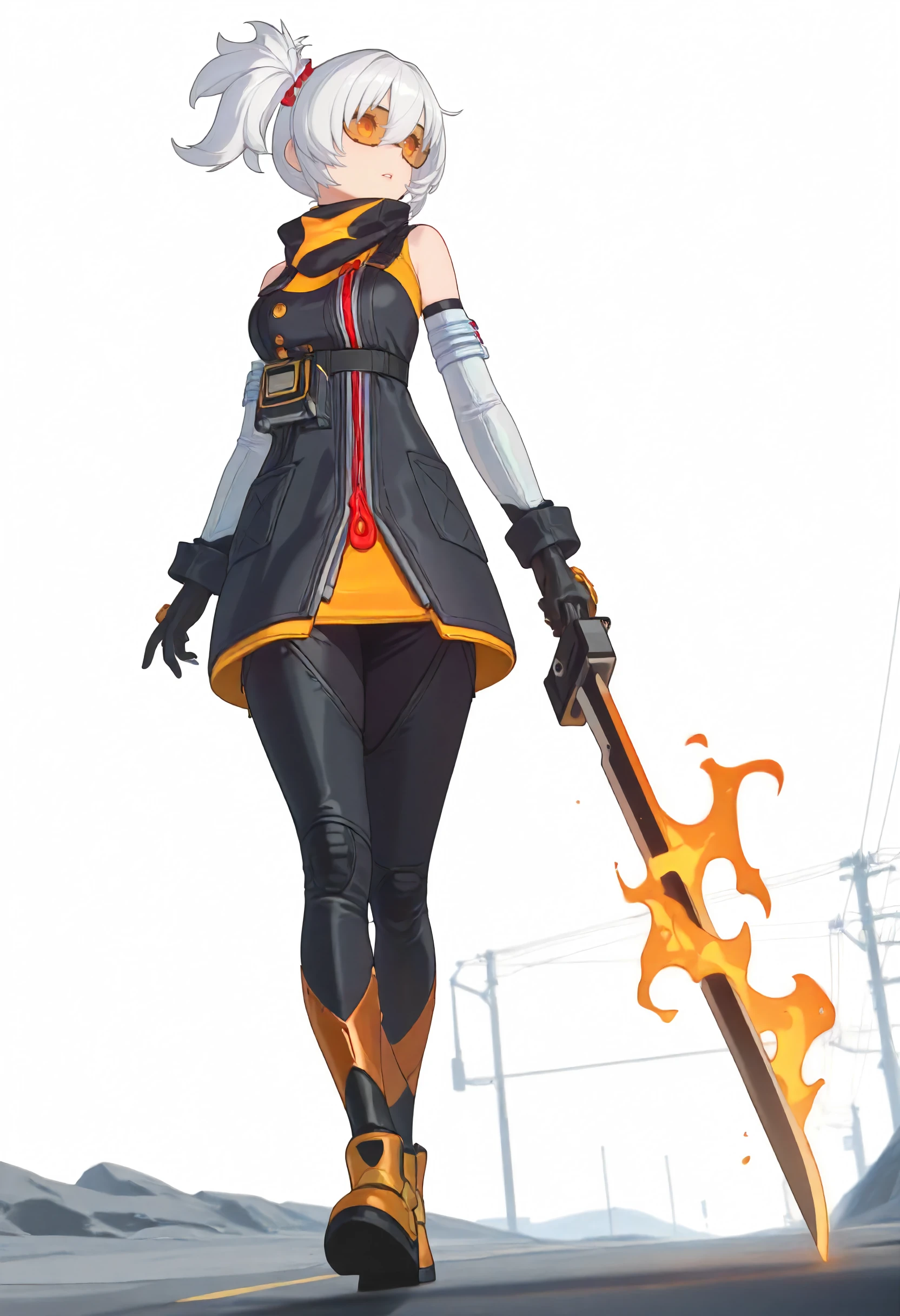 1girl, Soldier 11, solo, white hair, side ponytail, red rubber band, orange eyes, orange glasses,