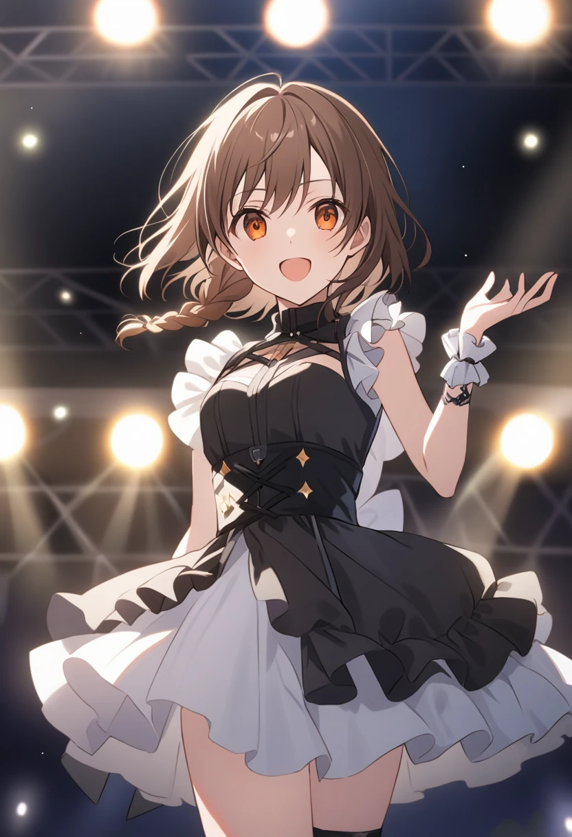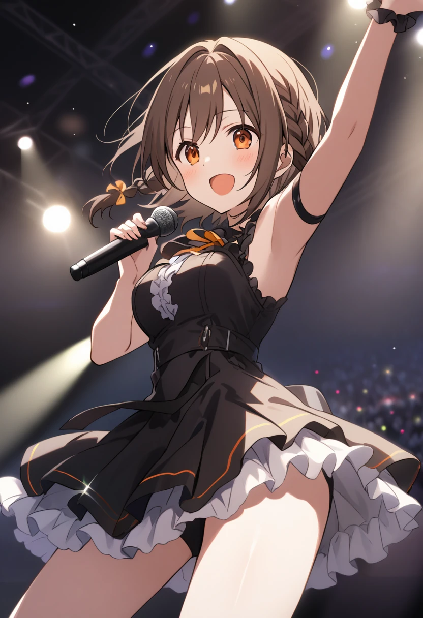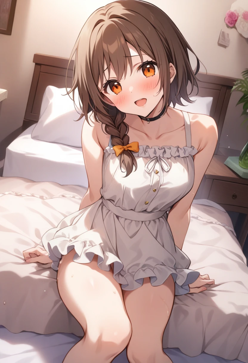 senkawa chihiro, orange eyes, brown hair, side braid, red scrunchie,In a word, 鬼(=demon)