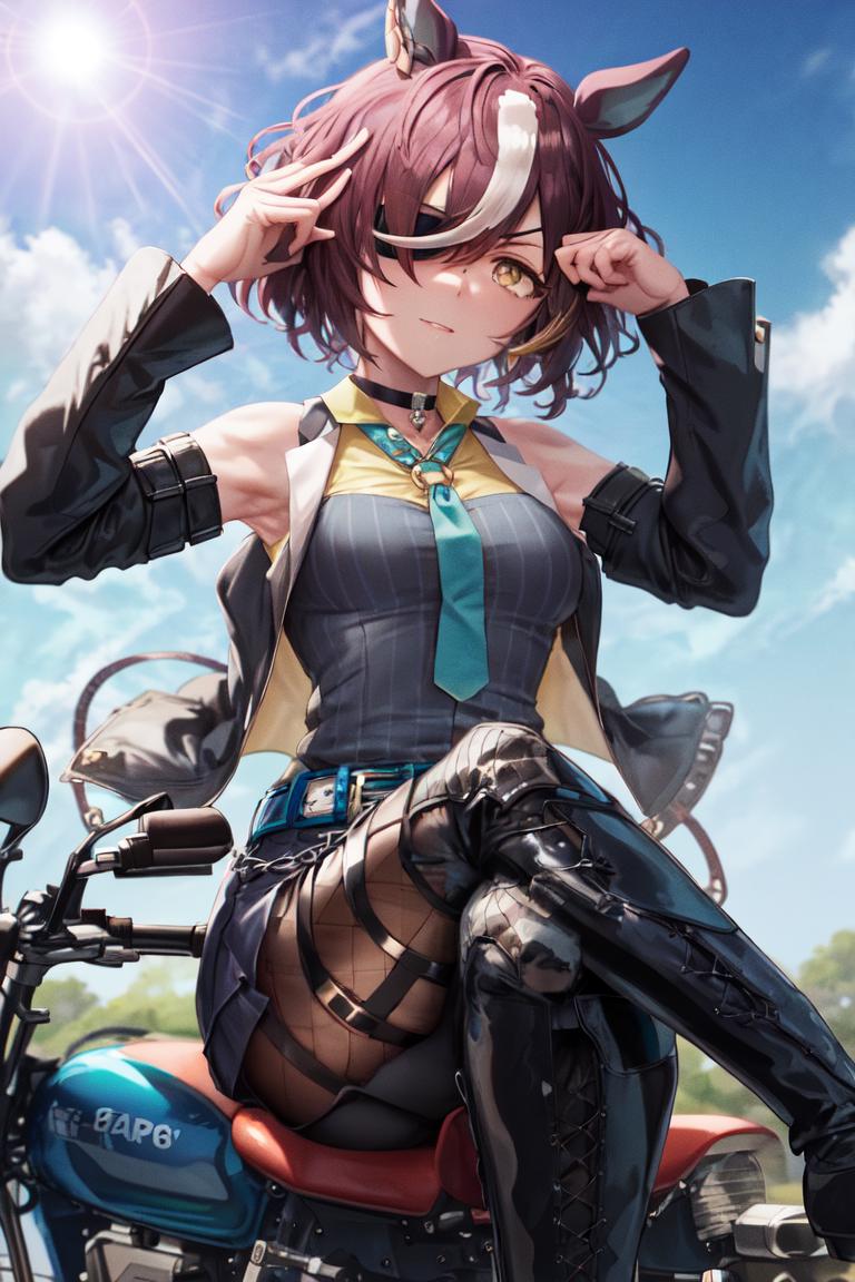eyepatch, black choker, half gloves, asymmetrical gloves, mismatched gloves, black glove, white glove, shoulder cutout, bare shoulders, detached sleeves, long sleeves, sleeveless shirt, blue necktie, open clothes, black jacket, collared shirt, yellow shirt, striped vest, belt, chain, white shorts, black skirt, thigh strap, black pantyhose, fishnet pantyhose, knee boots, high heel boots, black footwear