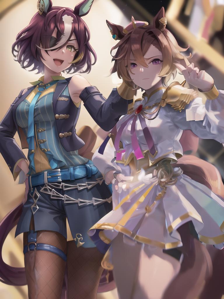 1girl, alternate costume, pink hair, medium hair, horse ears, grey eyes, animal ears, blue hair, purple hair, horse girl, streaked hair, short hair, bangs, black hair, yellow eyes, red eyes, multicolored hair, two-tone hair, puffy sleeves, fishnets, green eyes, simple background, official alternate costume, white hair, solo, brown hair, horse tail, black eyes, blue eyes, brown eyes