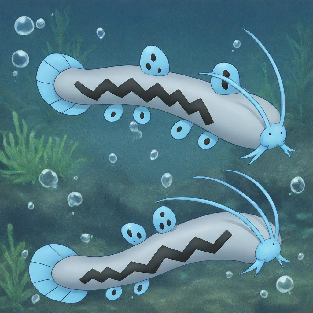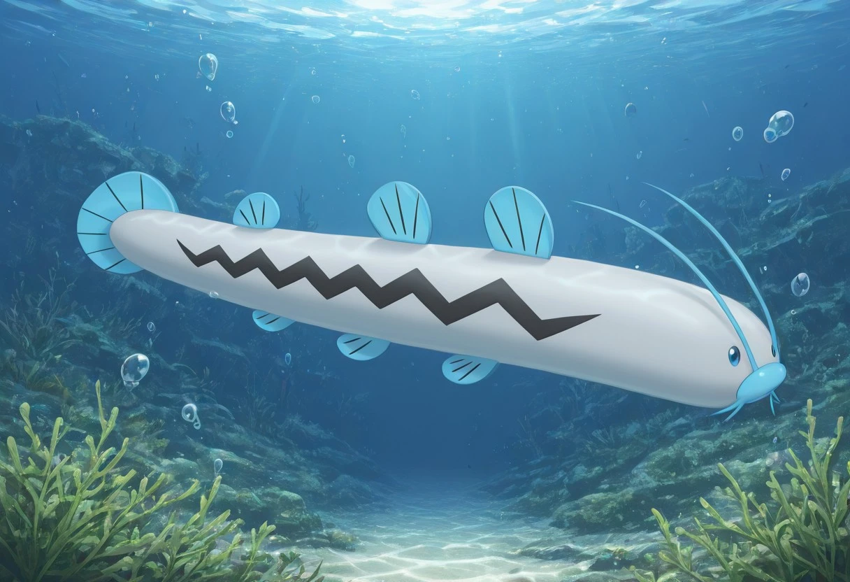 Barboach_pkmn, blue mouth, blue whiskers, blue fins, blue tailfin, gray body, black zigzag on body, black dots on fins, dot eyes
