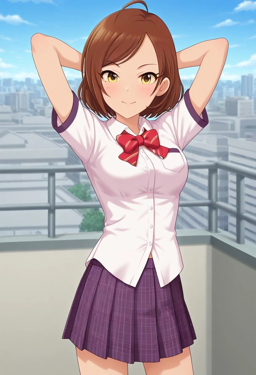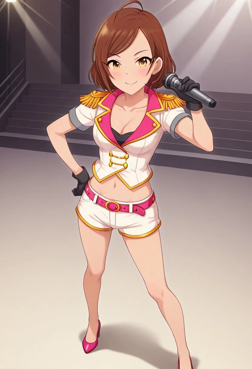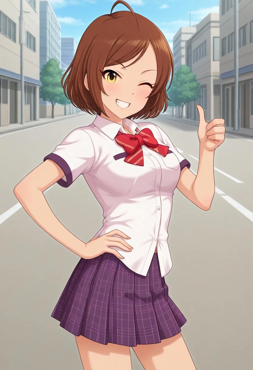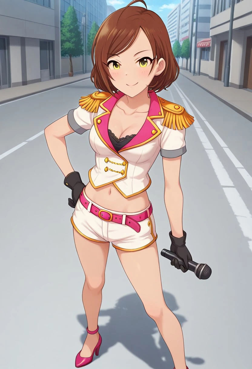 PROMPT: (Face) - 1girl, im yujin, brown hair, short hair, ahoge, yellow eyes, long eyelashes, idolmaster cinderella girls, medium breasts,