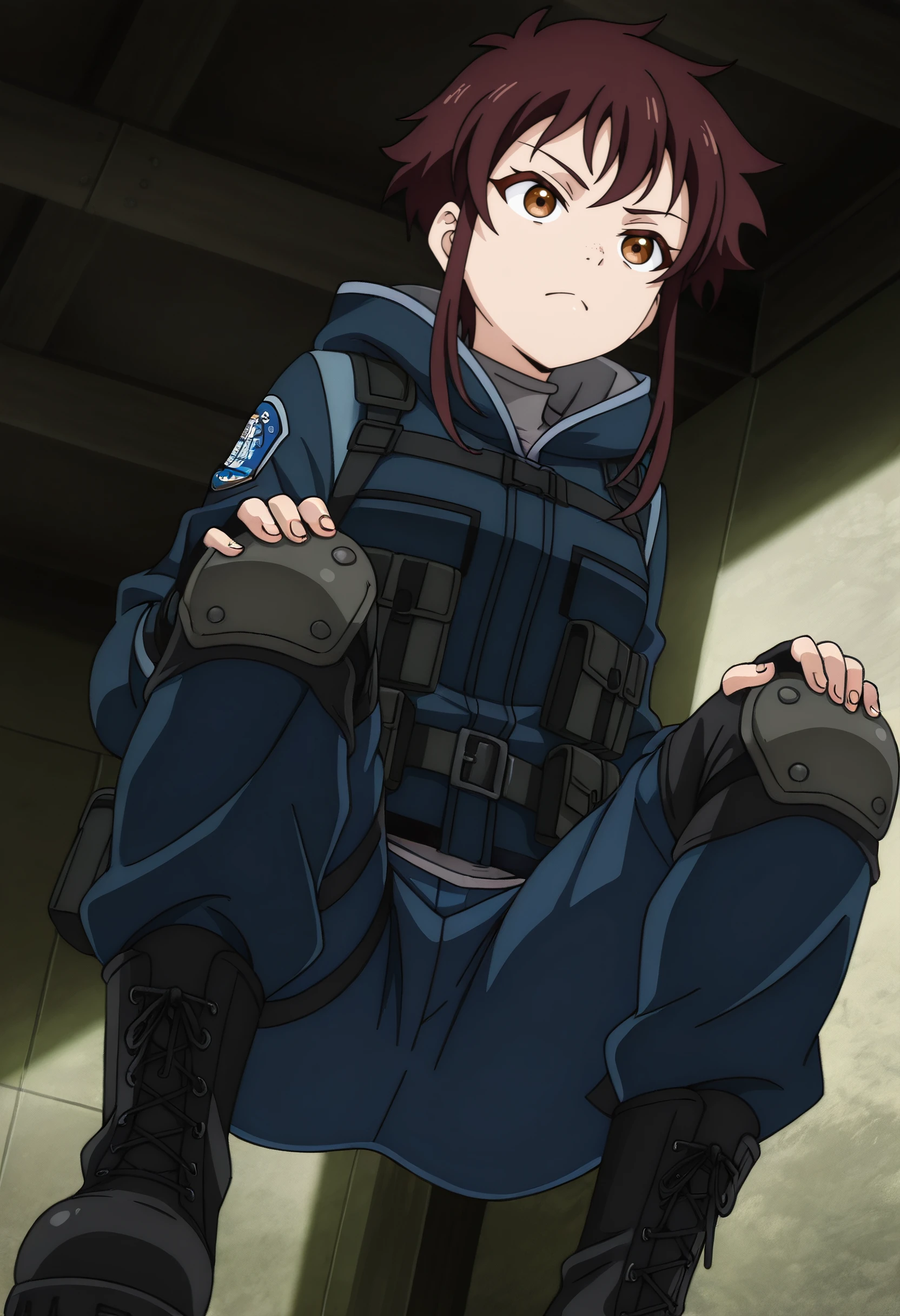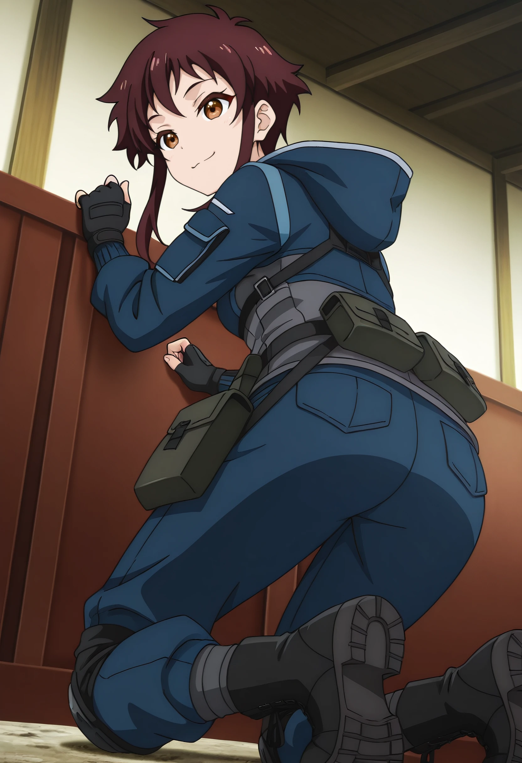 LakisJacket, gloves, jacket, fingerless gloves, hood, blue jacket, black gloves, military uniform, pants, military, blue pants, boots, black footwear, short hair with long locks, belt, long sleeves, braid, knee pads, strap, grey shirt, combat boots, tactical clothes,