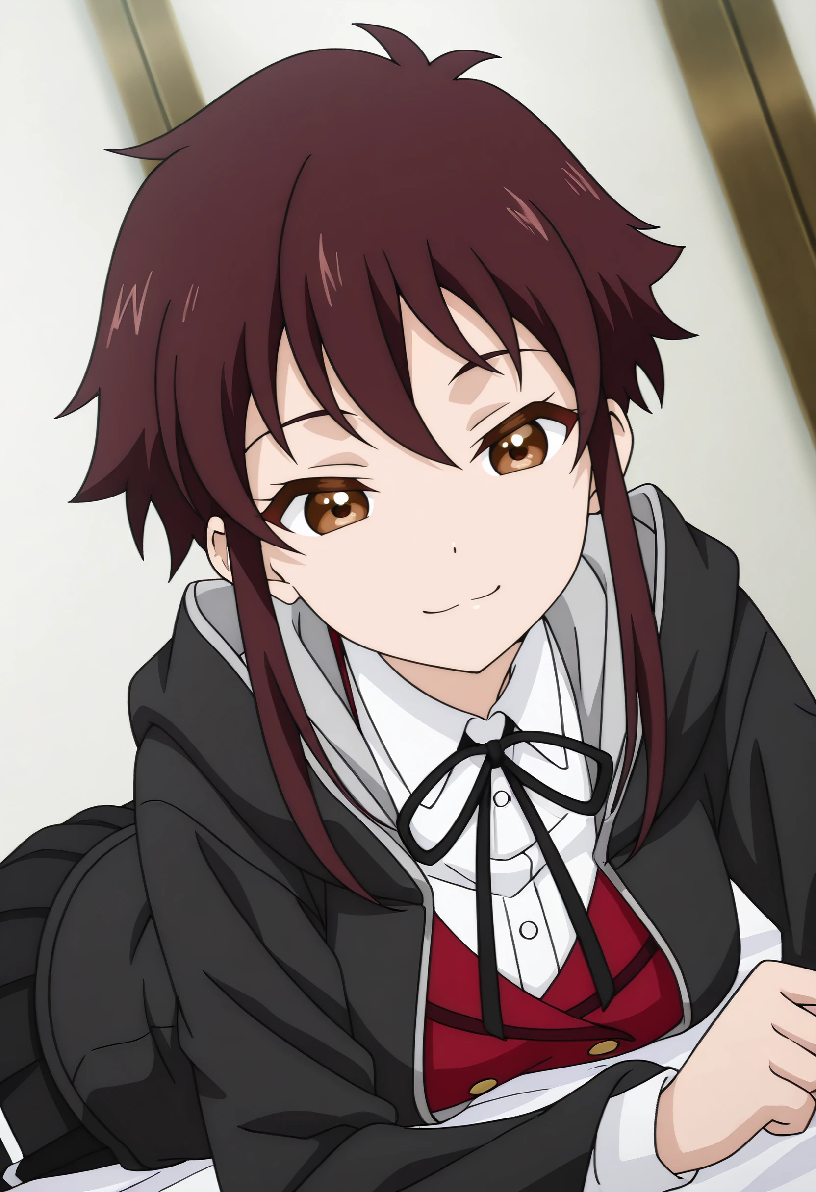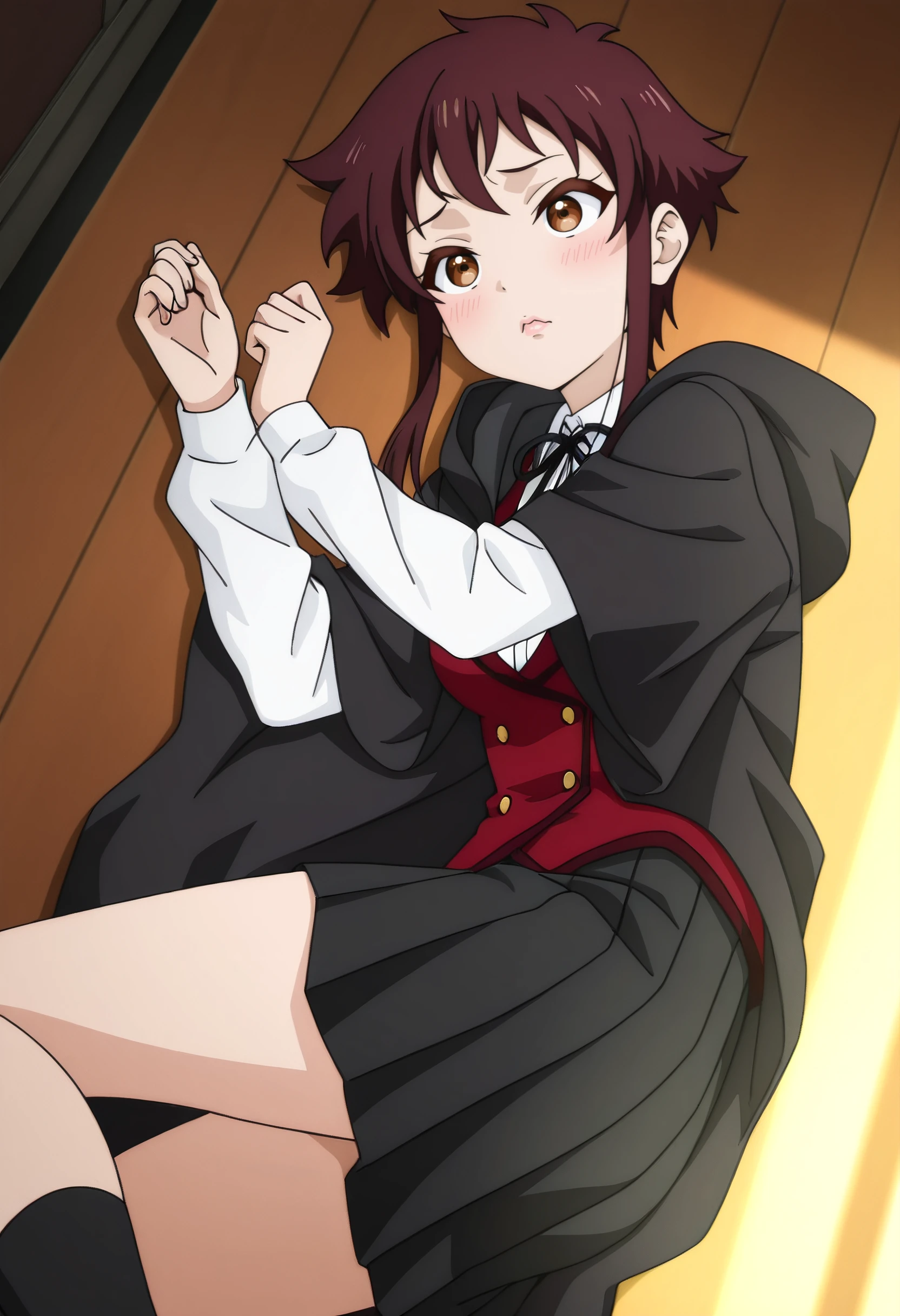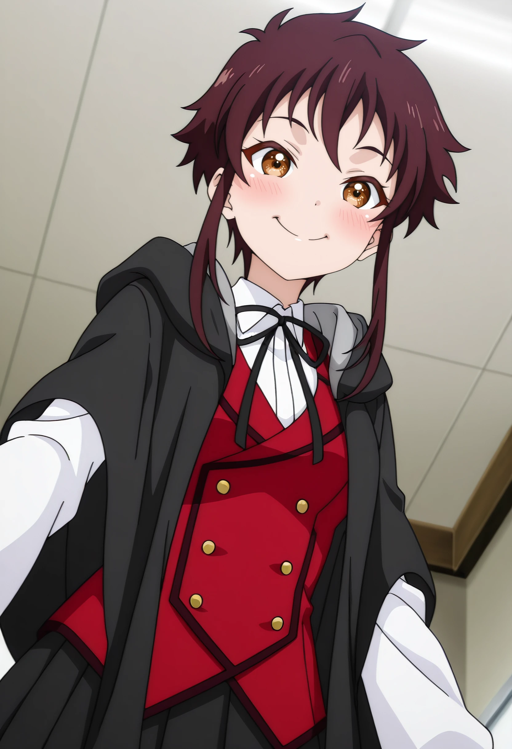LakisSchoolB, school uniform, neck ribbon, black ribbon, white shirt, jacket, short hair with long locks, ribbon, long sleeves, shirt, collared shirt, vest, buttons, braid, skirt, hood, black skirt, hooded robe, pleated skirt,