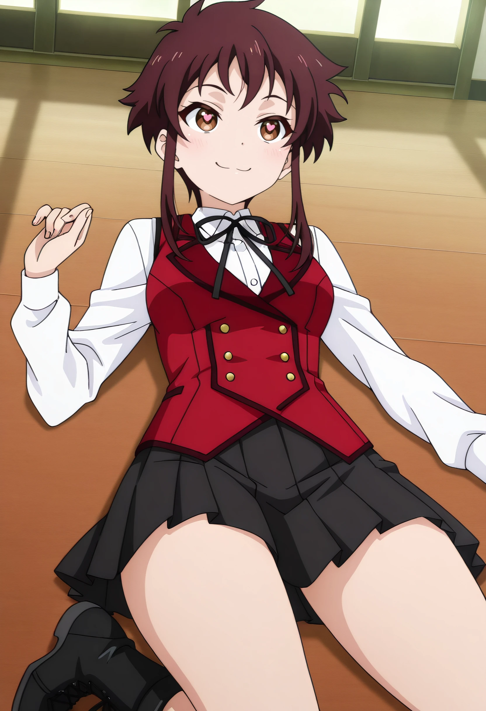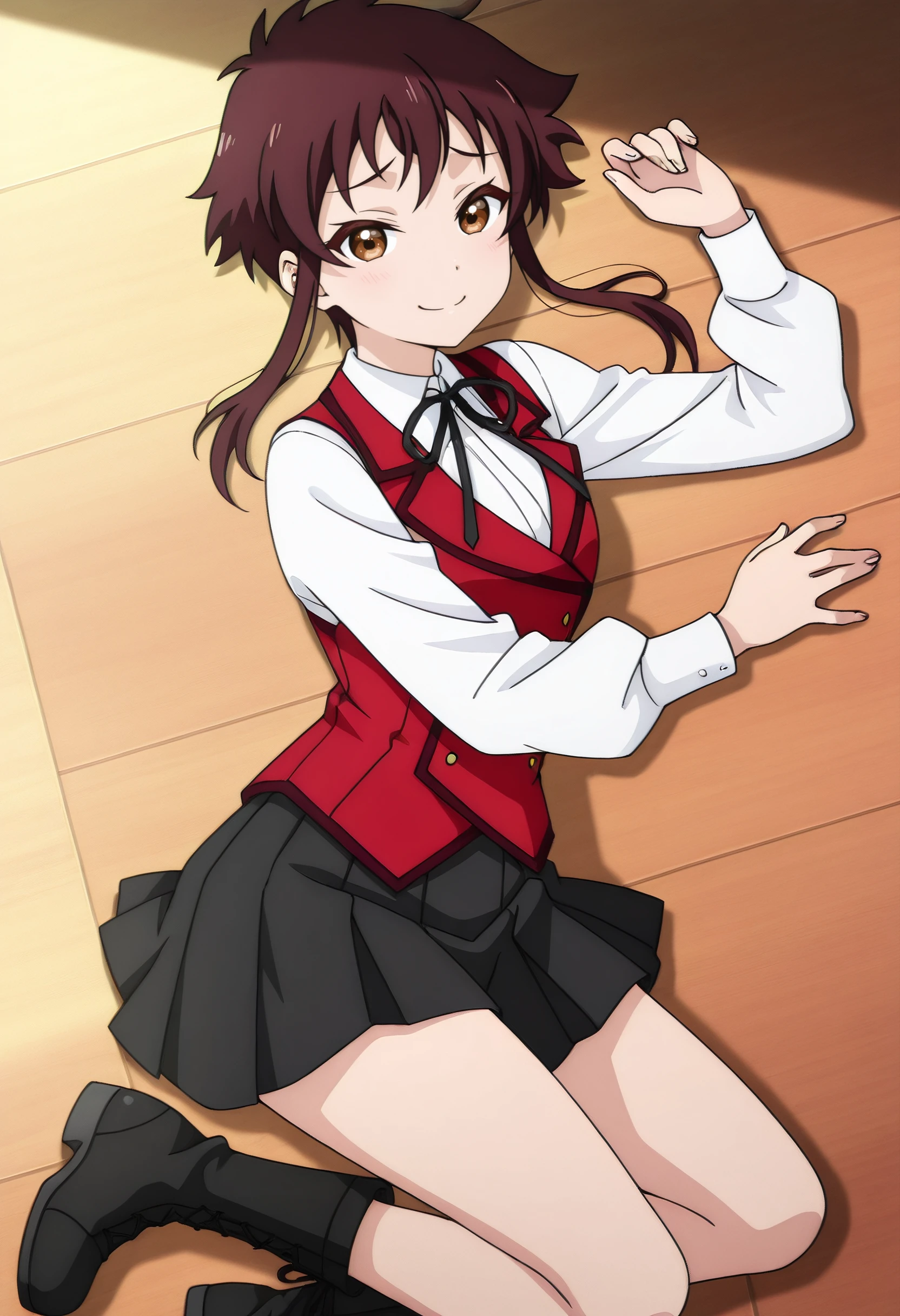 LakisSchoolA, school uniform, vest, white shirt, black ribbon, ribbon, shirt, neck ribbon, red vest, short hair with long locks, long sleeves, skirt, pleated skirt, black skirt, collared shirt, boots, black footwear, miniskirt, dress shirt, wing collar,