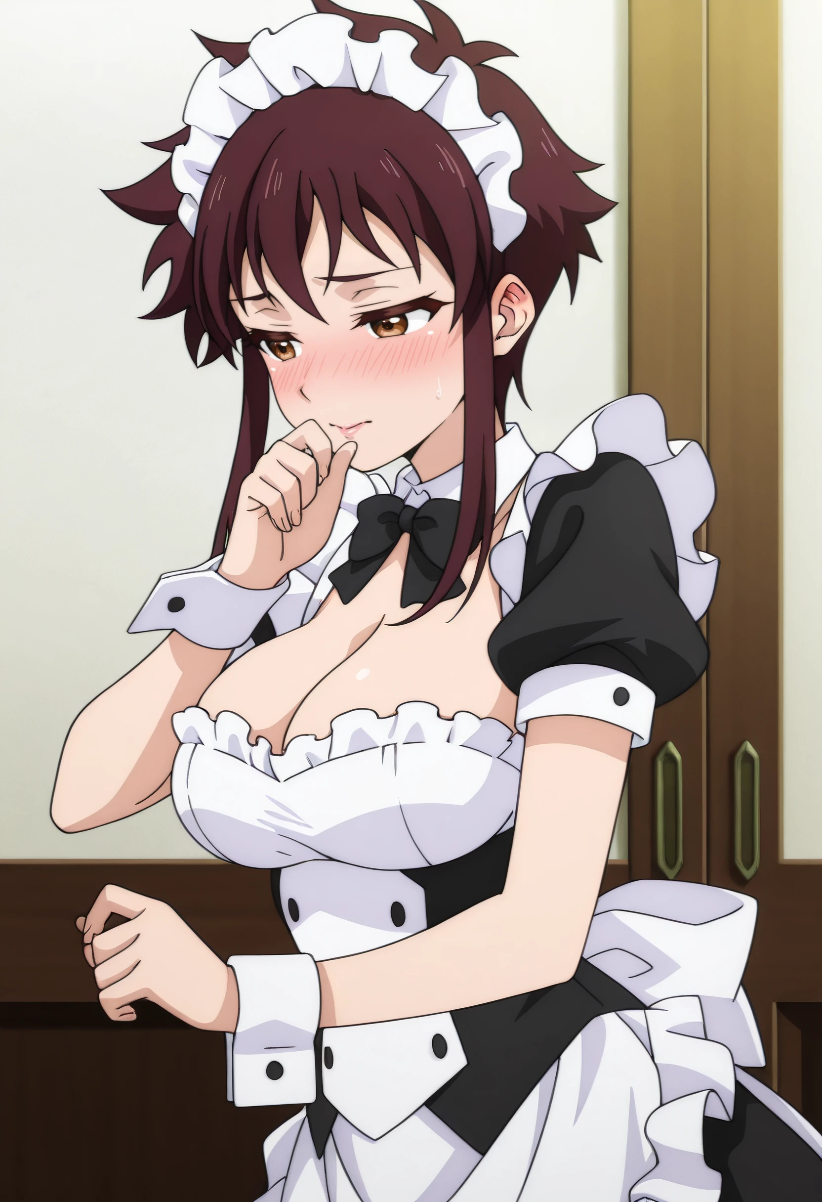 LakisMaid, maid headdress, maid, bow, enmaided, detached collar, black bow, bowtie, black bowtie, apron, maid apron, white apron, cleavage, frills, black dress, frilled apron, dress, wrist cuffs, puffy sleeves, short sleeves, spiked hair, puffy short sleeves, frilled dress, short hair with long locks, white wrist cuffs,