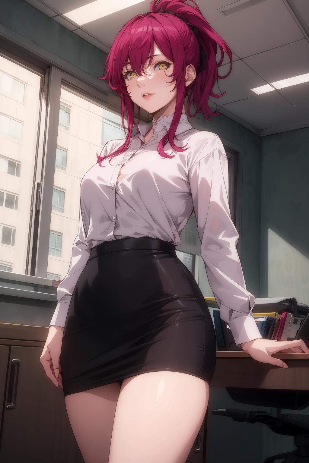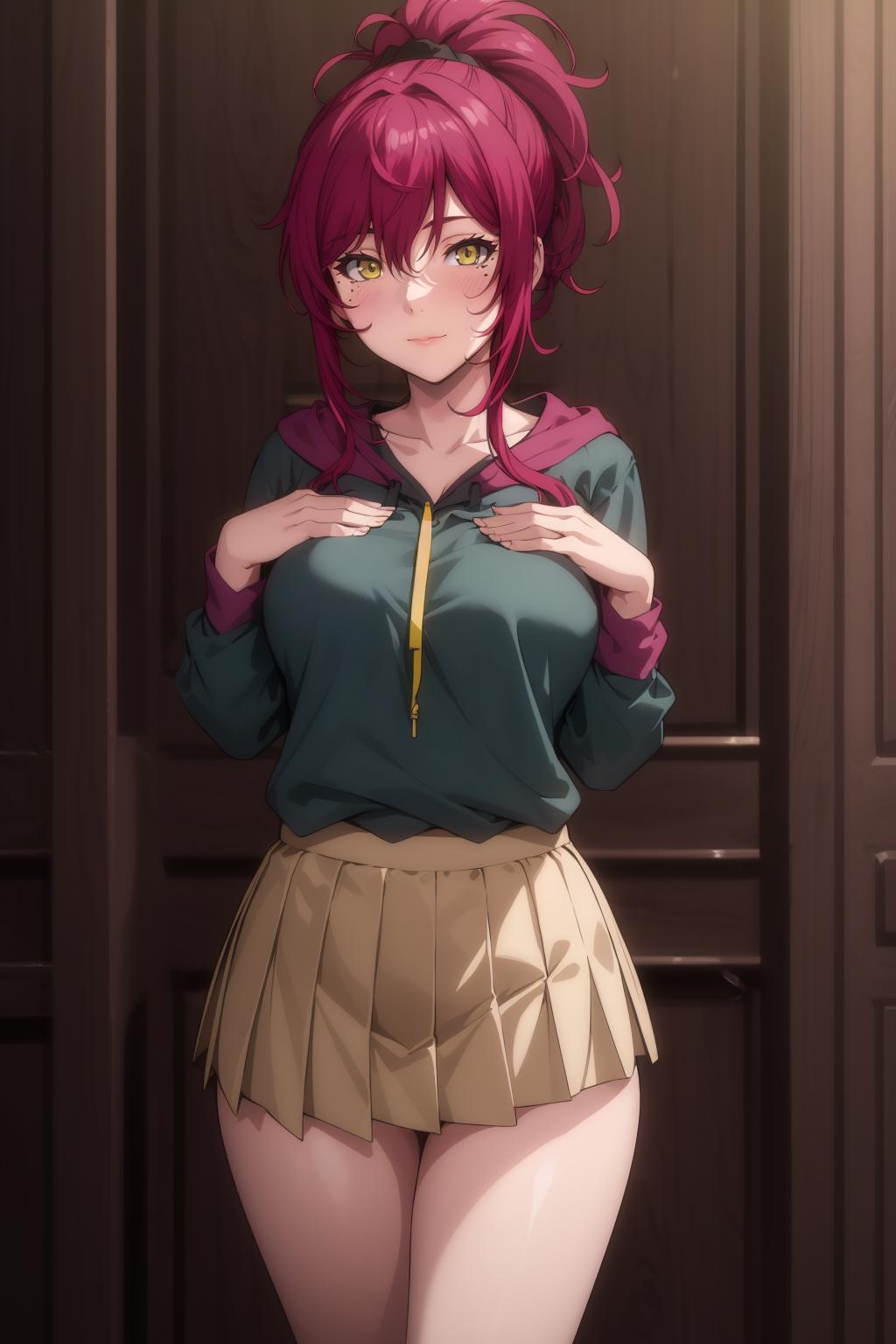 Madomiya Marie,1girl,solo,red hair,mole under eye,ponytail,bangs,yellow eyes,
