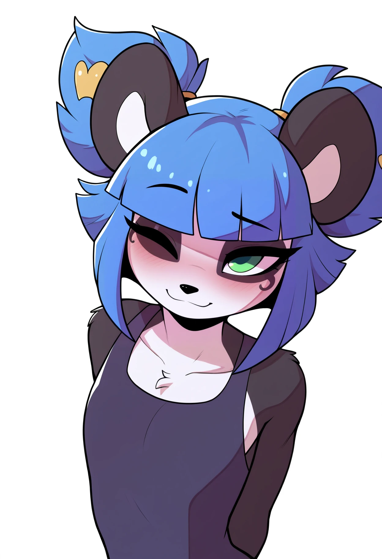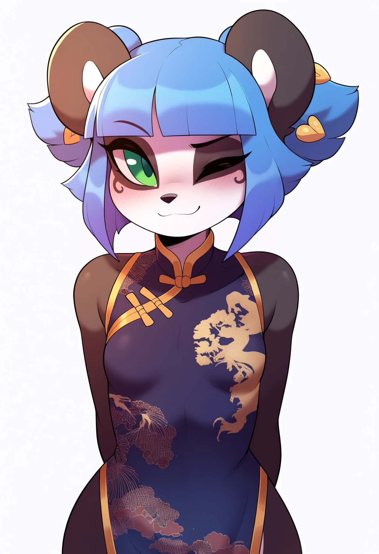 1girl, nuwa,blue hair, blunt bangs, short hair, green eyes, hair bow, furry, panda ears, tail