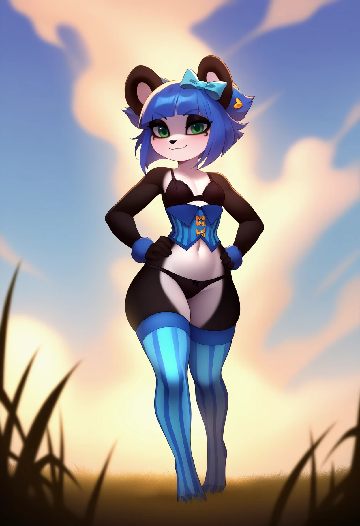 Outfit prompts : black bra, black panties, blue thighhighs, vertical-striped thighhighs, corset, navel