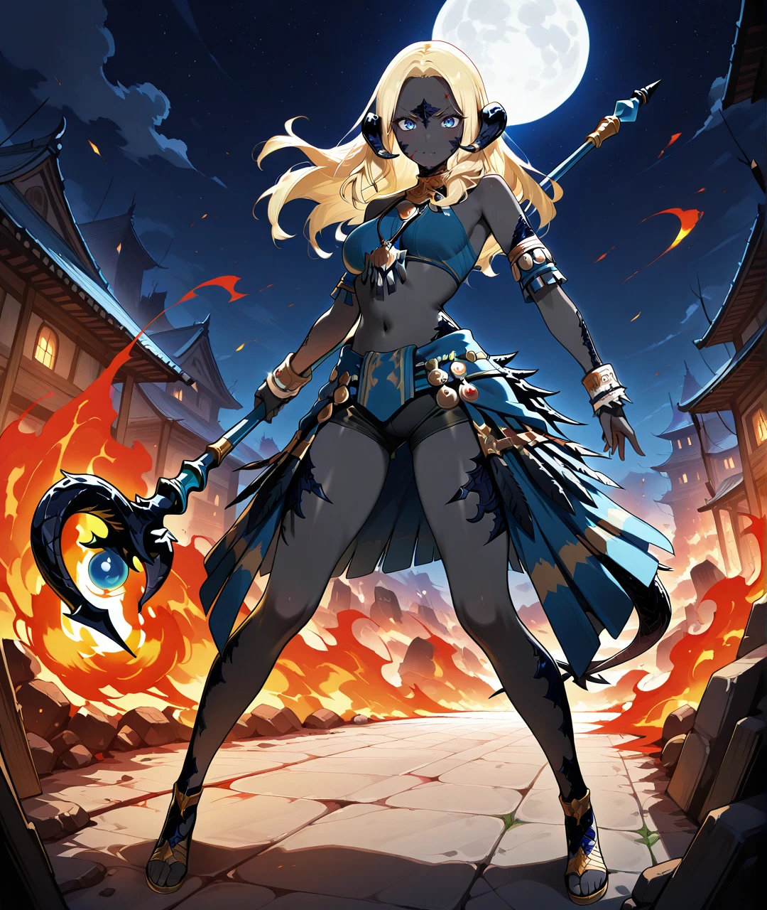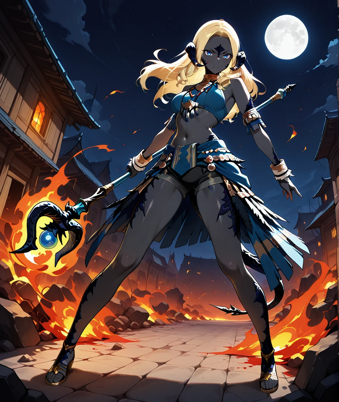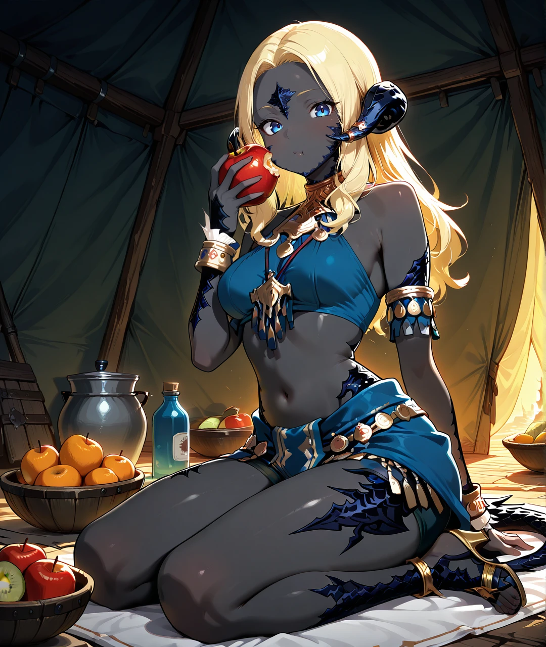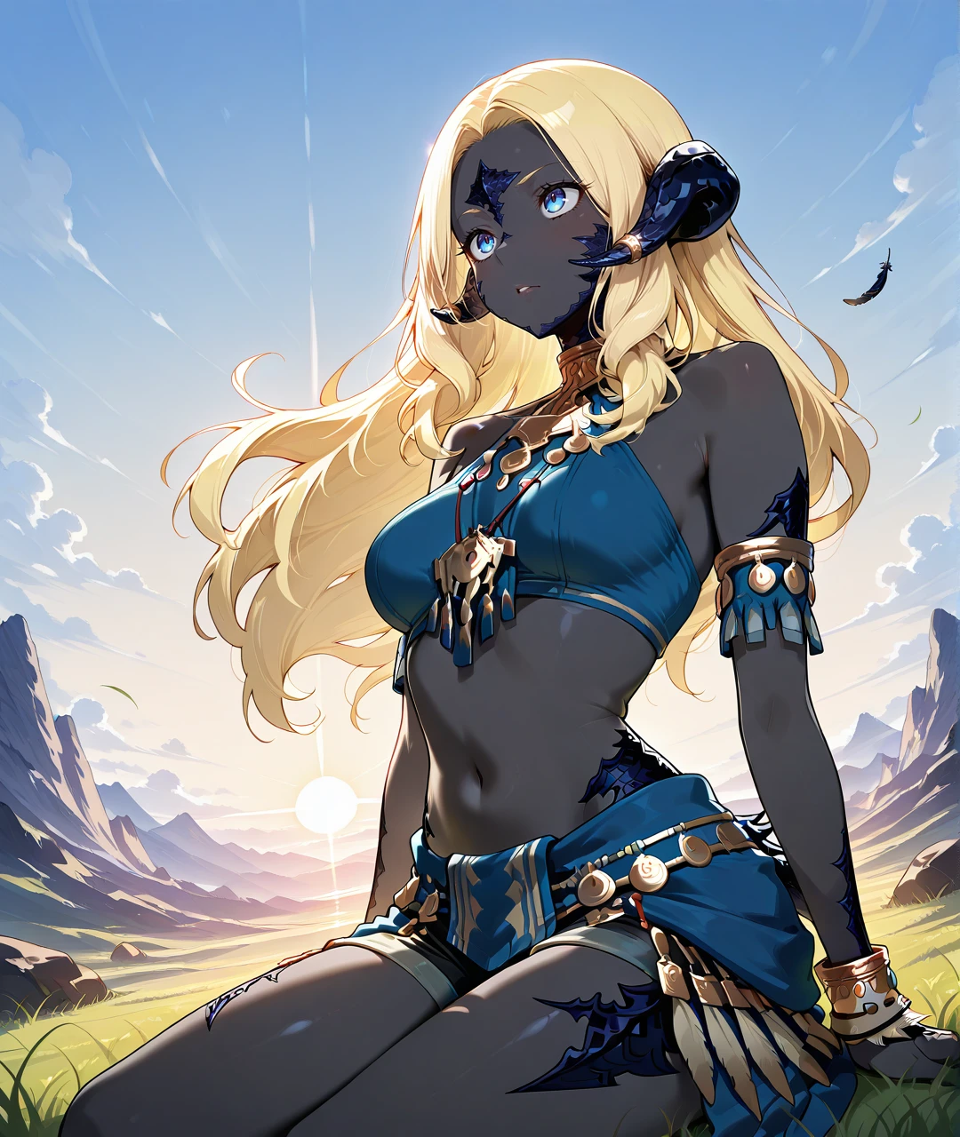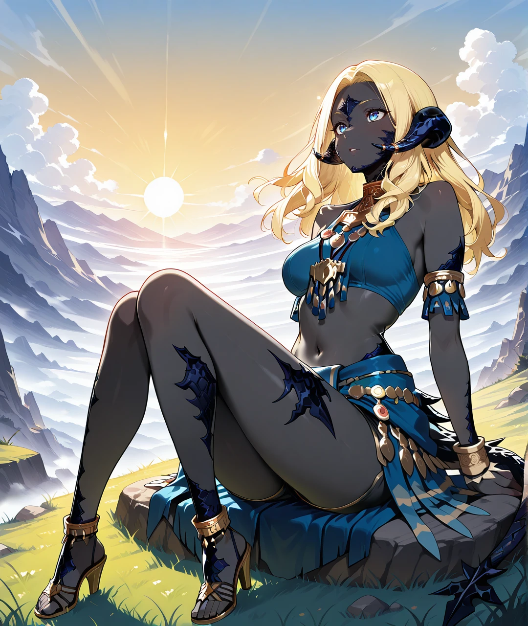 SaduBase, au ra, black dragon horns, black scales, black dragon tail, colored skin, black skin, blue eyes, blonde hair, long hair, silber rings, necklace, jewelry, shoulders, , halterneck, blue crop top, sleeveless, armlet, wristband, midriff, navel, blue sarong, coin belt, tribal, feathers, black shorts, short shorts, legs, gold high heel sandals, toes,