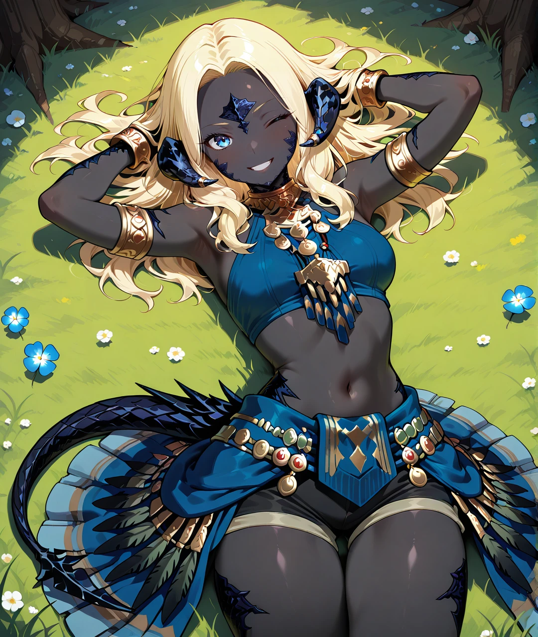 Tags: SaduBase, au ra, black dragon horns, black scales, black dragon tail, colored skin, black skin, blue eyes, blonde hair, long hair, silber rings, necklace, jewelry, bare shoulders, medium breasts, halterneck, blue crop top, sleeveless, armlet, wristband, midriff, navel, blue sarong, coin belt, tribal, feathers, black shorts, short shorts, bare legs, gold high heel sandals, toes,