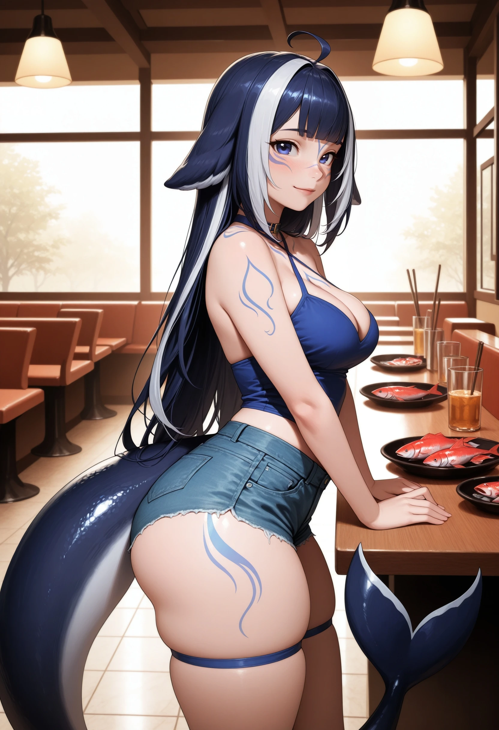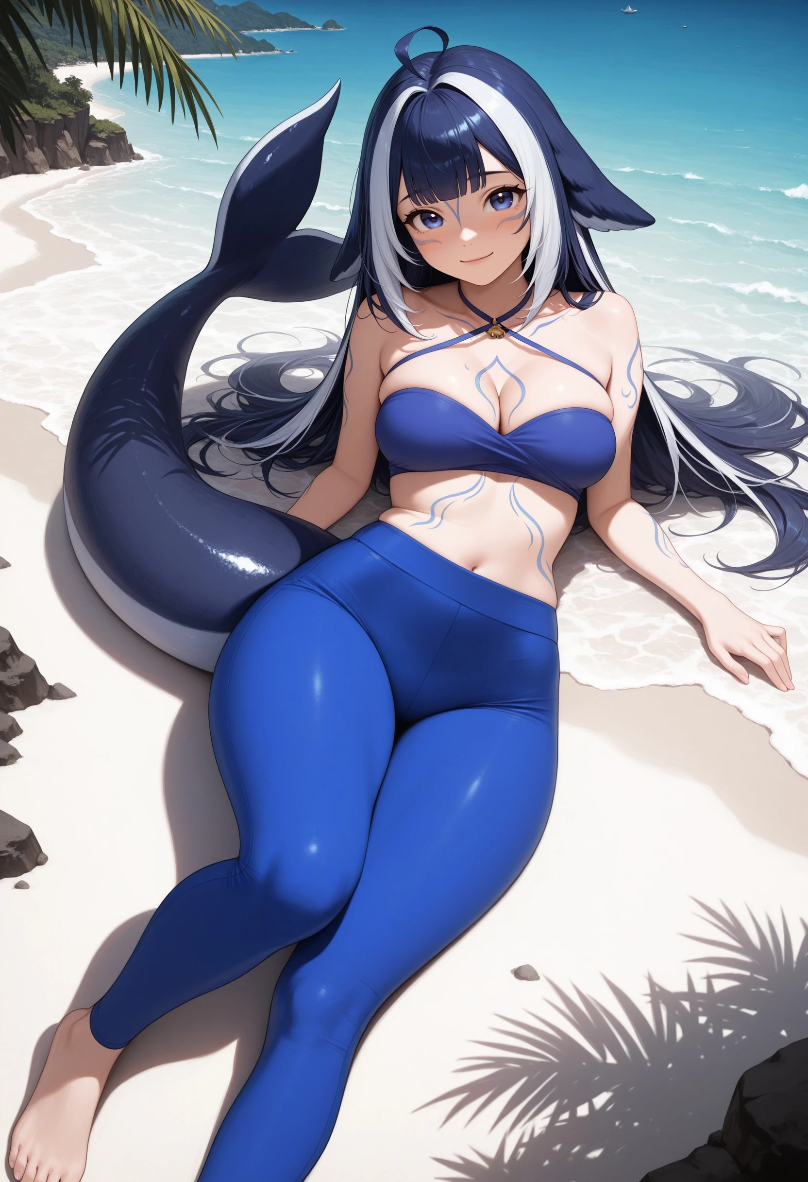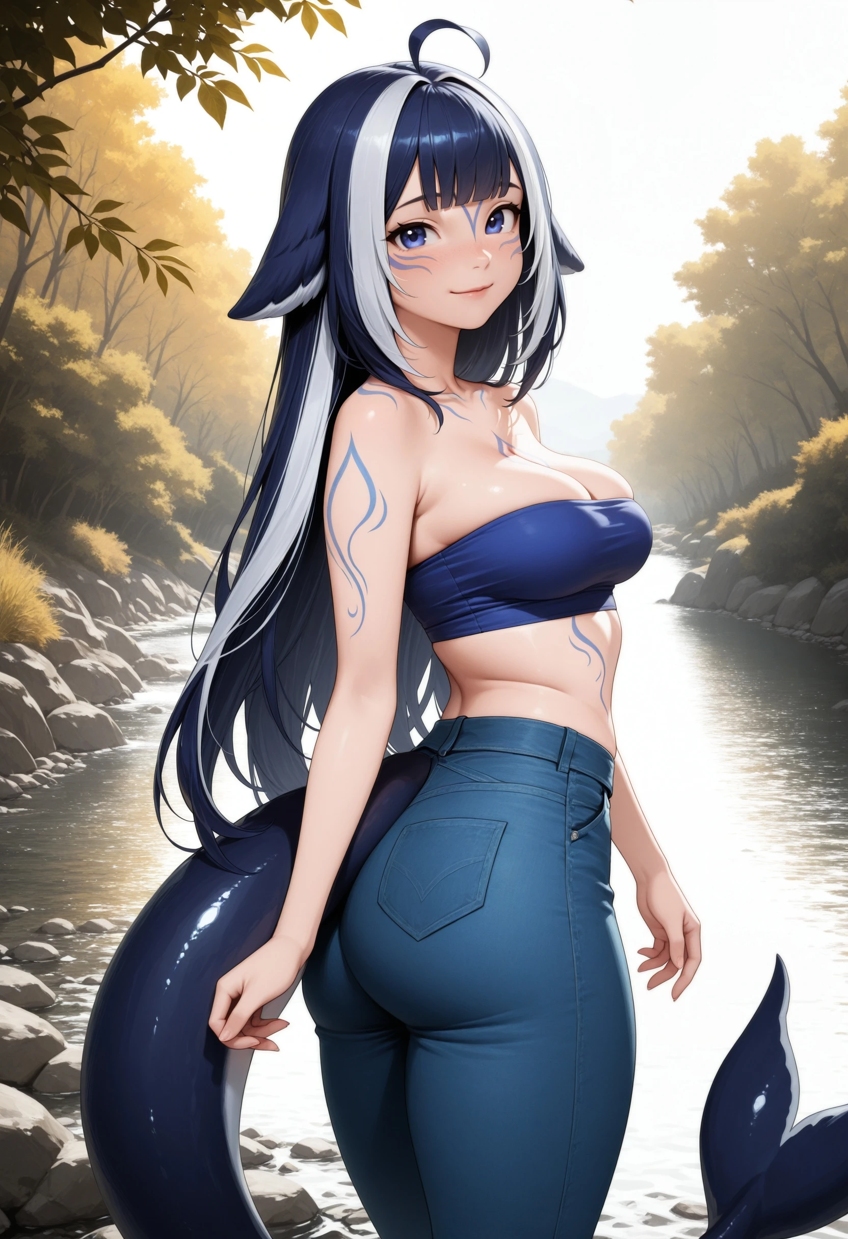 (Positive Prompts) shylily, monster girl, fish tail, tail, multicolored hair, streaked hair, long hair, blue hair, ahoge, blue eyes, blue tattoos,