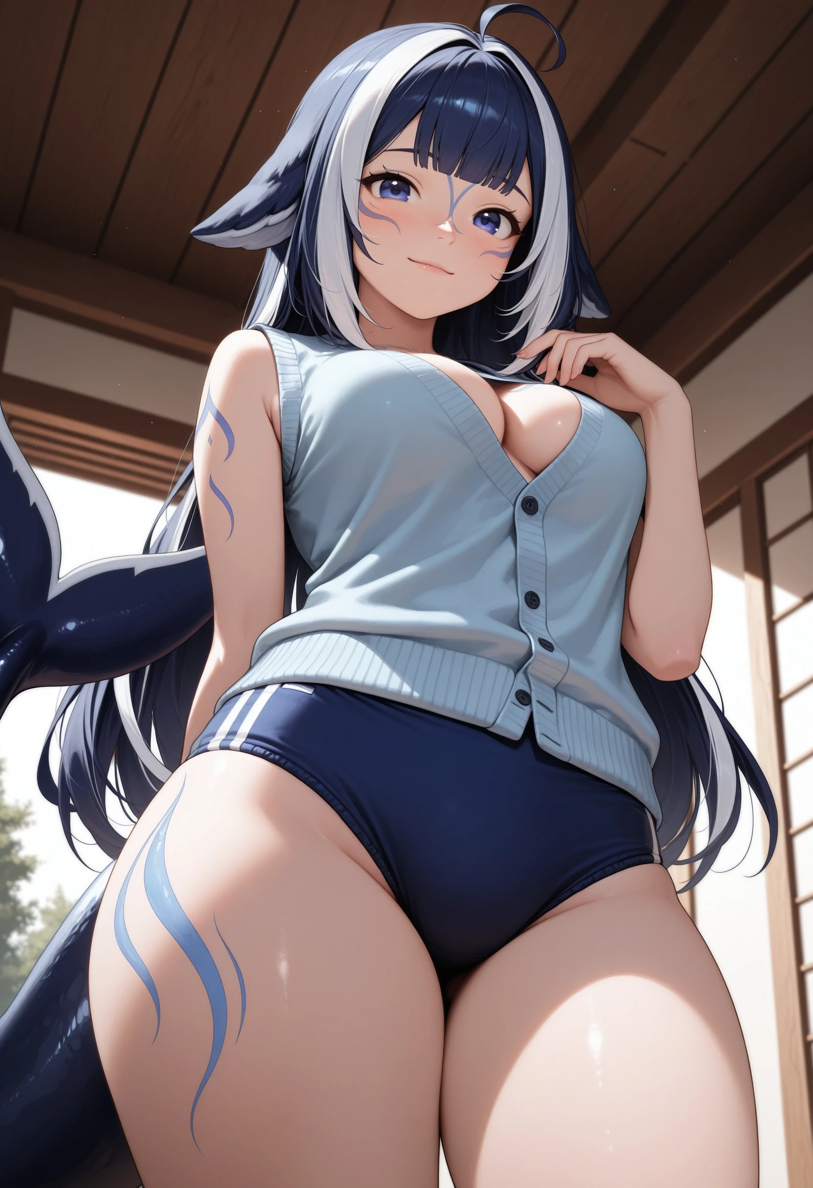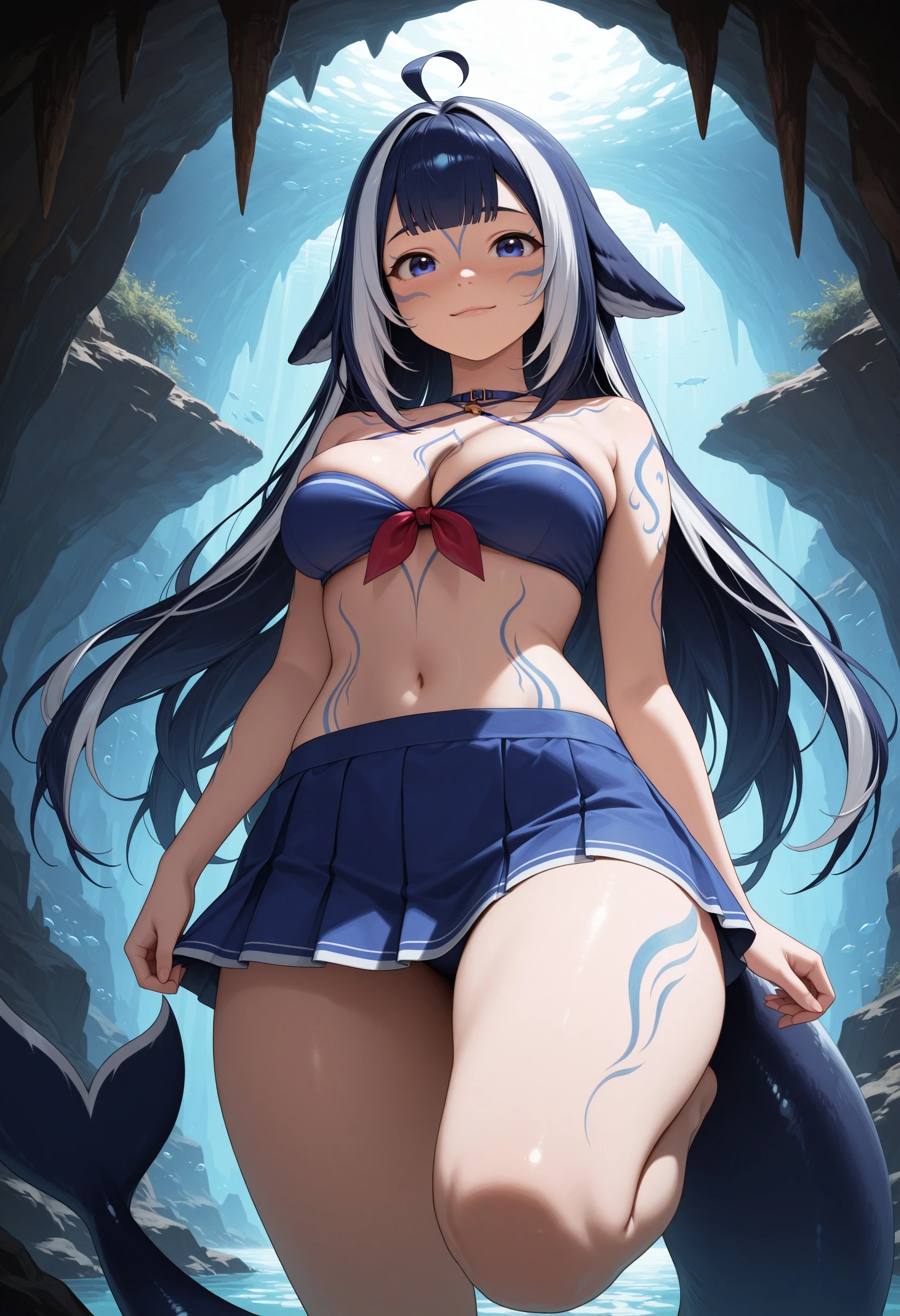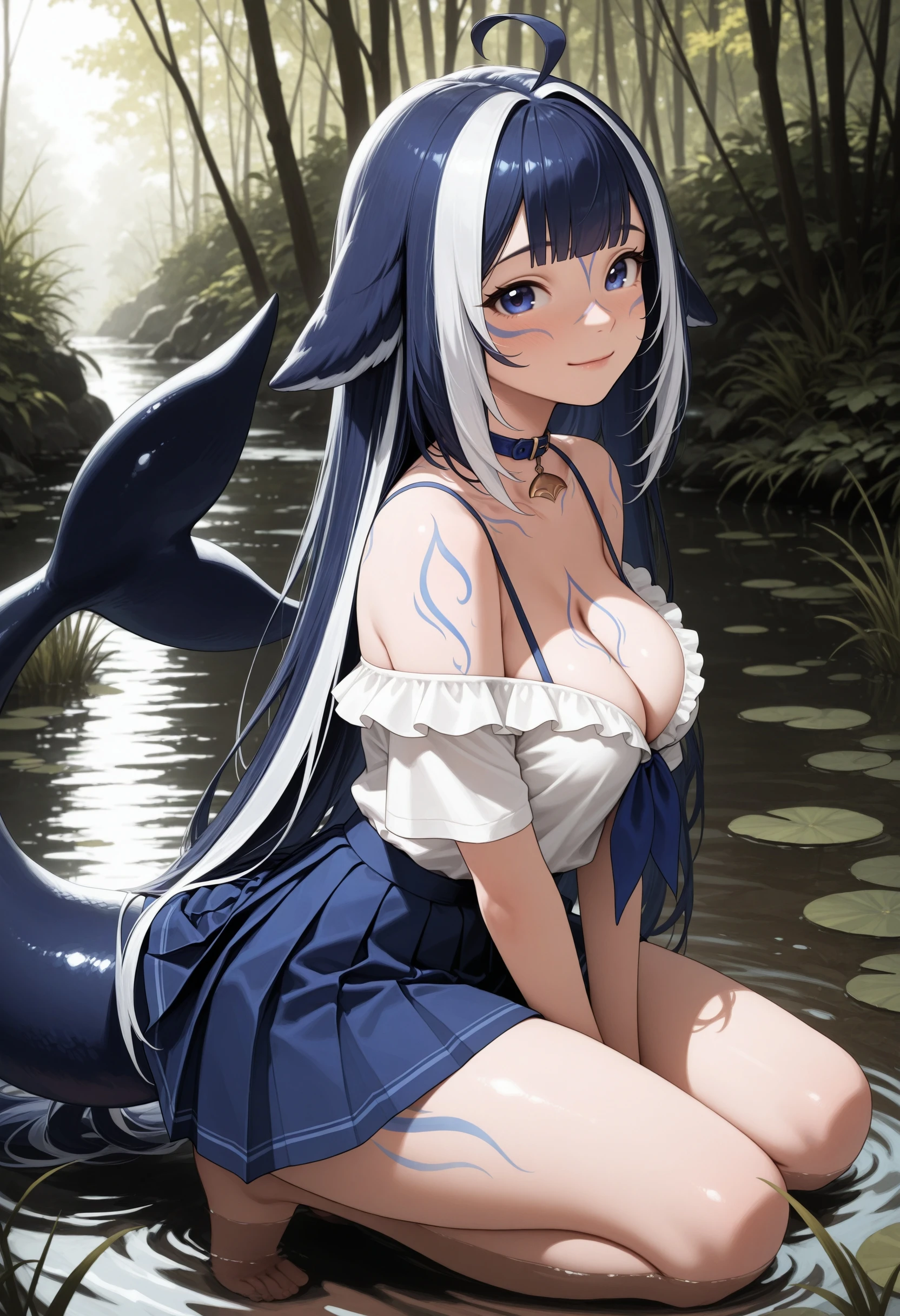 (Positive Prompts) shylily, monster girl, fish tail, tail, multicolored hair, streaked hair, long hair, blue hair, ahoge, blue eyes, blue tattoos,