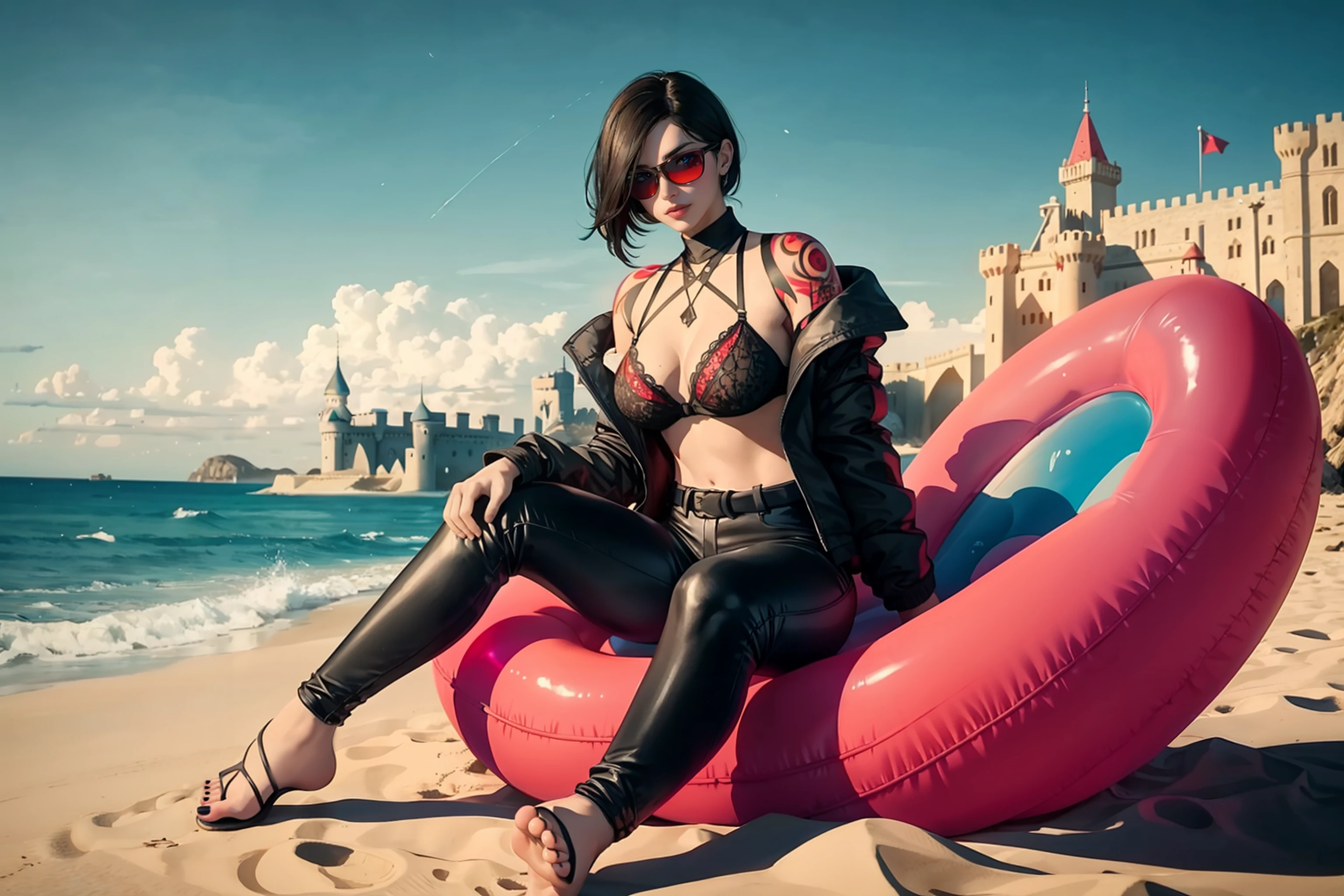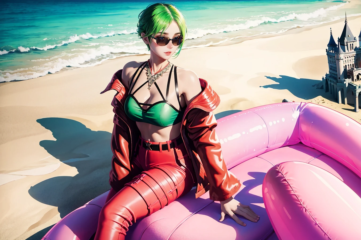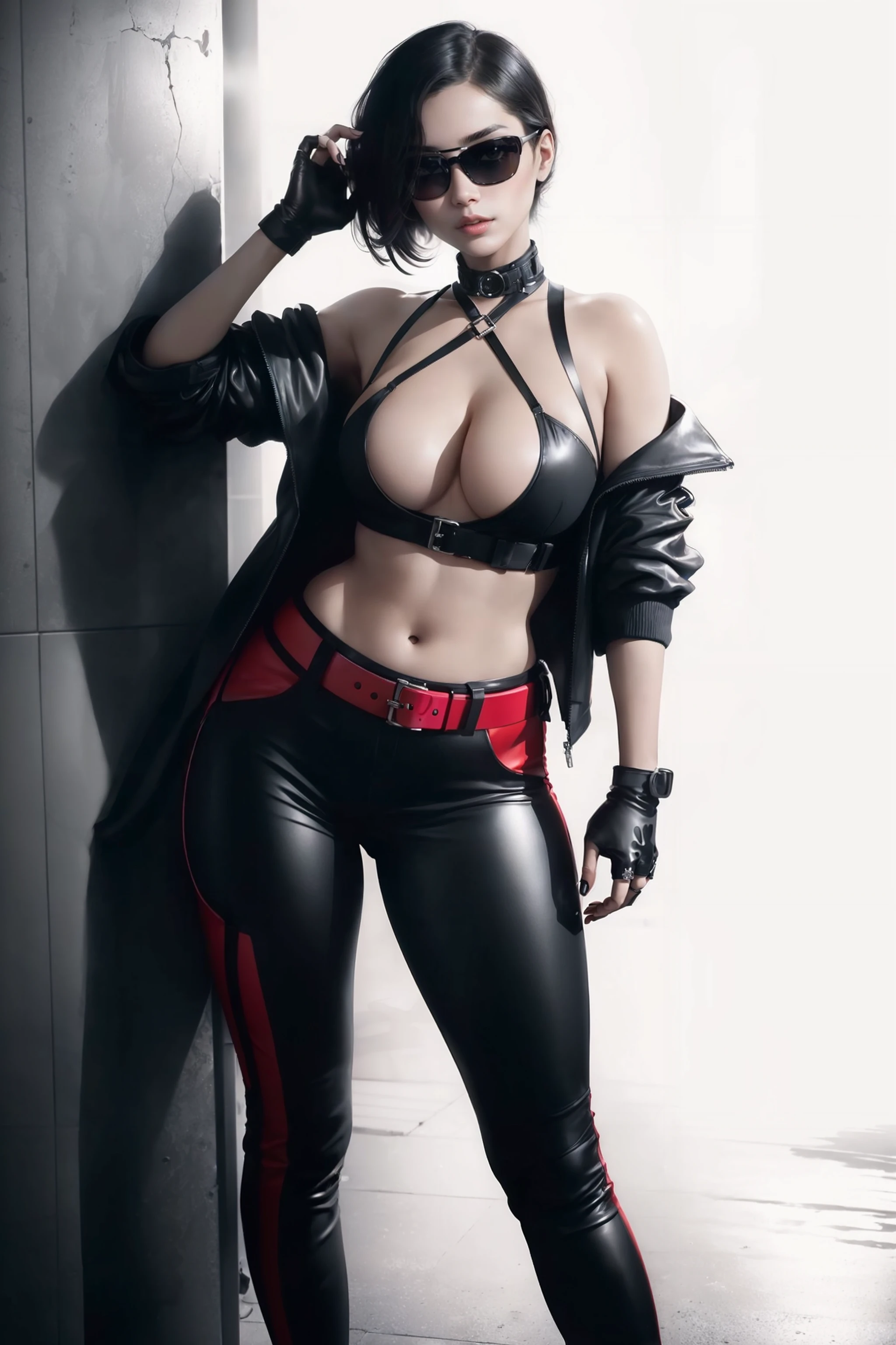 JetAugmentedHuman, mask, leather outfit, a pair of sunglasses, futuristic suit, lacy collar, off the shoulders jacket, sleeves pushed up, red pants, belt, white boots