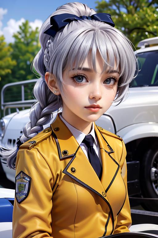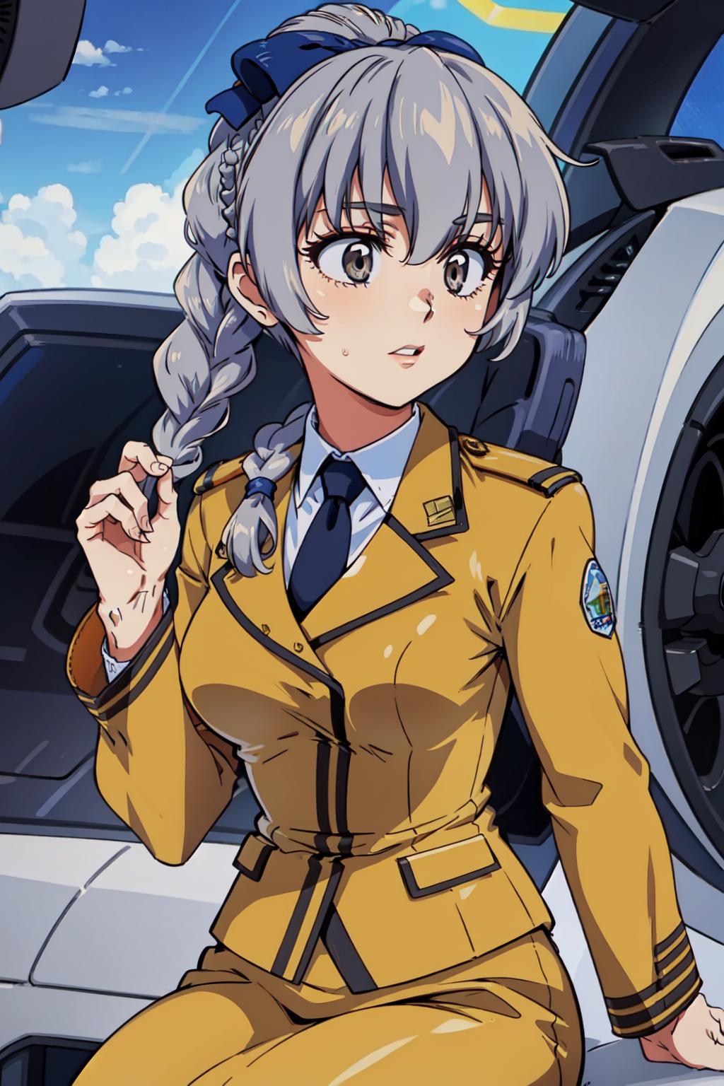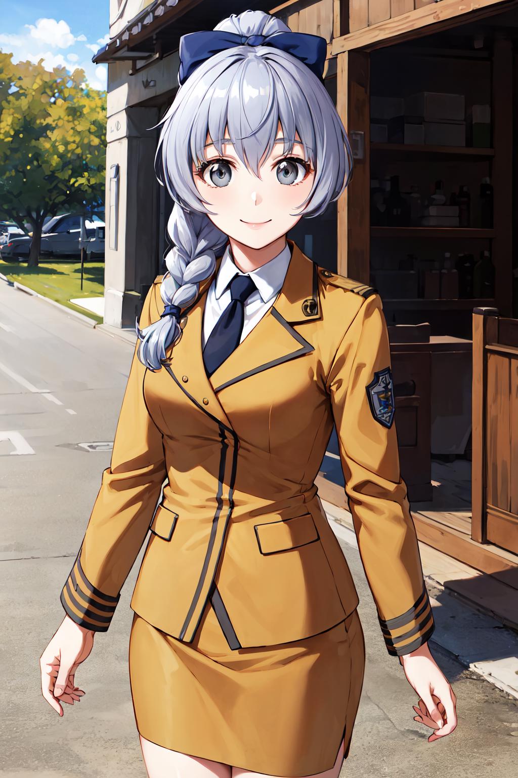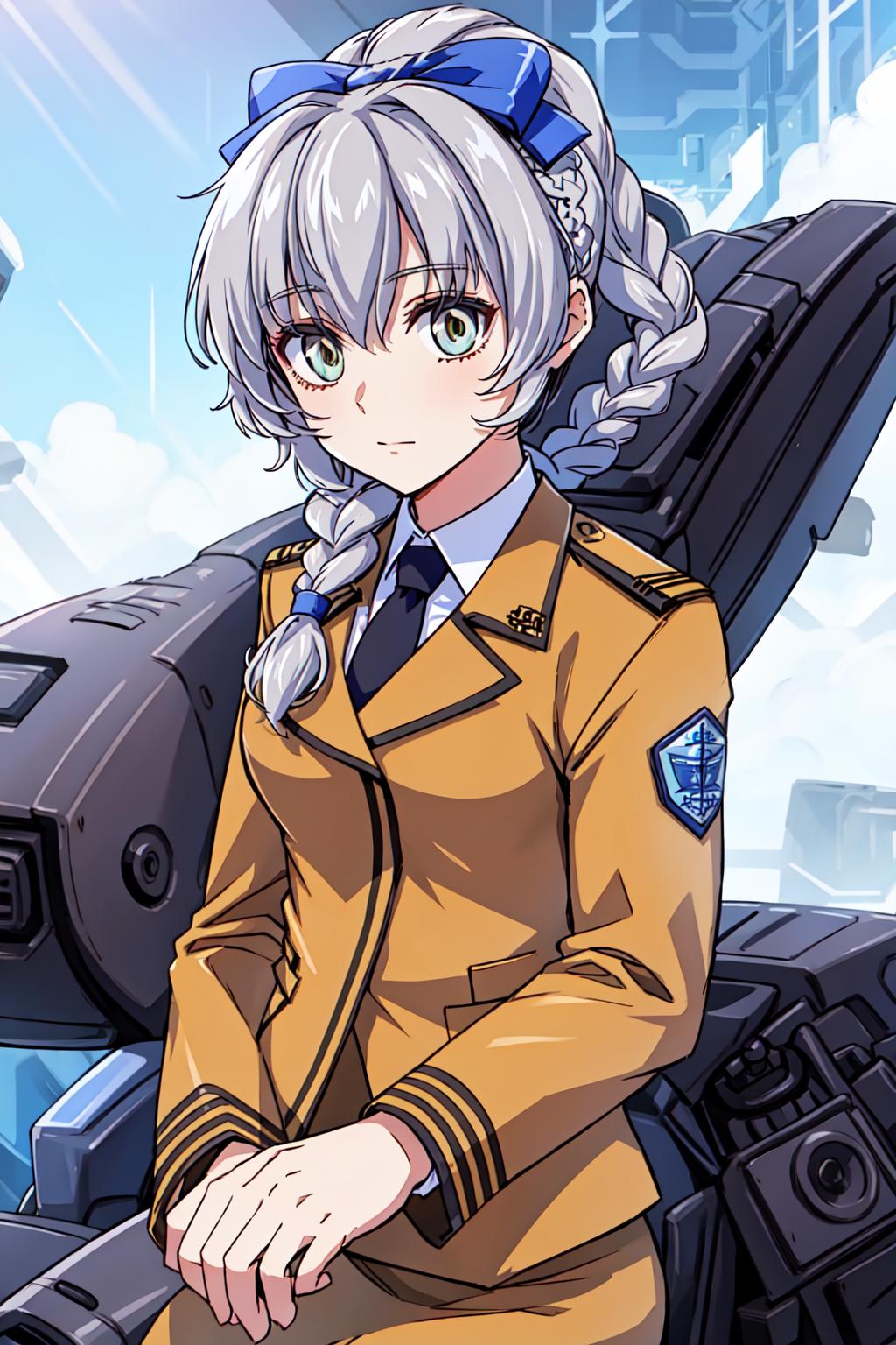 outfit11girl, solo, braided ponytail, single braid, grey eyes, grey hair, military uniform, black necktie, blue bow, brown skirt