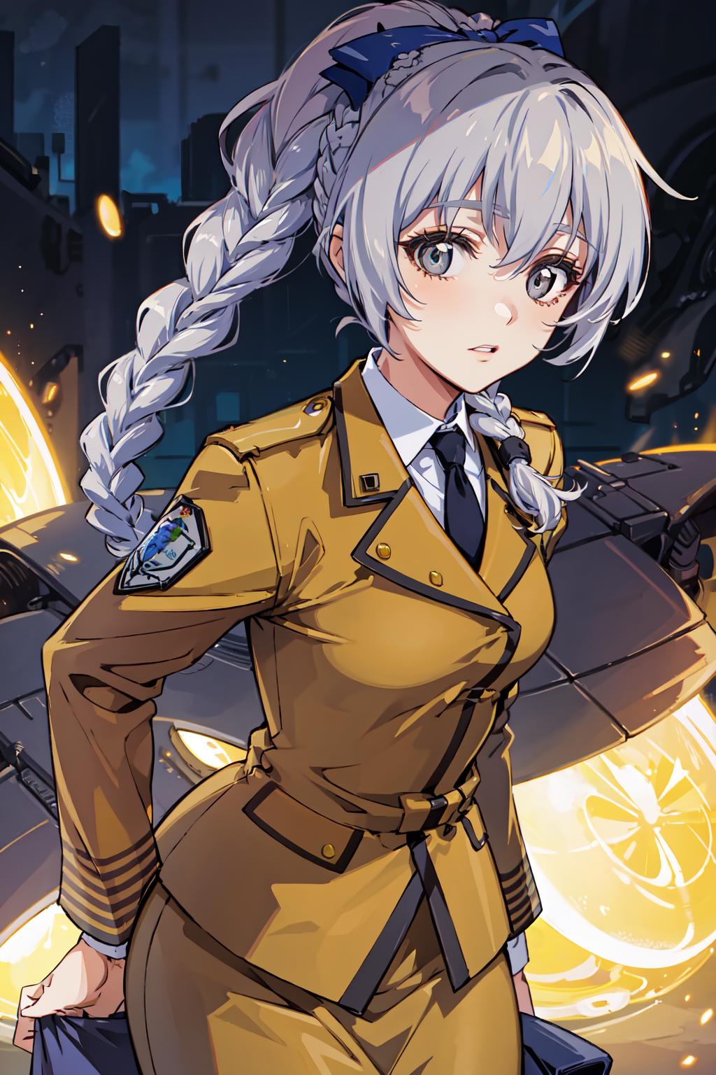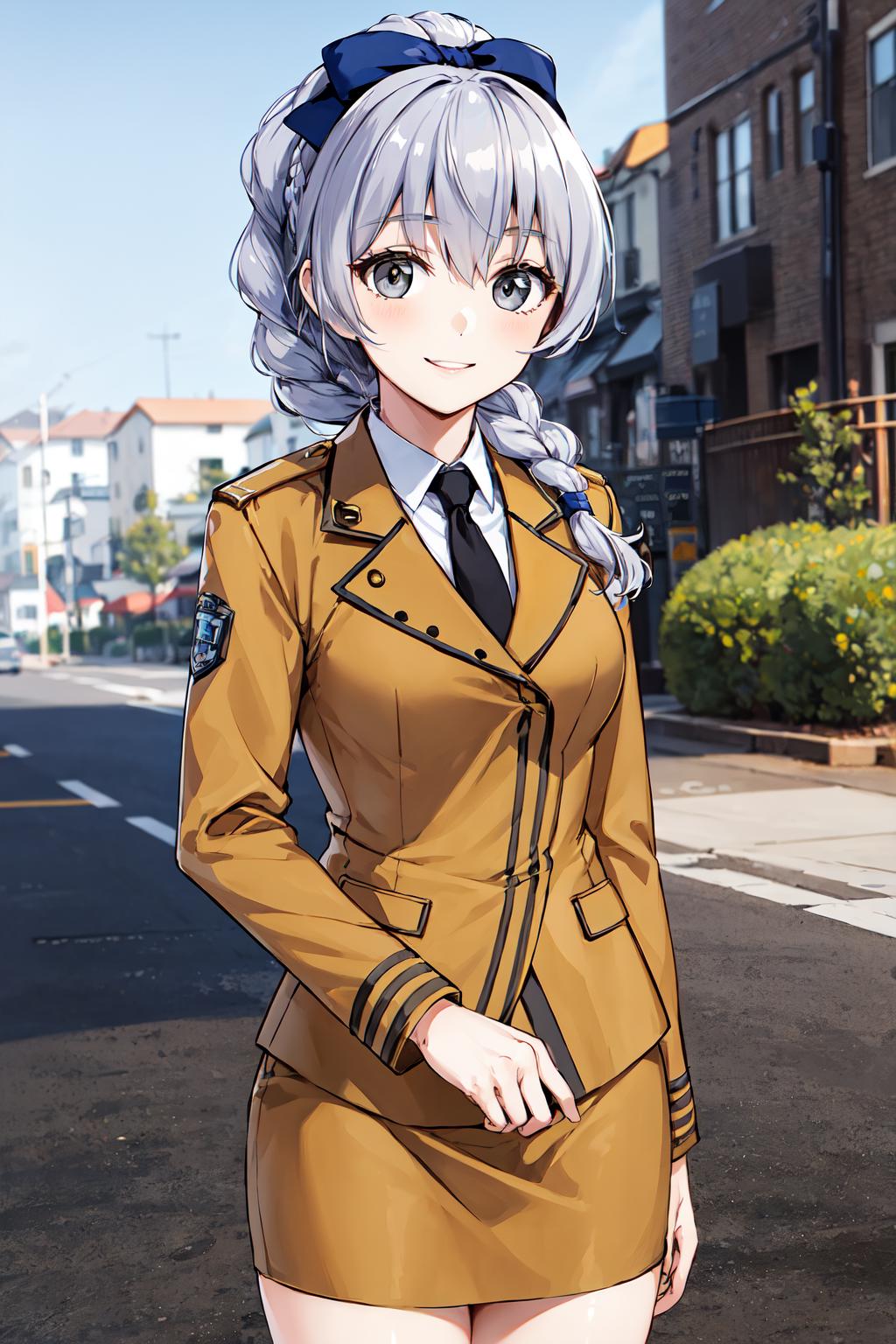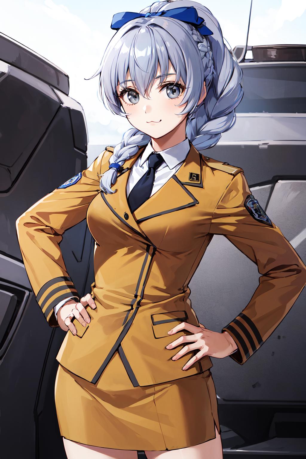 1girl, solo, braided ponytail, single braid, grey eyes, grey hair, military uniform, black necktie, blue bow, brown skirt,