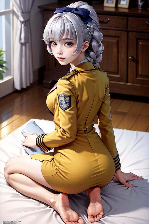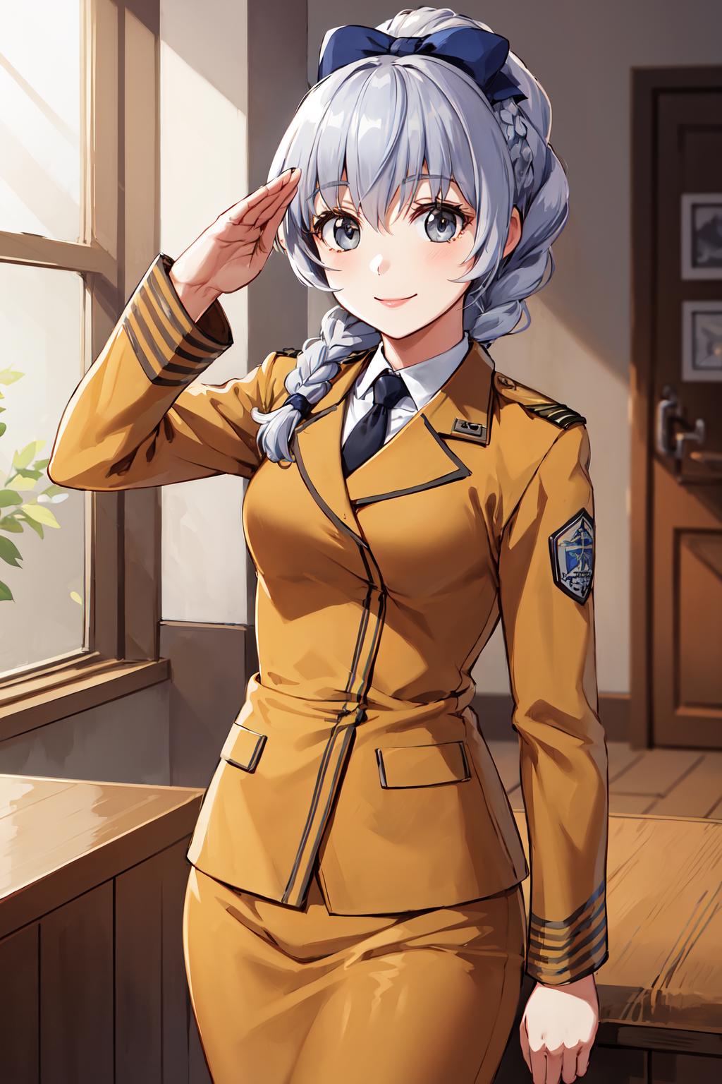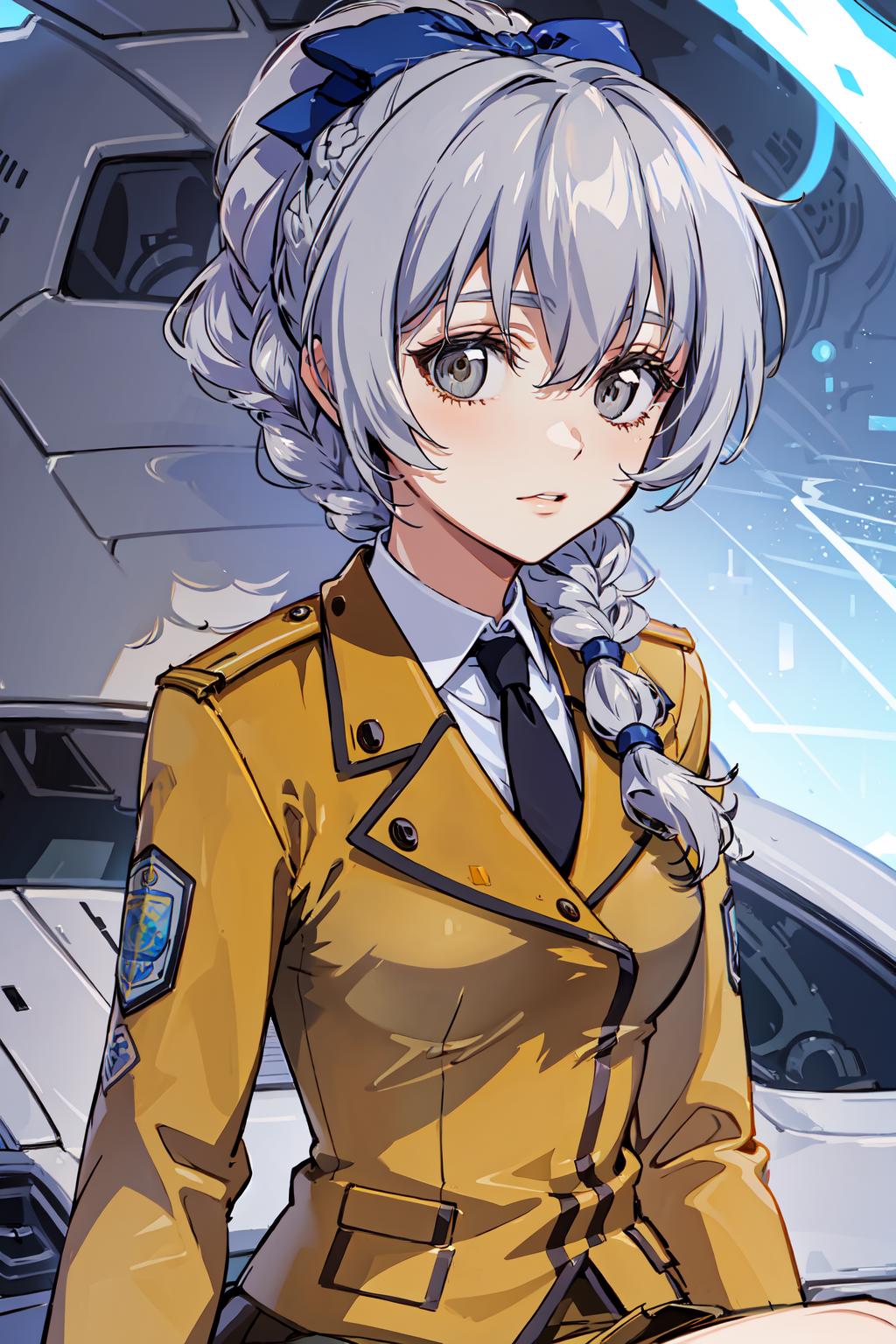 1girl, solo, braided ponytail, single braid, grey eyes, grey hair, military uniform, black necktie, blue bow, brown skirt,