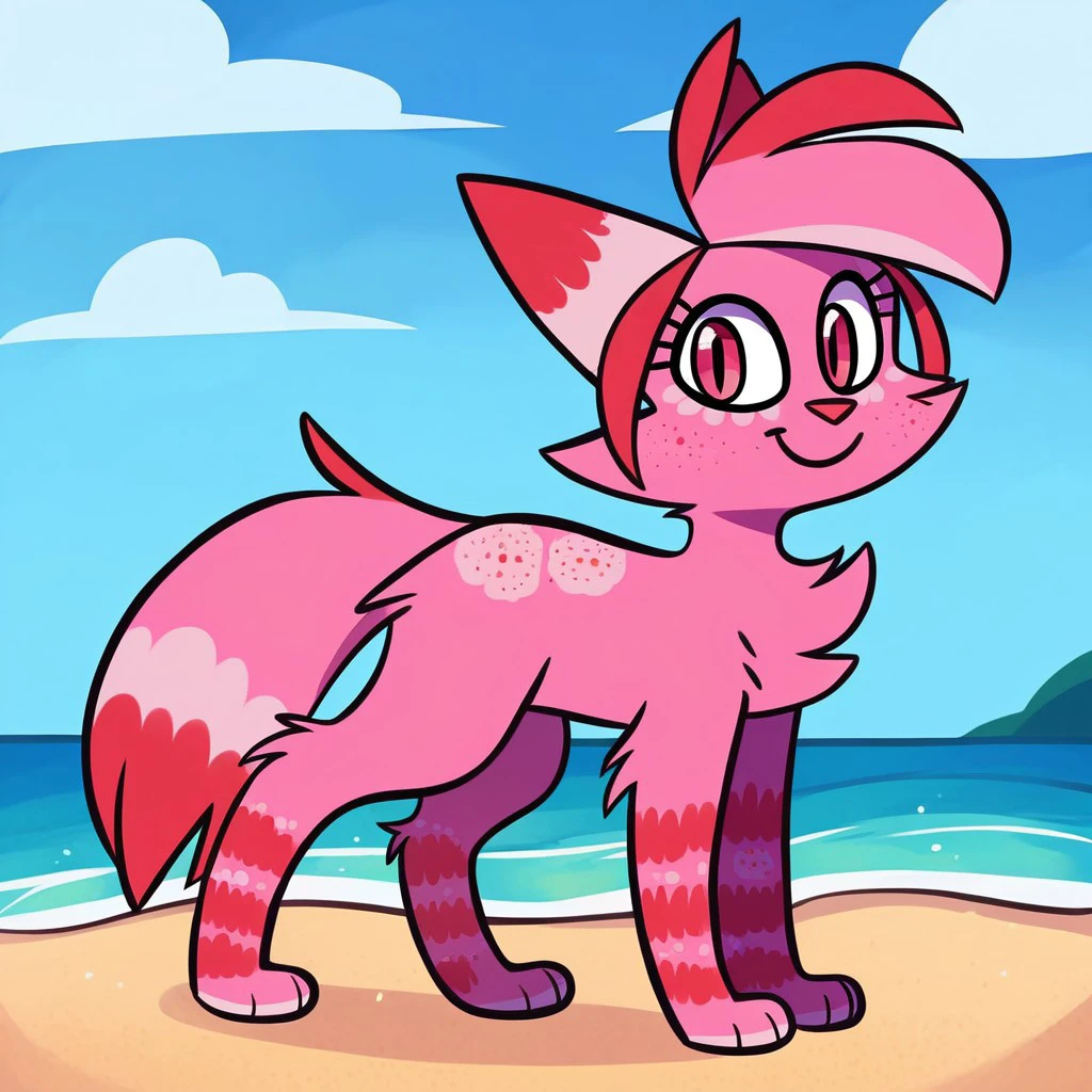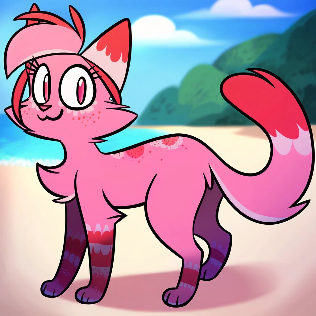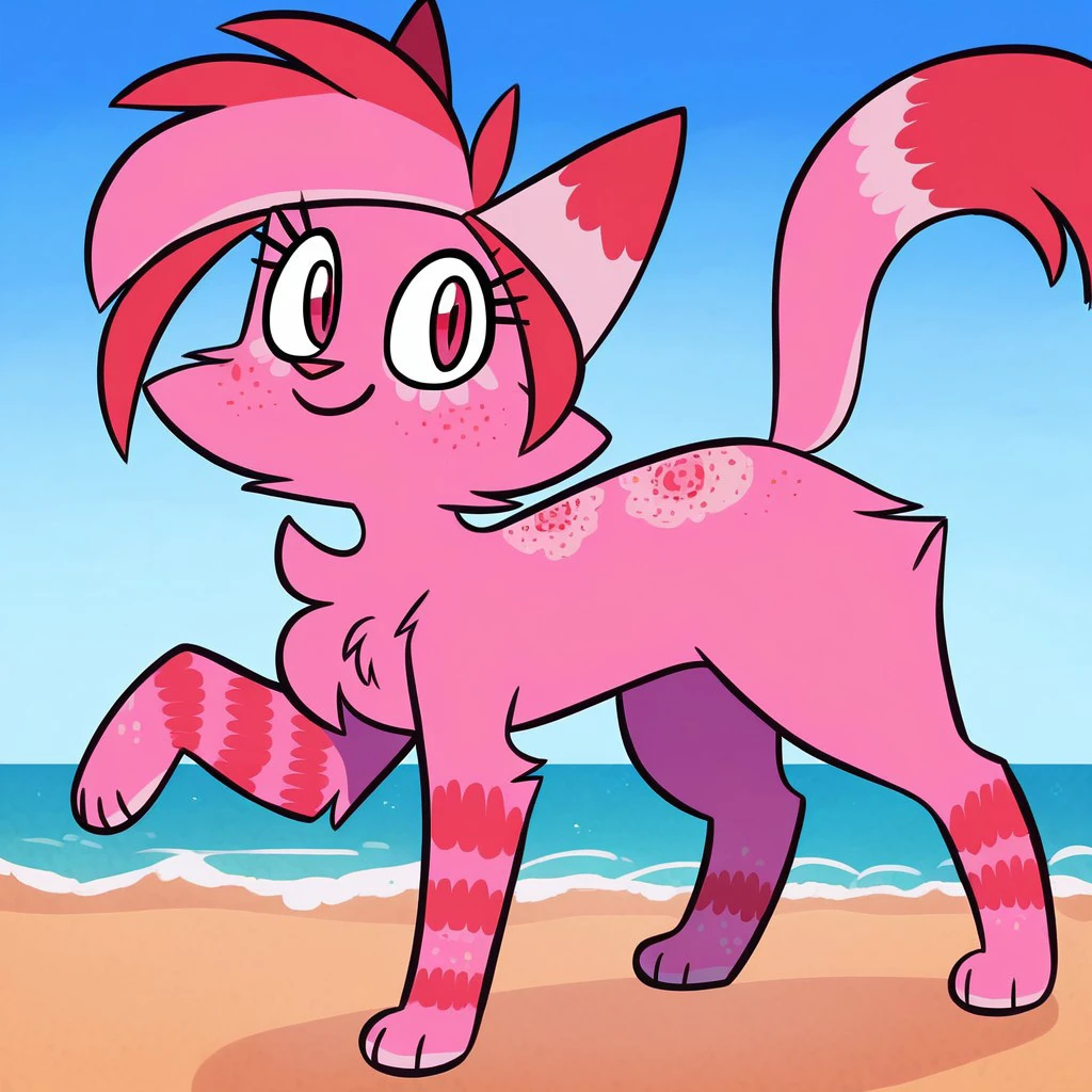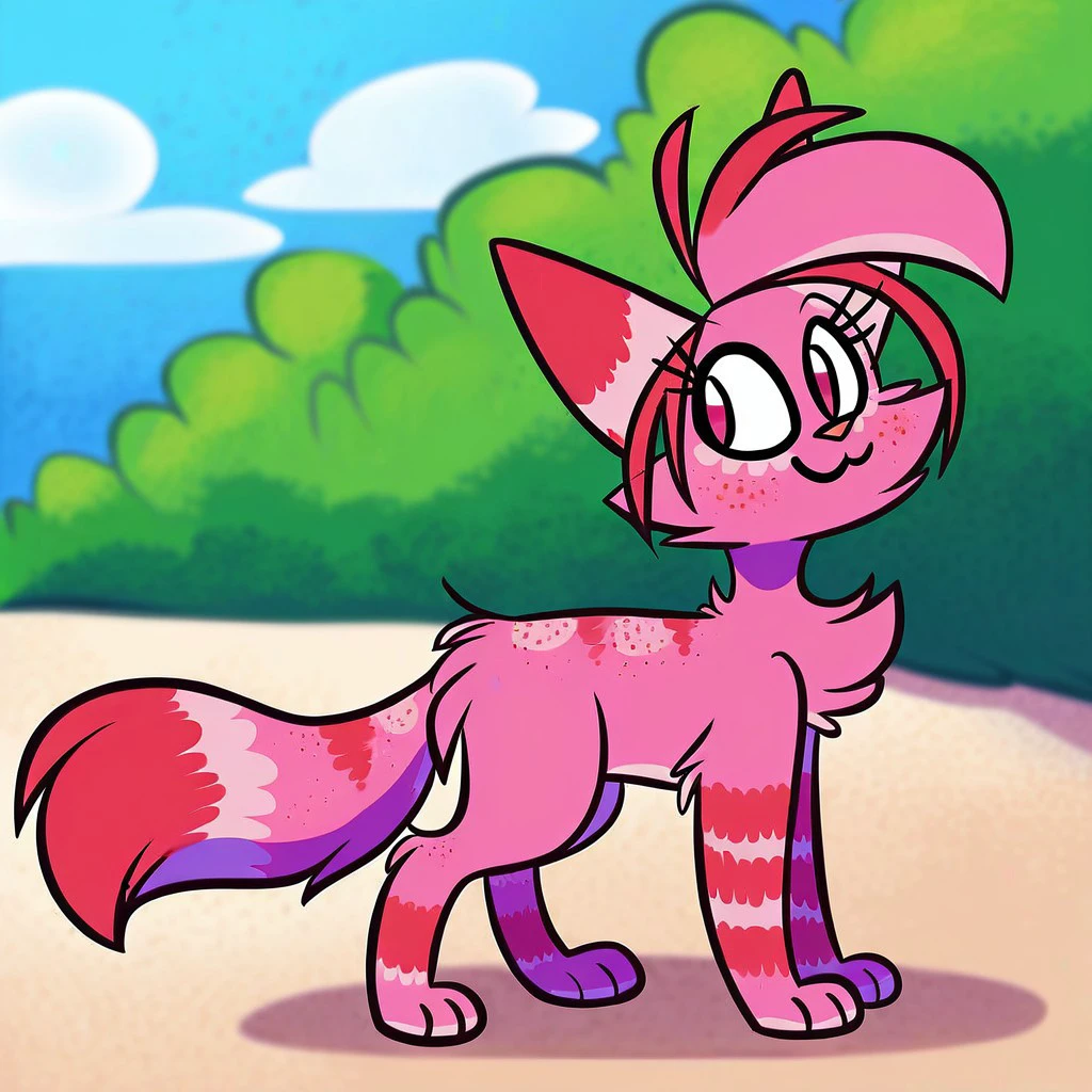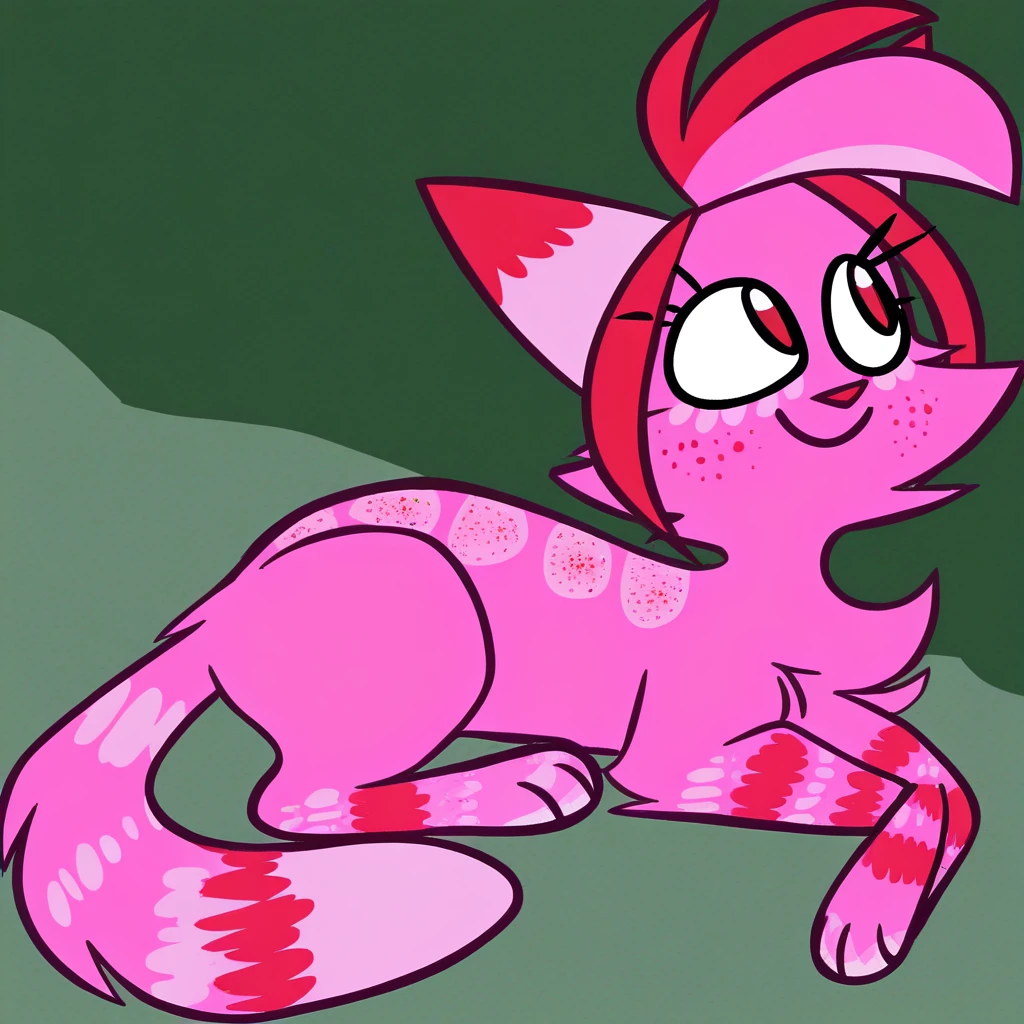 Jasmine Fragrance, solo, furry, cute, feral, 1girl, cat, catgirl, pink fur, fluffy tail, eyelashes, pink red eyes, pink red nose, pink tips hair, red tips tail, cat nose, pink/red fur smile, long tail, red hair bangs, pink red freckles, striped legs,