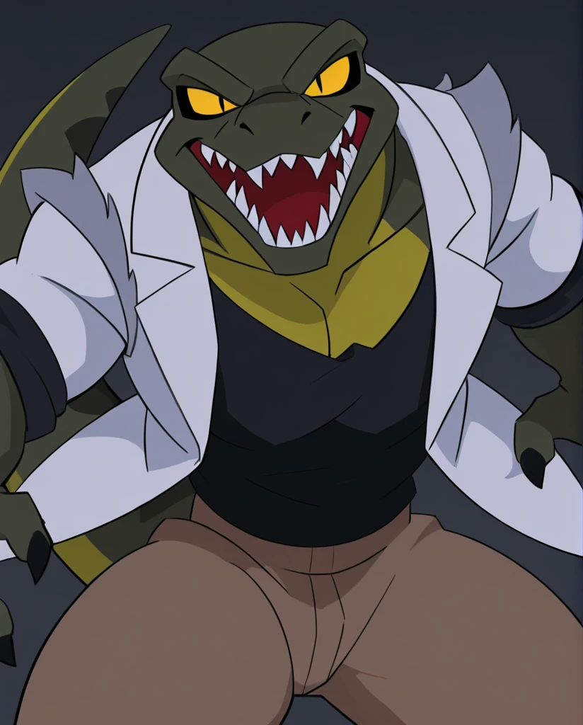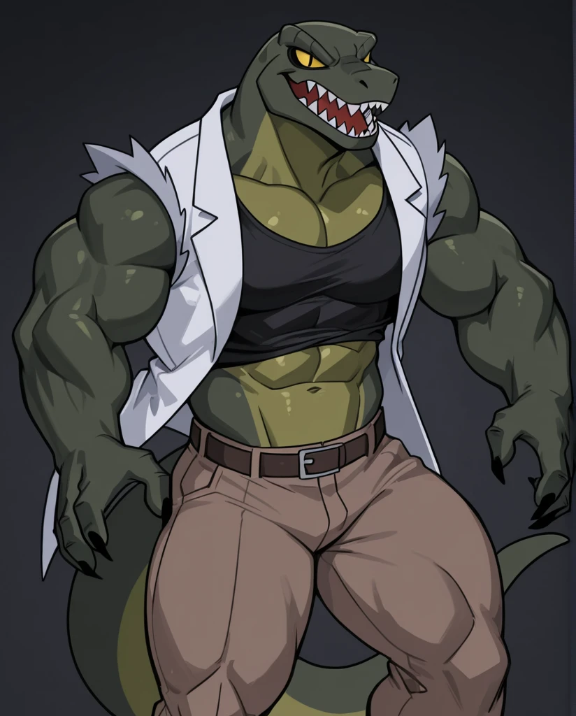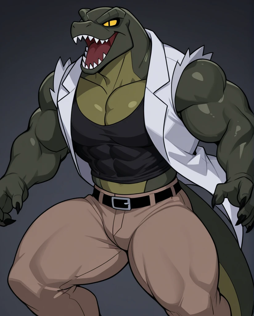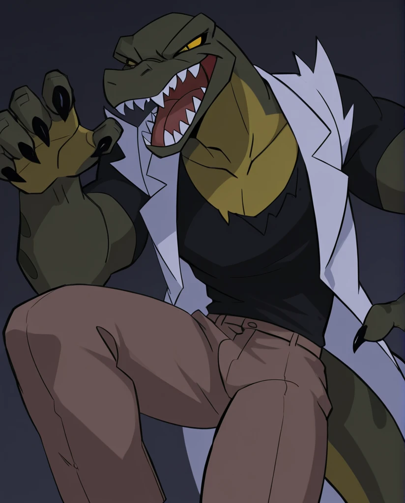 The_Lizard_Spectacular, lizard, green body, yellow chest, claws, sharp teeth, yellow eyes, black pupil, slit pupil, no sclera, tail, rip black shirt, rip white coat, rip brown pants,