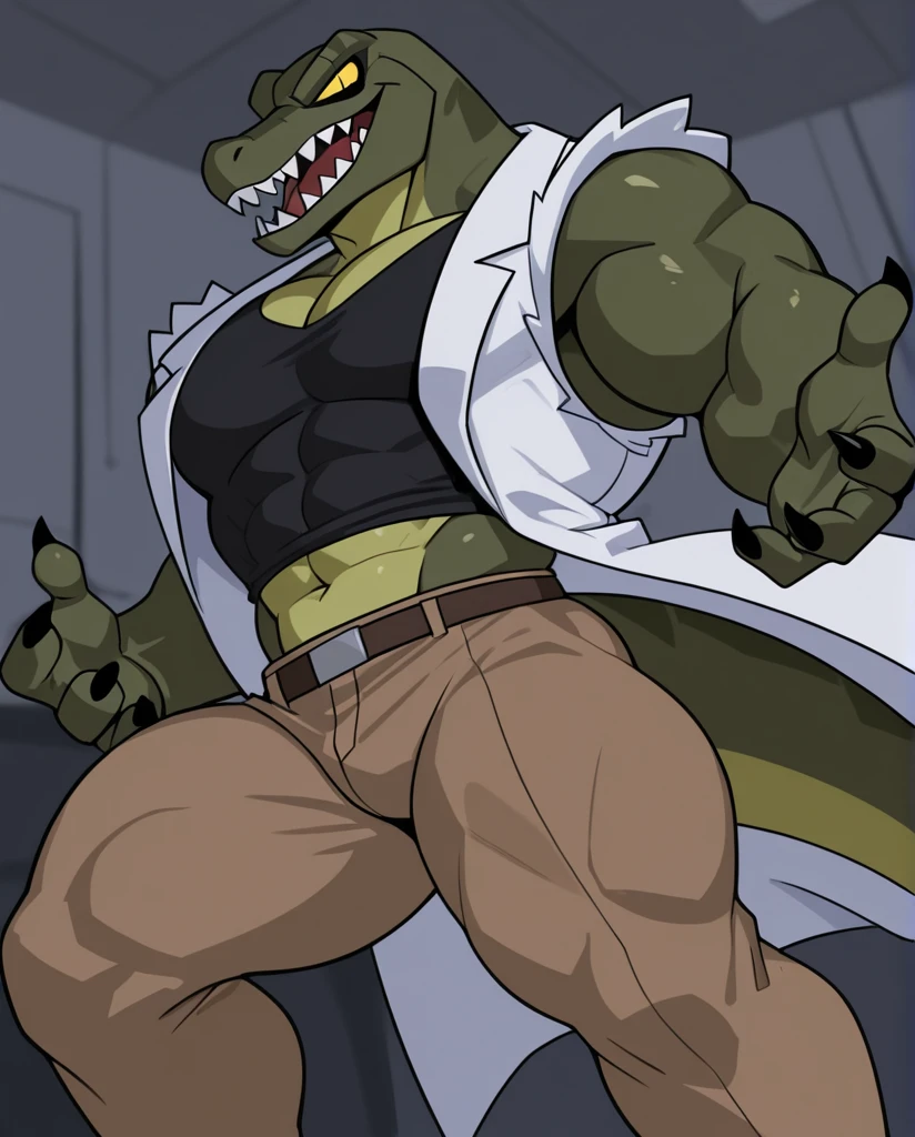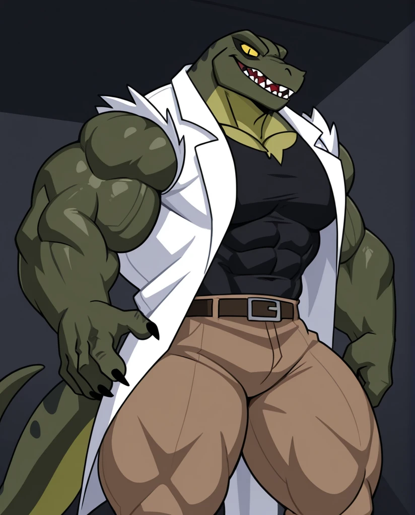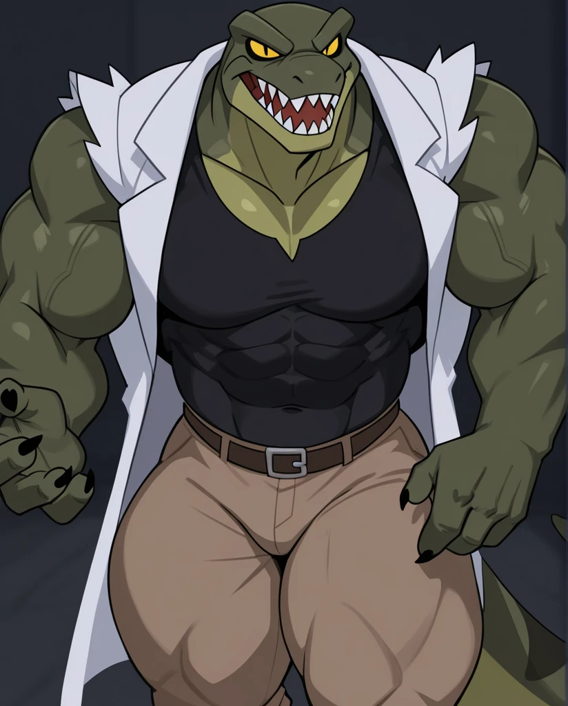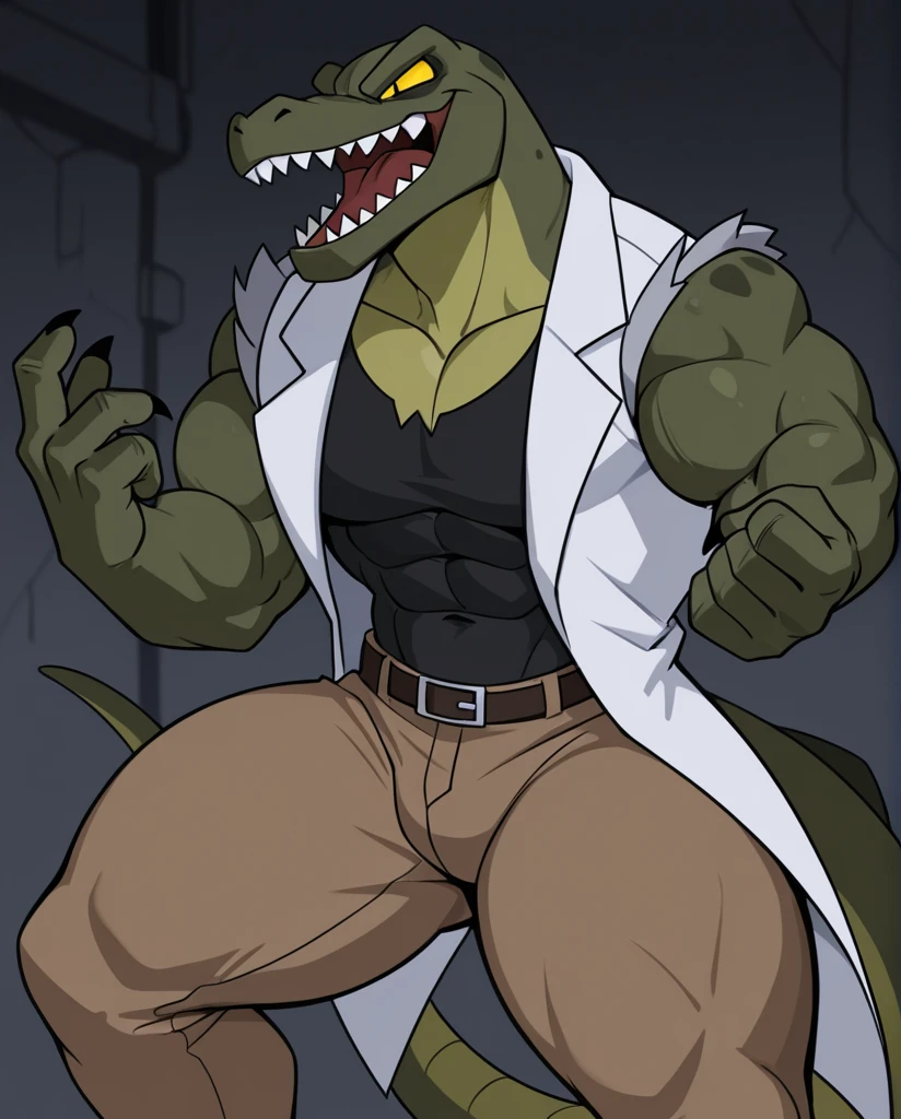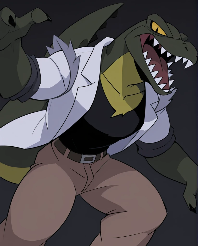The_Lizard_Spectacular, lizard, green body, yellow chest, claws, sharp teeth, yellow eyes, black pupil, slit pupil, no sclera, tail, rip black shirt, rip white coat, rip brown pants,
