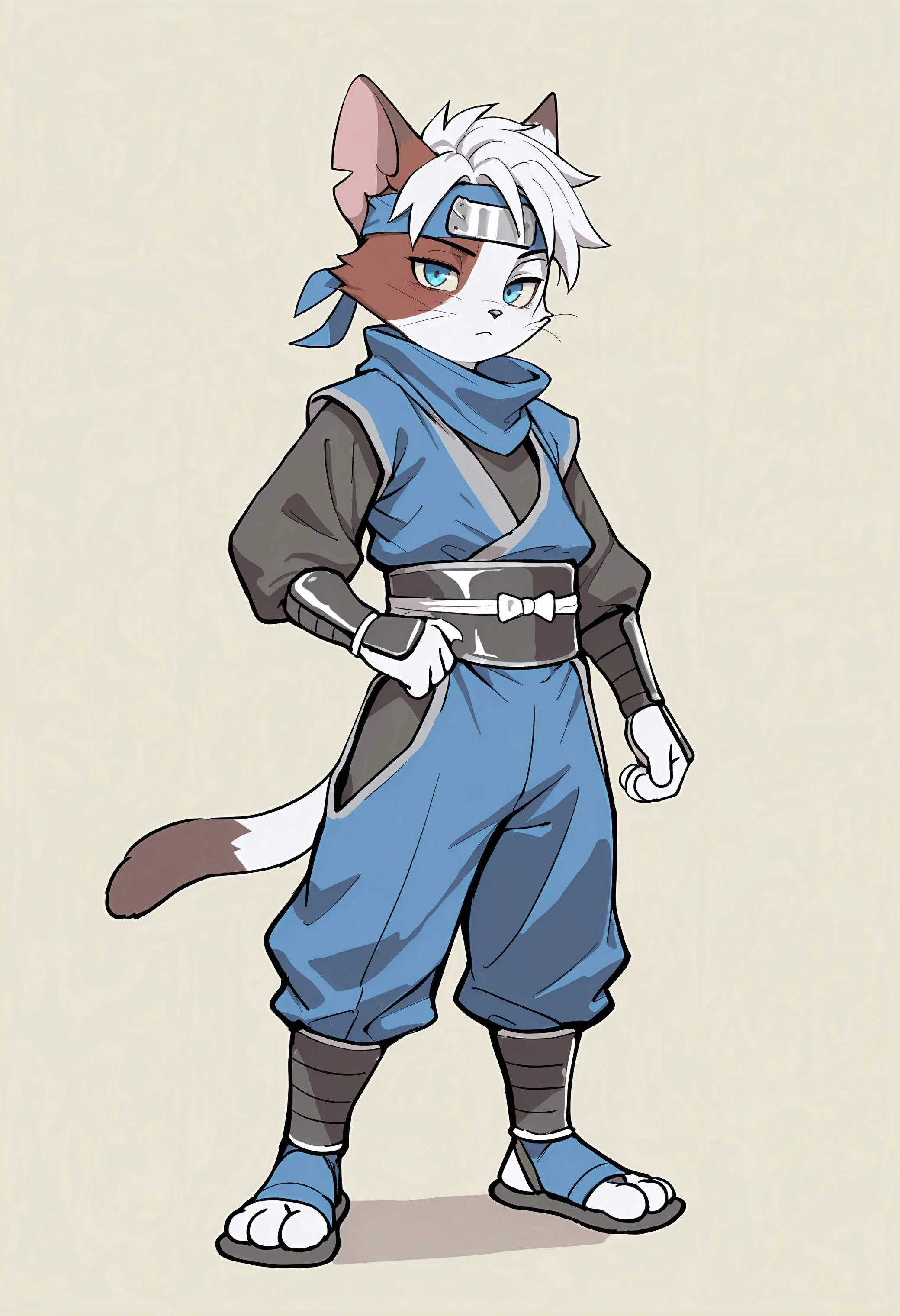 Illustrious V1: best quality, amazing quality, very aesthetic, absurdres, newest,  5yru5, taj_ch45e, 1boy, solo, furry, furry male, blue eyes, white hair, cat ears, ninja, blue headband, ...your tags...