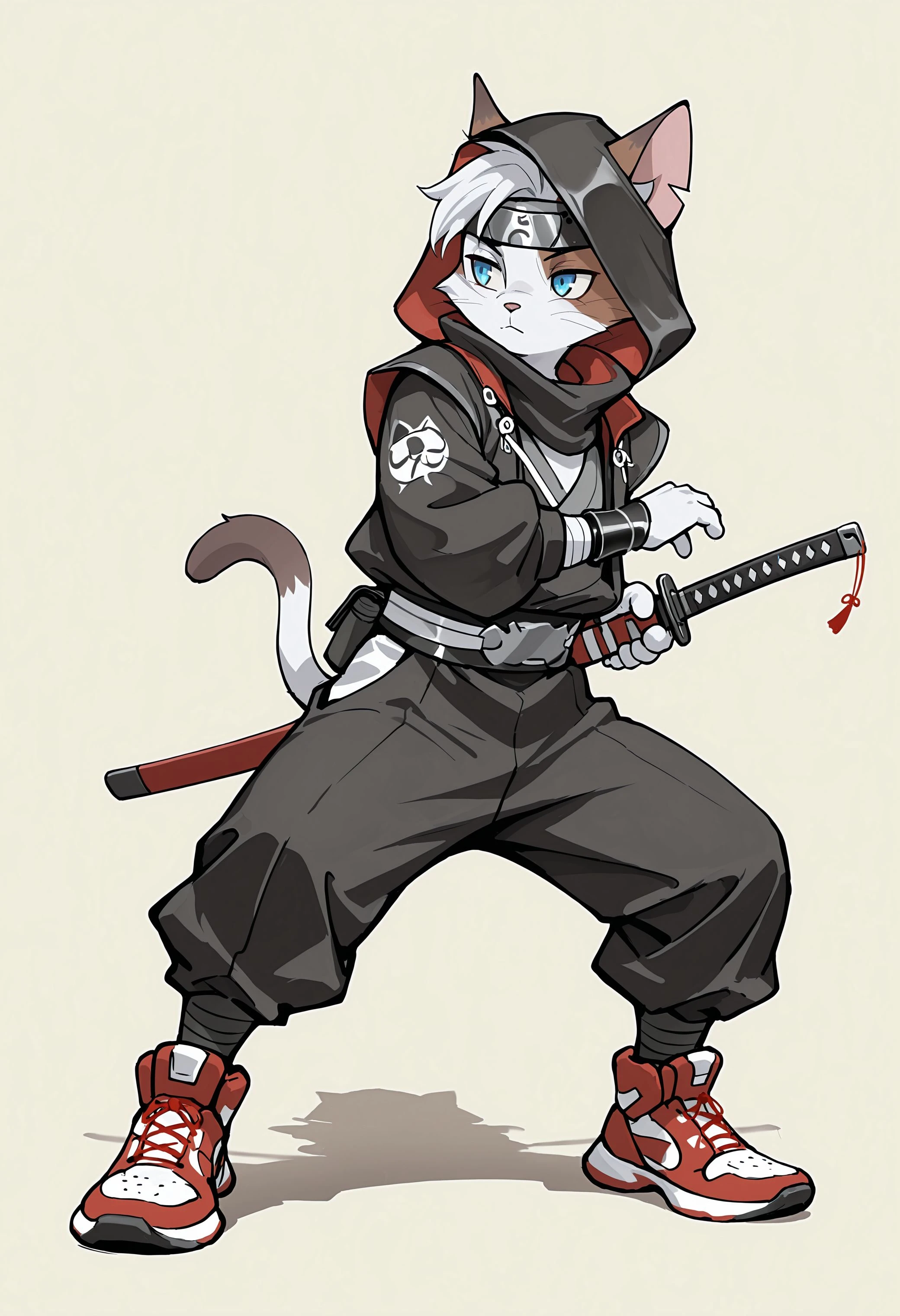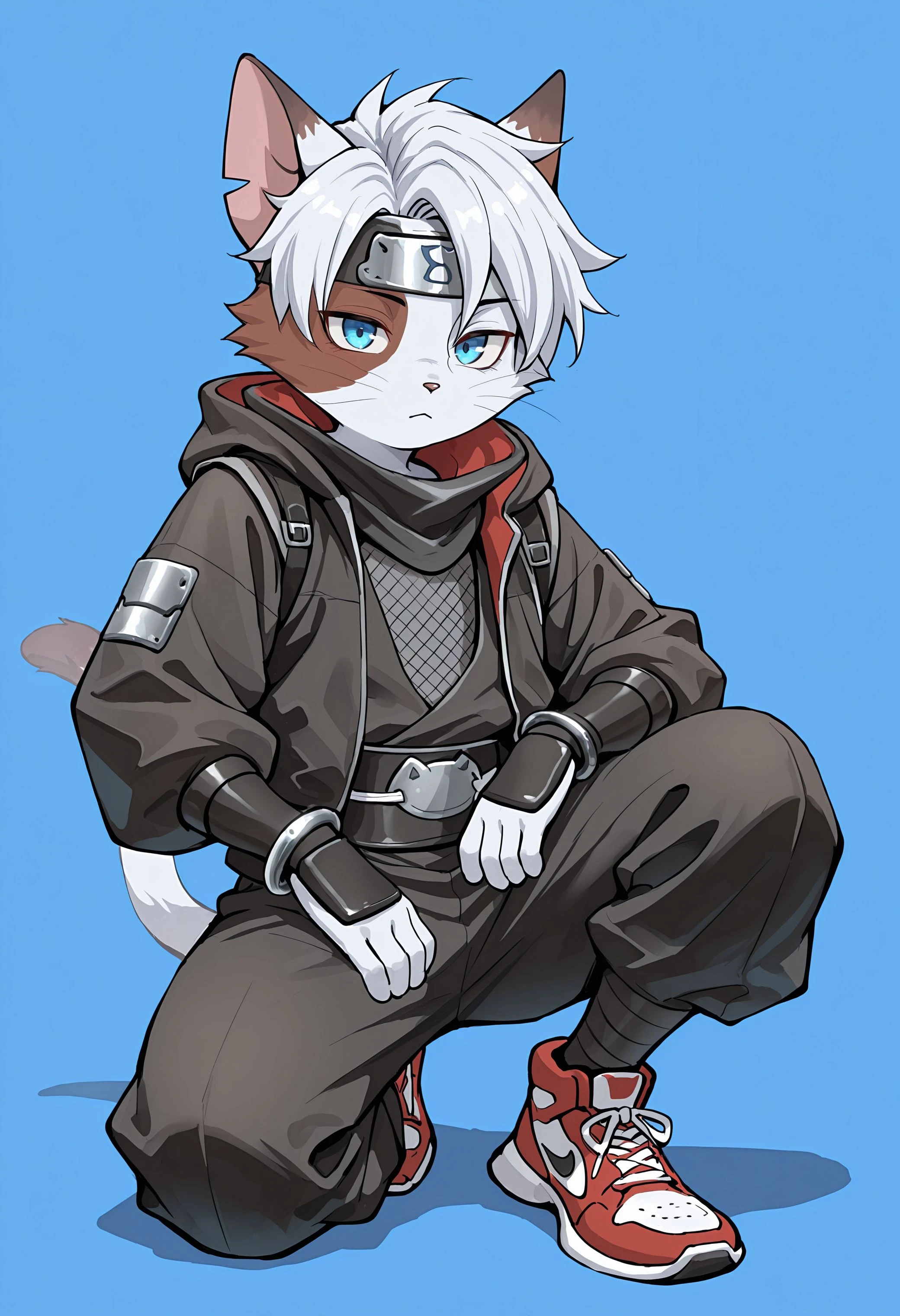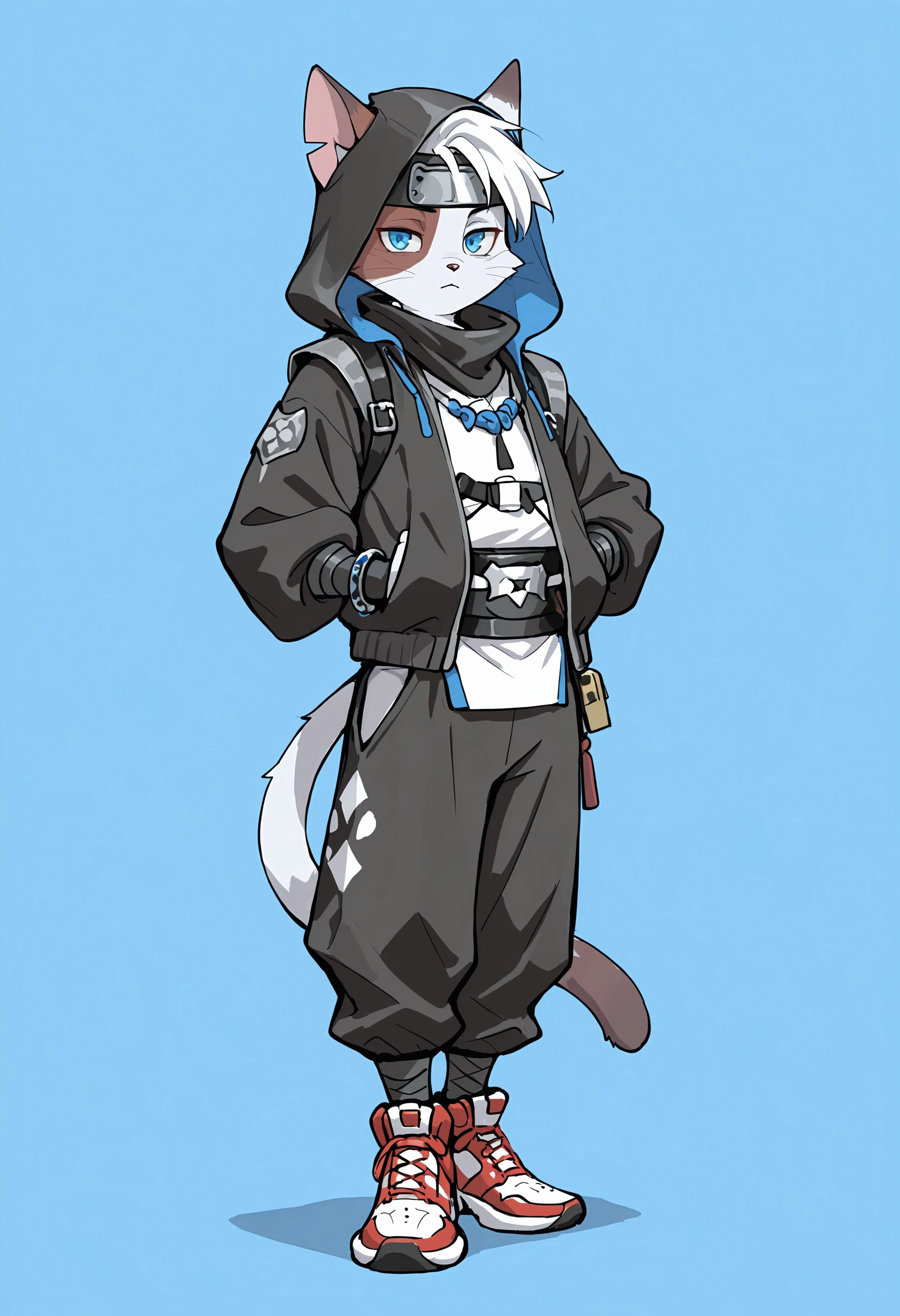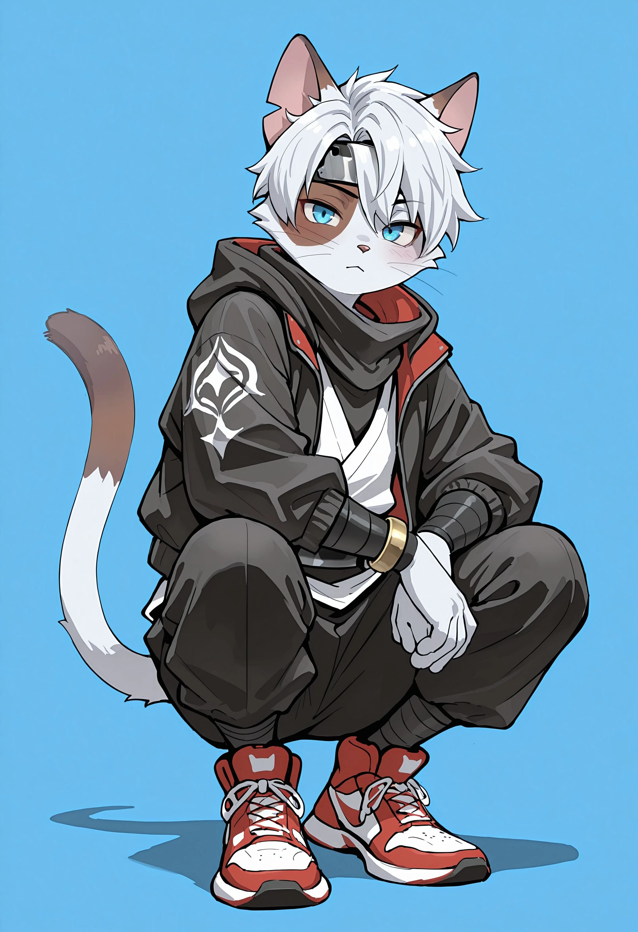 5yru5, taj_ch45e, half face red, 1boy, solo, furry, furry male, blue eyes, white hair, cat ears, tail, ninja, bracelet, black jacket, black pants, sneakers, hood down