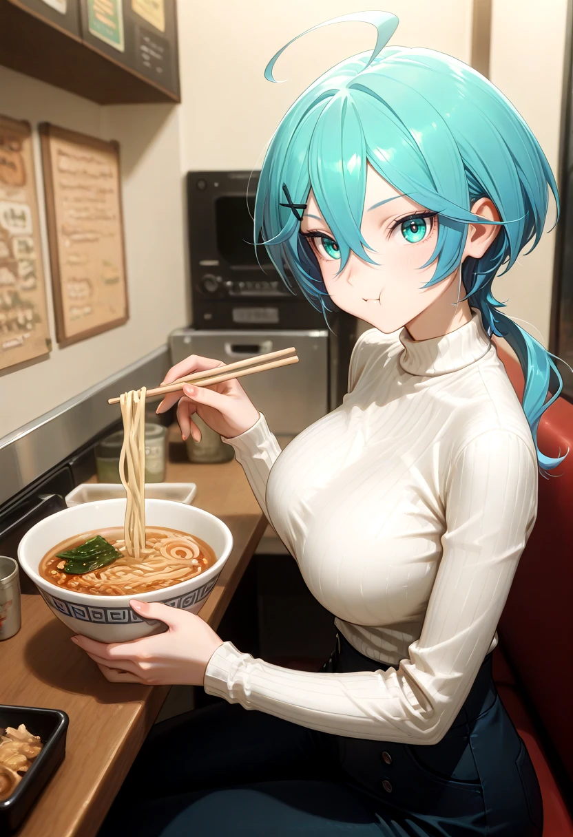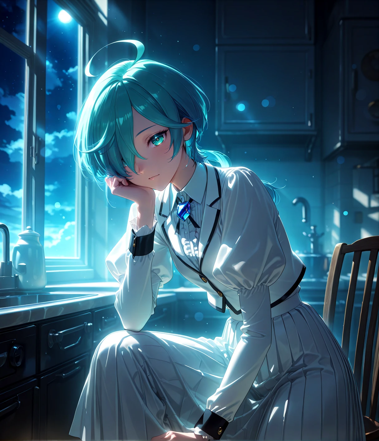 Tinschool, aqua eyes, single ahoge, aqua hair, short hair, low ponytail, side bangs, hair over one eye,small breasts, brooch, center frills, blue gem, neck ribbon, white dress, long sleeves, white jacket, puffed sleeves, buttoned cuffs, pleated dress, white pleated skirt, long skirt, black trim, black ribbon, black tights, loafers, brown shoes,