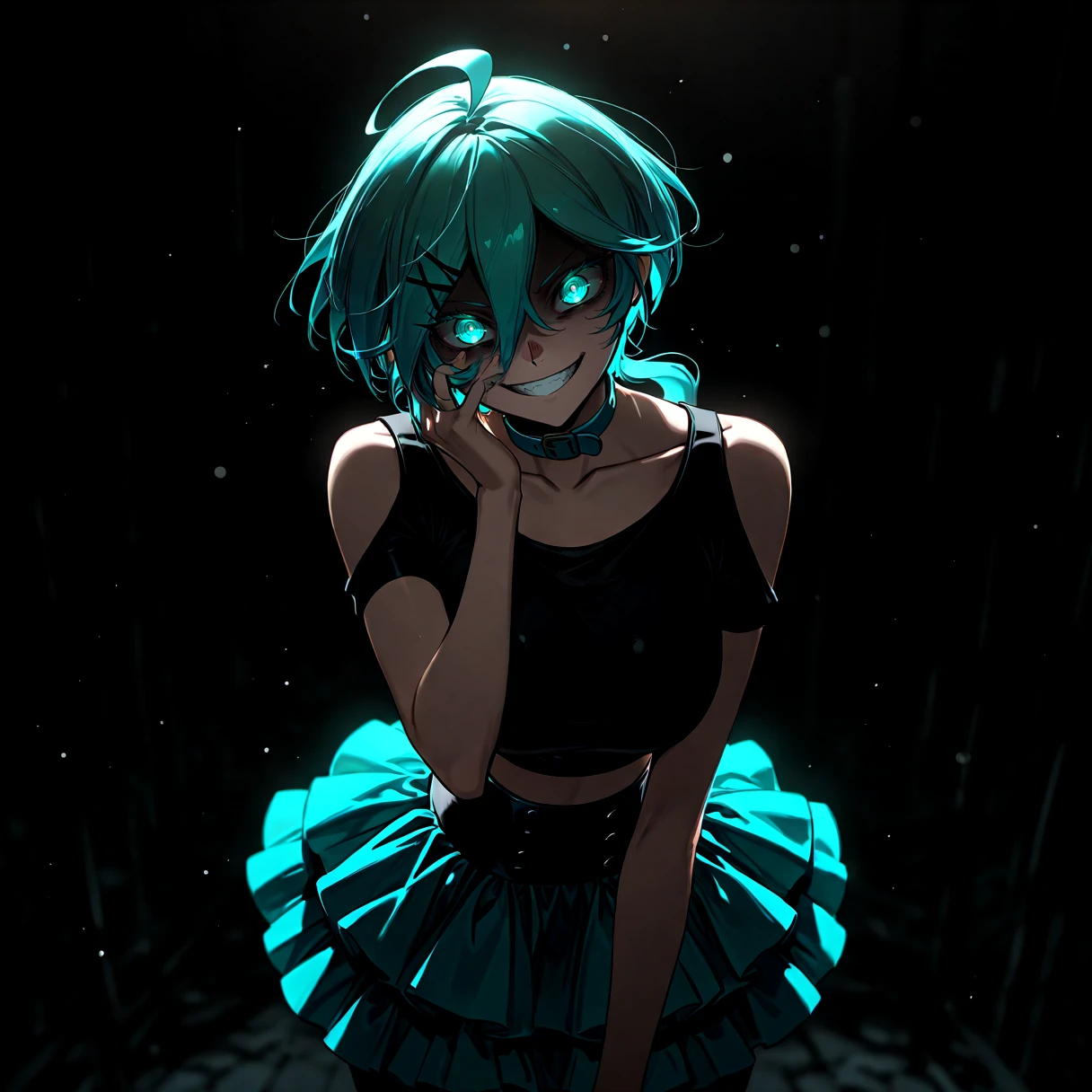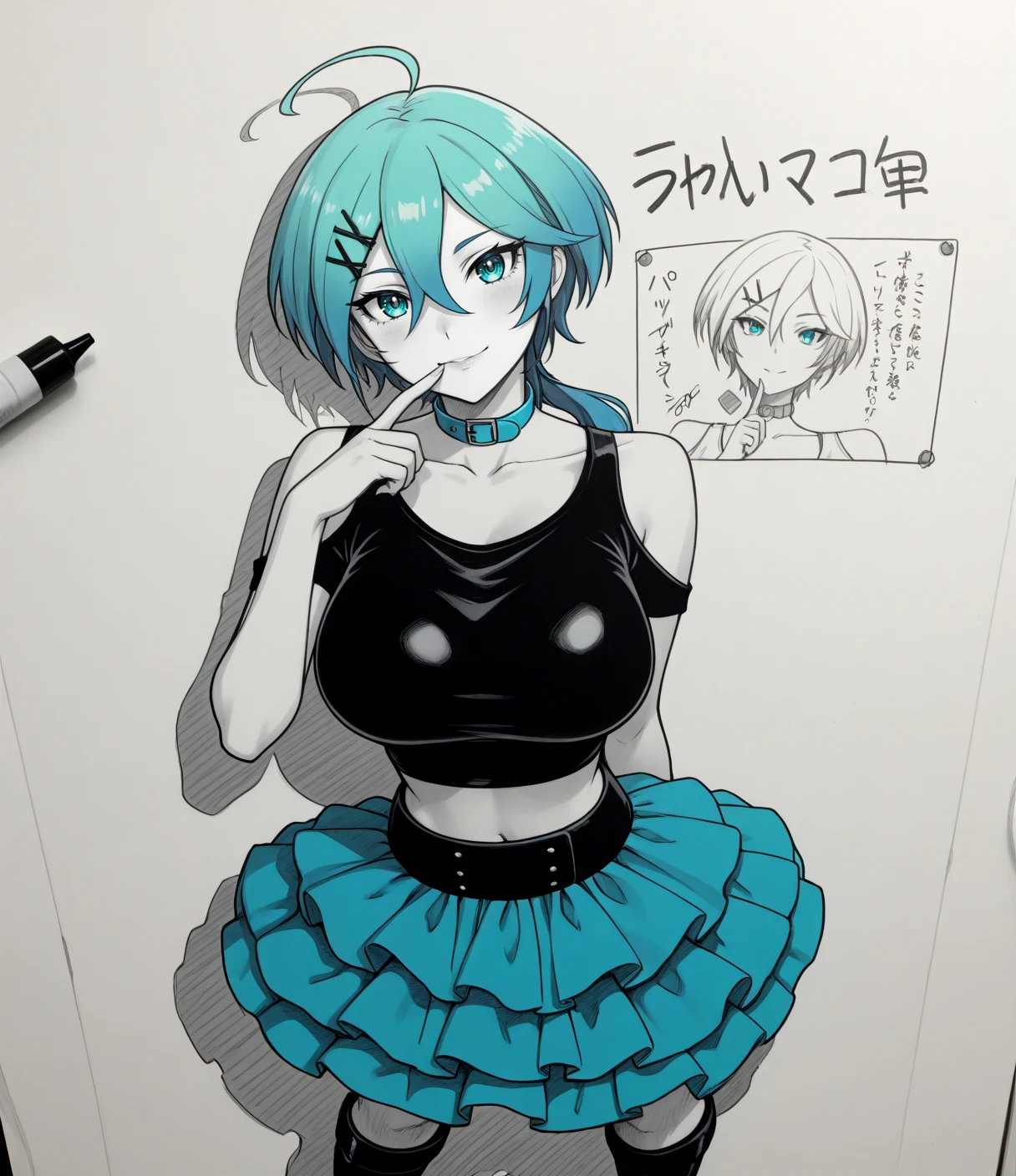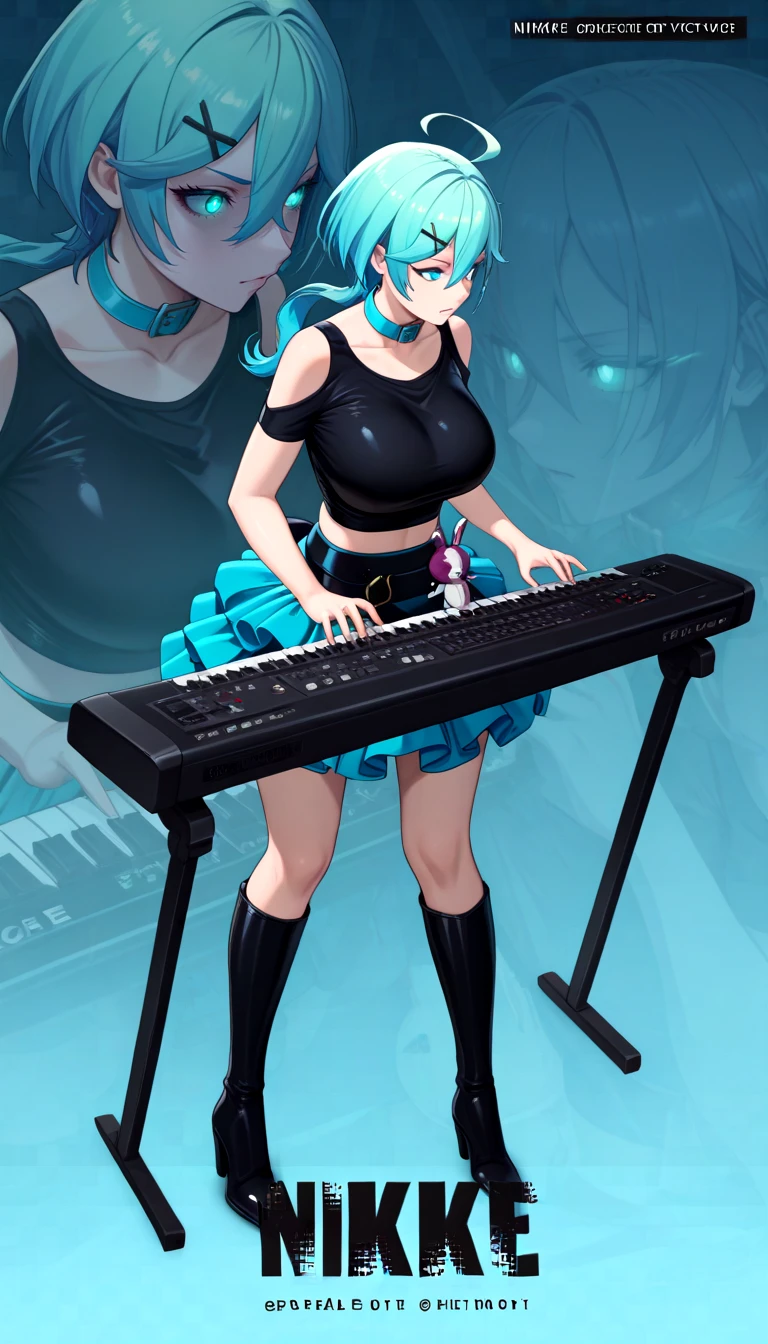 Tinkonz, aqua eyes, single ahoge, aqua hair, short hair, low ponytail, side bangs, hair between eyes, hairclip, x hairclip,large breasts, blue belt collar, black crop top, shoulder cutout, sleeveless shirt, collarbone, midriff, black waist sash, layered skirt, aqua skirt, short skirt, knee boots, high heel boots, plush toy, bunny plush,