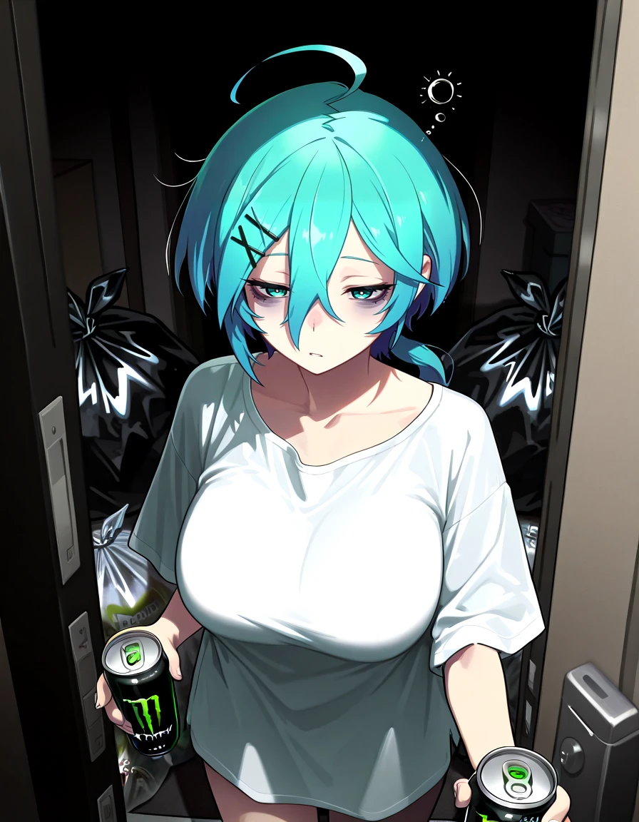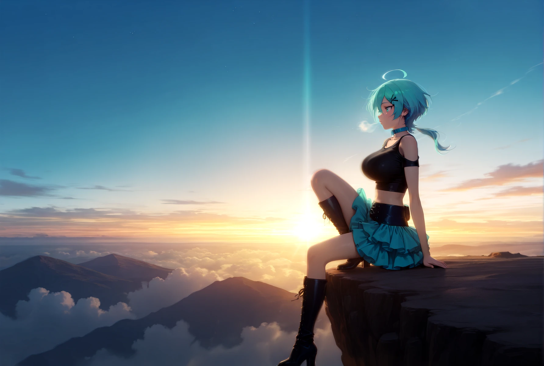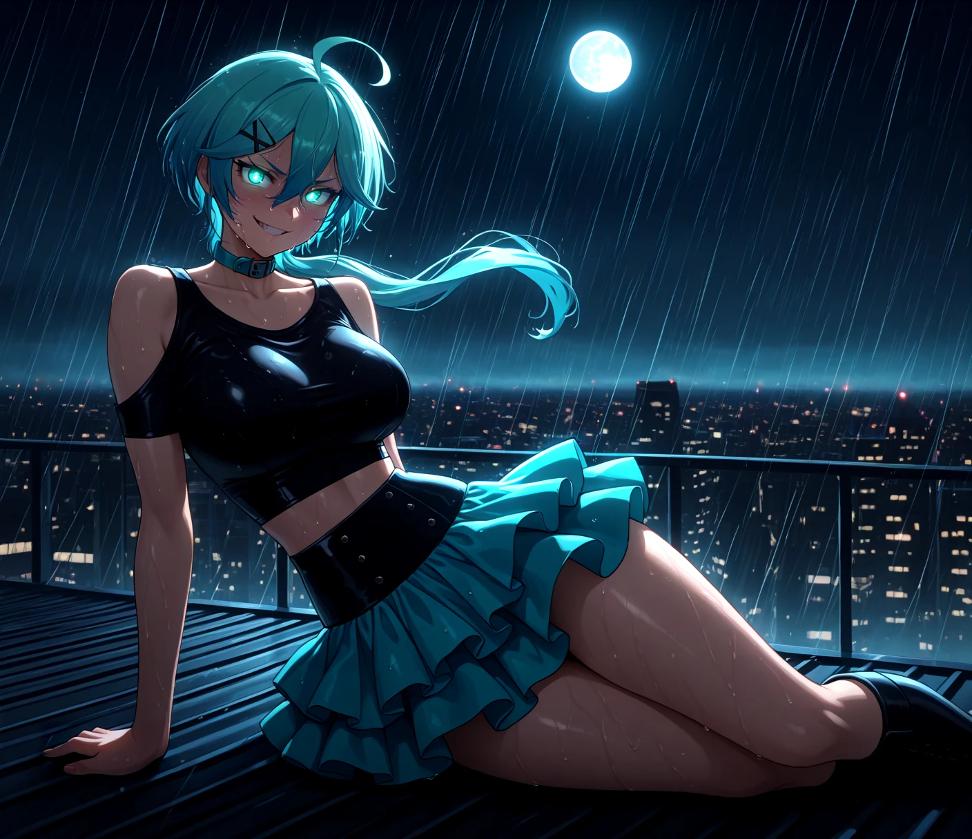 Tinkonz, aqua eyes, single ahoge, aqua hair, short hair, low ponytail, side bangs, hair between eyes, hairclip, x hairclip,large breasts, blue belt collar, black crop top, shoulder cutout, sleeveless shirt, collarbone, midriff, black waist sash, layered skirt, aqua skirt, short skirt, knee boots, high heel boots, plush toy, bunny plush,