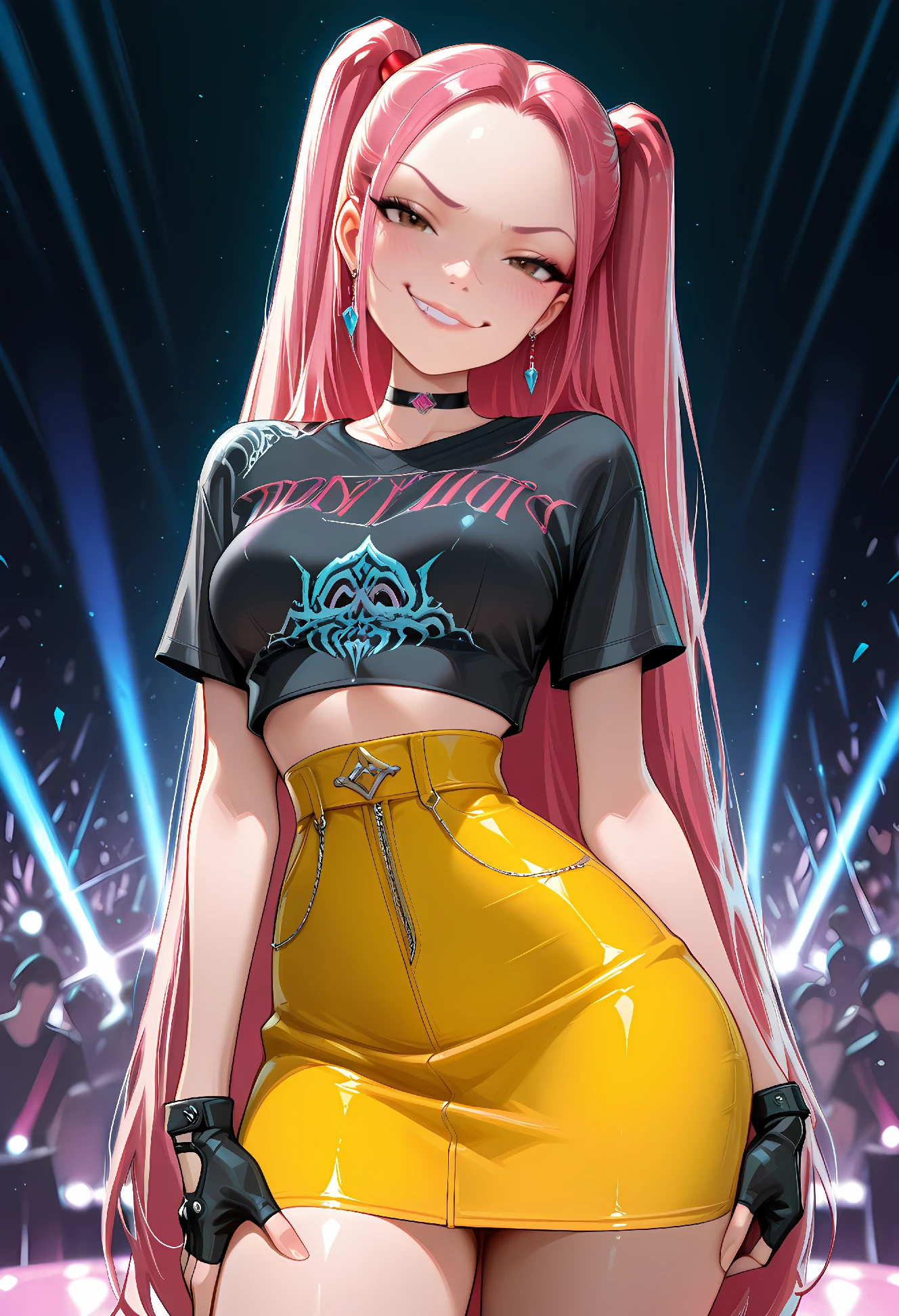 mirakpop, 1girl, solo, skirt, gloves, long hair, fingerless gloves, crop top, black gloves, dark brown eyes, choker, pink hair, jewelry, earrings, twintails, ((yellow skirt)), breasts, shirt, very long hair, high-waist skirt