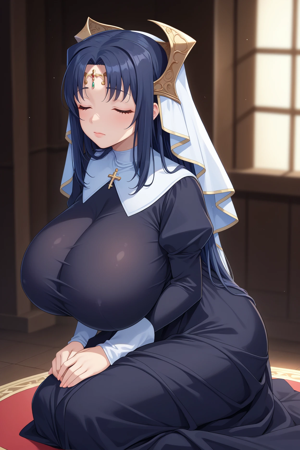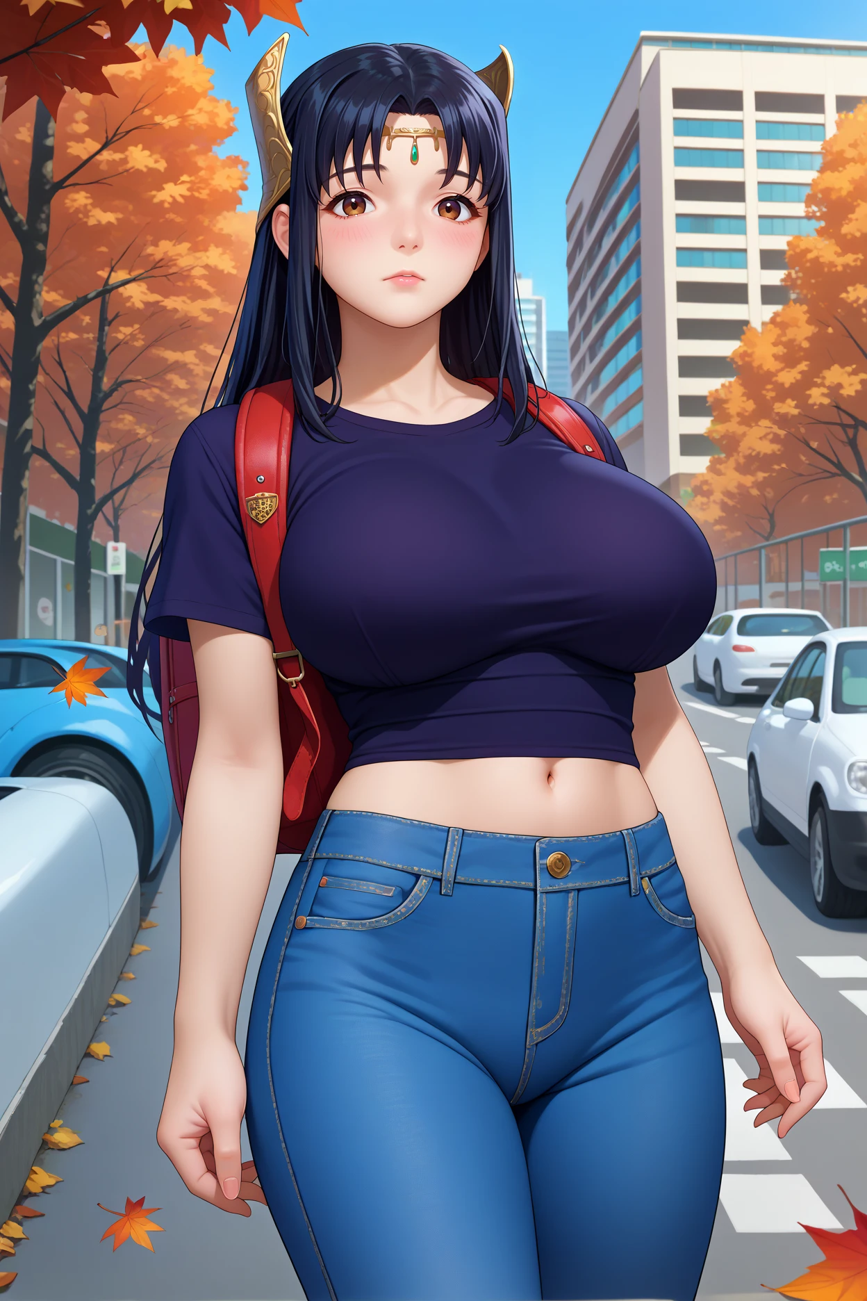 kfrxne, black hair, long hair, parted bangs, brown eyes, mole under eye, large breasts, bursting breasts