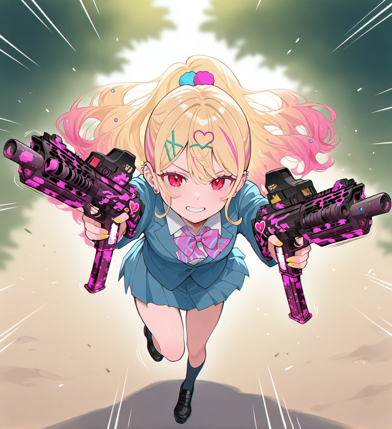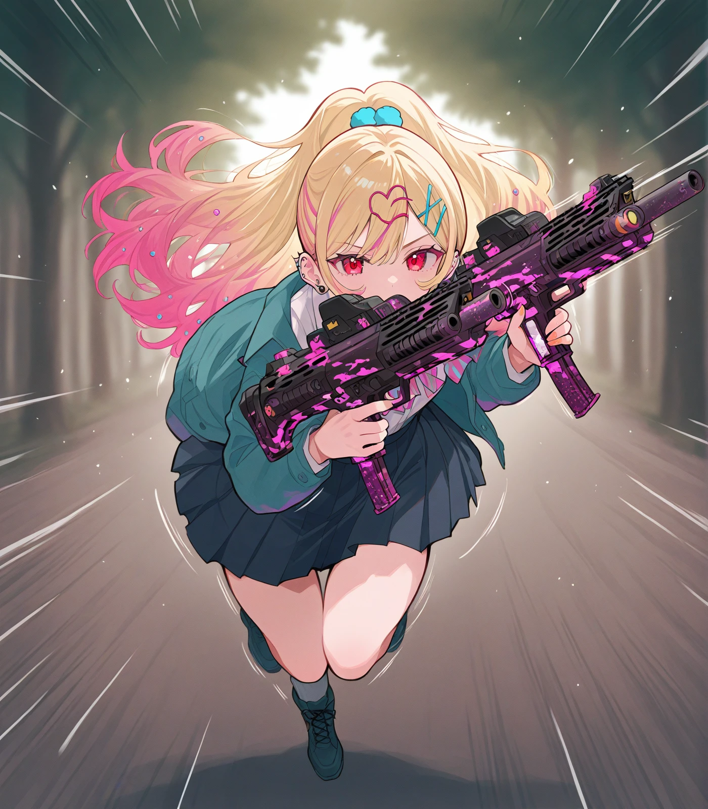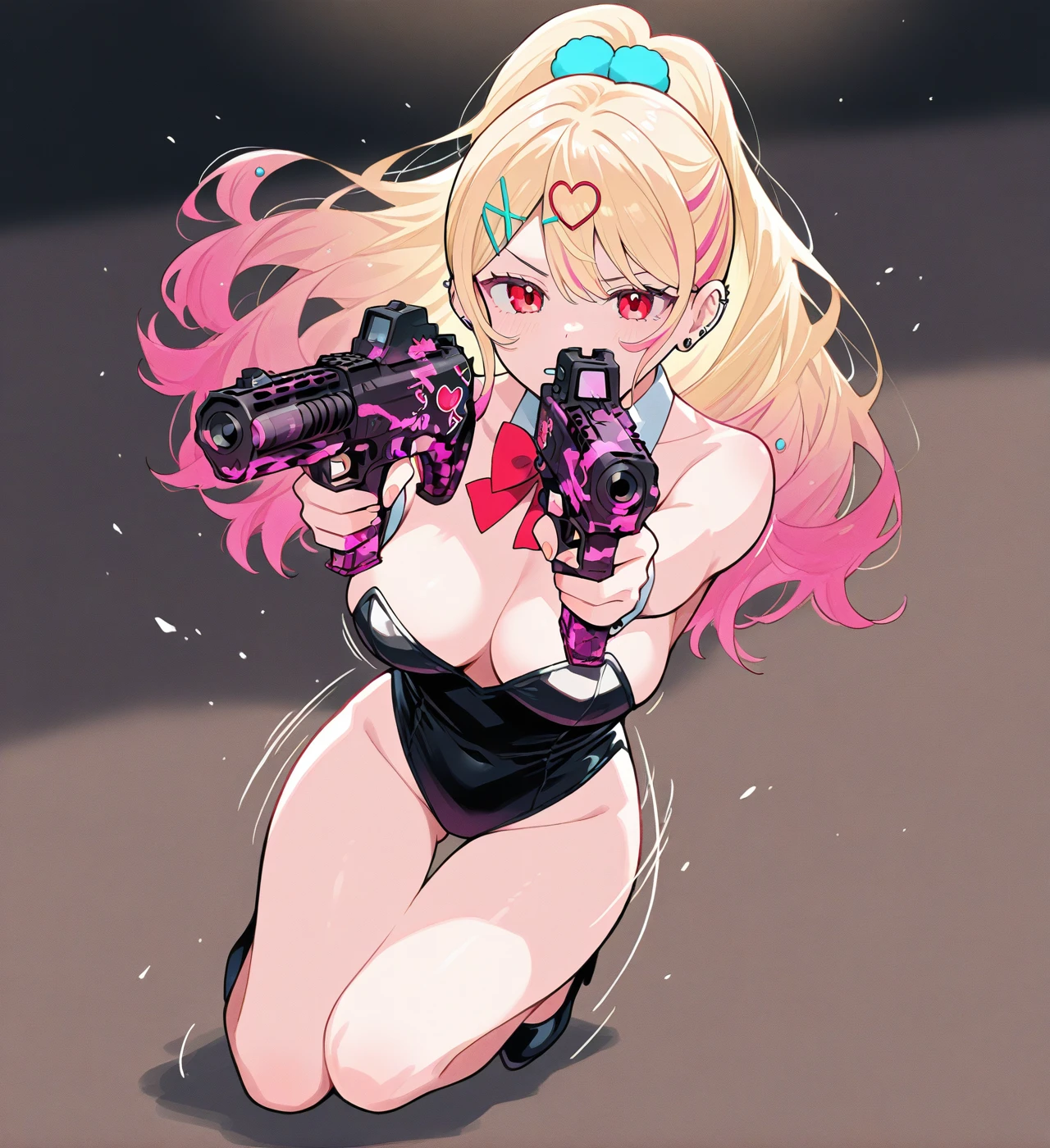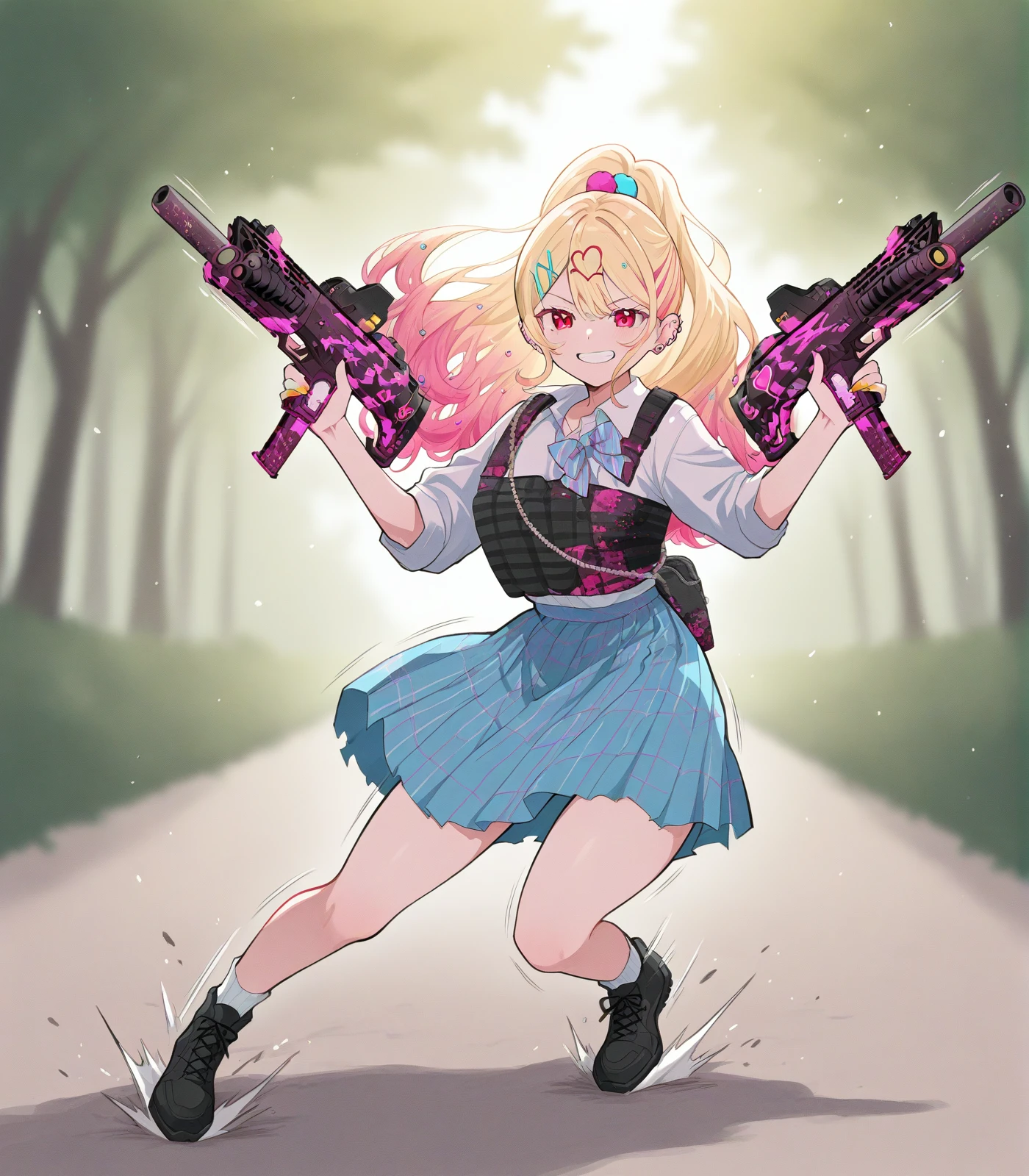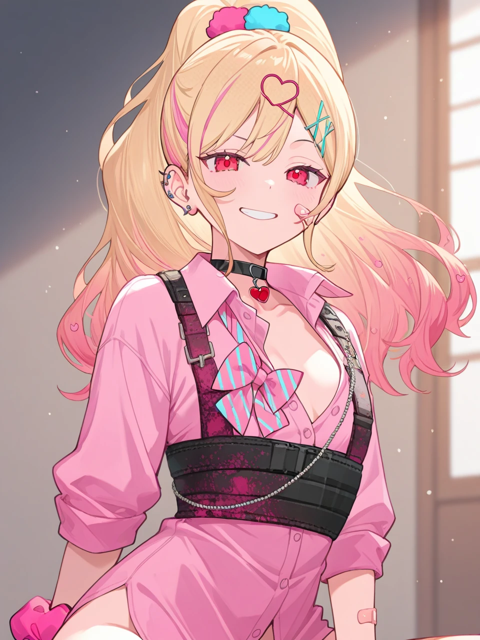 miripoyu,ear piercing,hair ornament,blonde hair,multicolored hair,medium hair,ponytail,red eyes,bandaid on cheek,choker,heart pendant,single wrist scrunchie,chest harness,pink shirt,shoulder bag,pink phone,blue clothes around waist,pink skirt,thigh strap,loose socks,black loafers,